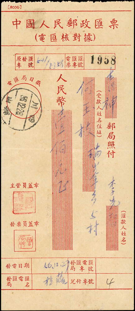 信封分類 大清郵政 1911年以前清代~國家郵政史(1082-1112)清代~商埠郵政史(1156-1158)在華客郵郵史(1168-1188)中華民國郵政 1912~1949年民國~郵政史(1424-1537)民國~名人封(1538-1547)民國~防盜(1548-1559)民國~首航封(1560-1570)民國~欠資封(1571-1574)民國~檢查封(1575-1599)民國~行動郵局/信櫃(1600-1613)兩岸通郵史(1933年-1989年)(1614-1632)民國~郵政匯兌(1633-1644)民國~民信局/僑批(1645-1651)民國~郵政明信片(1652-1659)民國~風景明信片(1660-1683)民國~國內及國際航空郵簡(1684-1703)日偽政權~郵政史(1714-1723)台灣 1888~2020年台灣~整批/整冊信封(3554-3583)日治時期~台灣郵史1895~1945(3601-3661)日治時期~台灣明信片(3662-3688)日治時期~台灣風景片(3689-3695)台灣老台幣時期~國父像火炬圖『限臺灣省用』明信片(3738-3739)台灣~老台幣時期郵政史1945~1949(3740-3815)台灣~自動化實寄封(4646-4647)台灣~新台幣時期郵政史(6001-6041)大陳島(6042)台灣~代辦所/欠資/首航(6043-6055)台灣~郵政匯兌(6056-6073)台灣~首日封(6074-6090)台灣~郵資封/郵政明信片(6091-6100)台灣~原圖卡(6101-6113)台灣~國內及國際航空郵簡(6114-6122)中國人民郵政 1949~2018年新中國~解放區郵史(6128-6140)新中國~郵政史(6277-6289)新中國~郵政匯兌/郵資封片(6290-6304)中國香港~郵政史(6314-6316)世界各國郵票日本郵政史(6327-6334)外國信封(A~Z)(6350-6365) 大清郵政 1911年以前 ↳清代~國家郵政史(1082-1112) ↳清代~商埠郵政史(1156-1158) ↳在華客郵郵史(1168-1188)中華民國郵政 1912~1949年 ↳民國~郵政史(1424-1537) ↳民國~名人封(1538-1547) ↳民國~防盜(1548-1559) ↳民國~首航封(1560-1570) ↳民國~欠資封(1571-1574) ↳民國~檢查封(1575-1599) ↳民國~行動郵局/信櫃(1600-1613) ↳兩岸通郵史(1933年-1989年)(1614-1632) ↳民國~郵政匯兌(1633-1644) ↳民國~民信局/僑批(1645-1651) ↳民國~郵政明信片(1652-1659) ↳民國~風景明信片(1660-1683) ↳民國~國內及國際航空郵簡(1684-1703) ↳日偽政權~郵政史(1714-1723)台灣 1888~2020年 ↳台灣~整批/整冊信封(3554-3583) ↳日治時期~台灣郵史1895~1945(3601-3661) ↳日治時期~台灣明信片(3662-3688) ↳日治時期~台灣風景片(3689-3695) ↳台灣老台幣時期~國父像火炬圖『限臺灣省用』明信片(3738-3739) ↳台灣~老台幣時期郵政史1945~1949(3740-3815) ↳台灣~自動化實寄封(4646-4647) ↳台灣~新台幣時期郵政史(6001-6041) ↳大陳島(6042) ↳台灣~代辦所/欠資/首航(6043-6055) ↳台灣~郵政匯兌(6056-6073) ↳台灣~首日封(6074-6090) ↳台灣~郵資封/郵政明信片(6091-6100) ↳台灣~原圖卡(6101-6113) ↳台灣~國內及國際航空郵簡(6114-6122)中國人民郵政 1949~2018年 ↳新中國~解放區郵史(6128-6140) ↳新中國~郵政史(6277-6289) ↳新中國~郵政匯兌/郵資封片(6290-6304) ↳中國香港~郵政史(6314-6316)世界各國郵票 ↳日本郵政史(6327-6334) ↳外國信封(A~Z)(6350-6365) 點大圖放大展示,點小圖切換 1956年中國人民郵政匯票(電匯核對據)一件,自西藏拉薩匯四川,電匯局銷四川樂山56.12.28,兌付局銷四川青神57.1.11(Page 138) 結標時間 2025-12-16 11:37:00 拍品編號:6292 起拍價:NT$100 當前價:NT$100 自動出價 直接出價 出價 系統將按出價級數,依序為您比(出)價至上限金額 提醒您:直接出價後不可將金額改低,只能改高,蟠龍無法降低您的出價,最高出價者無法取消出價 (查看出價說明) 得標說明:需按得標價另加10%佣金 當前加價幅度:NT$0元 (查看加價級數表) 回上頁 線上出價記錄 線上 0 人次,書面 0 人次 競價客戶 所在地 出價時間 出價金額 出價方式 問與答 目前尚無提問 我要提問 請先登入會員