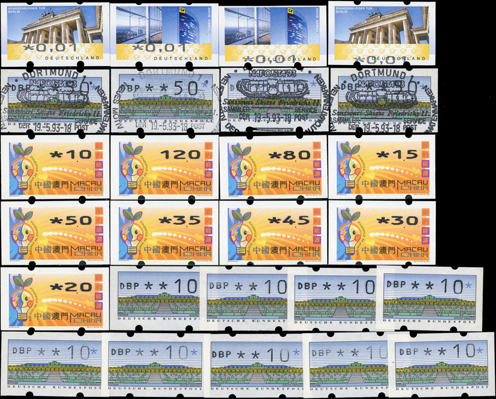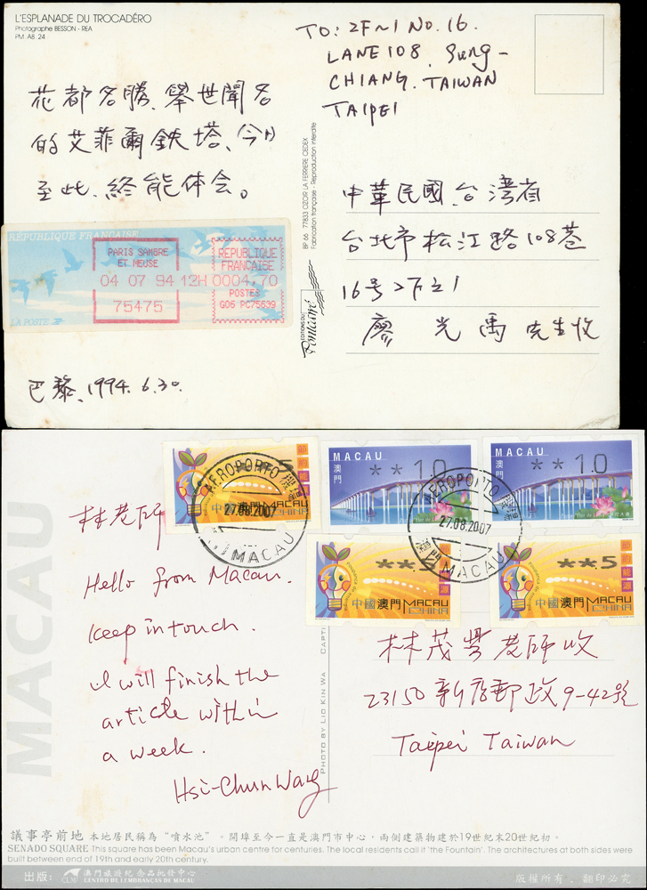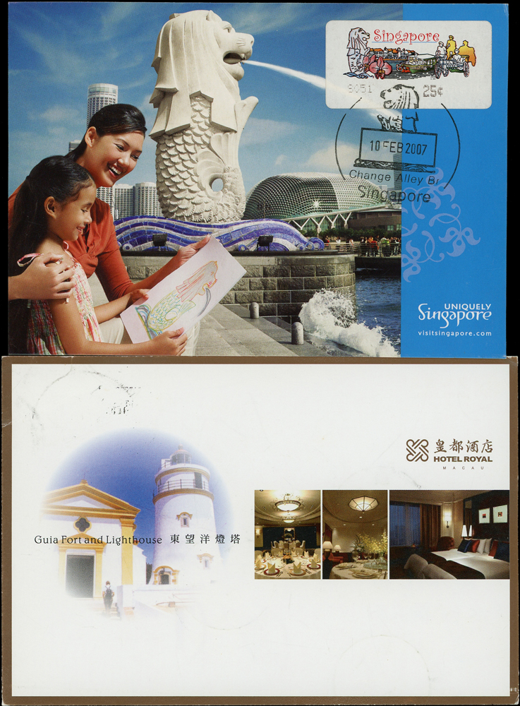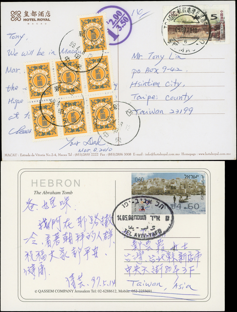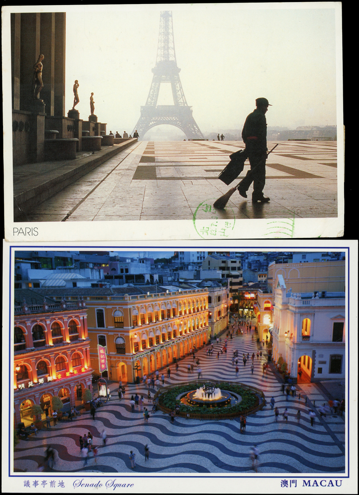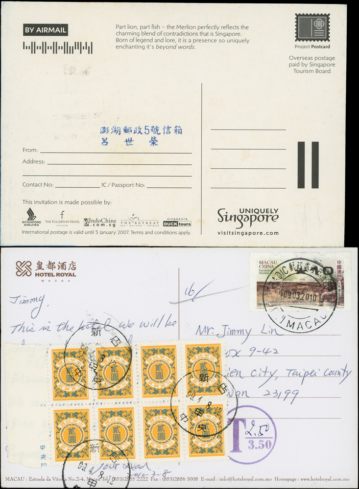 國外郵品:(1)澳門未使用郵資票:1993年郵政服務更接近你5角15枚,1999年蓮花大橋5角15枚,2002年環境保護1元~12元,共9枚;(2)德國未使用郵資票13枚,已使用4枚,首日封4封;(3)香港.澳門等國寄台灣明信片7片,含欠資2片;新加坡原圖片1片;台灣寄日本郵資片1片;贈早期台灣地圖地圖5件,一件原版,另4件為影印本;以上品像混合,VF-F;歡迎至官網瀏覽全貌;林茂興舊藏(Page 139)