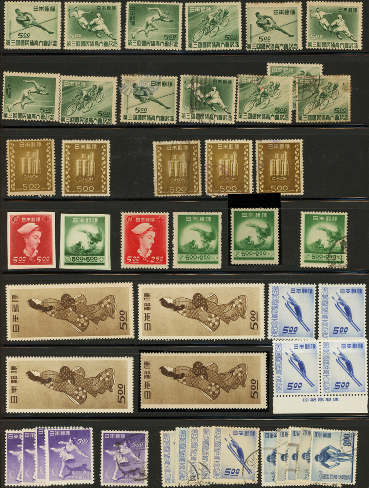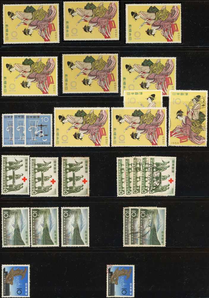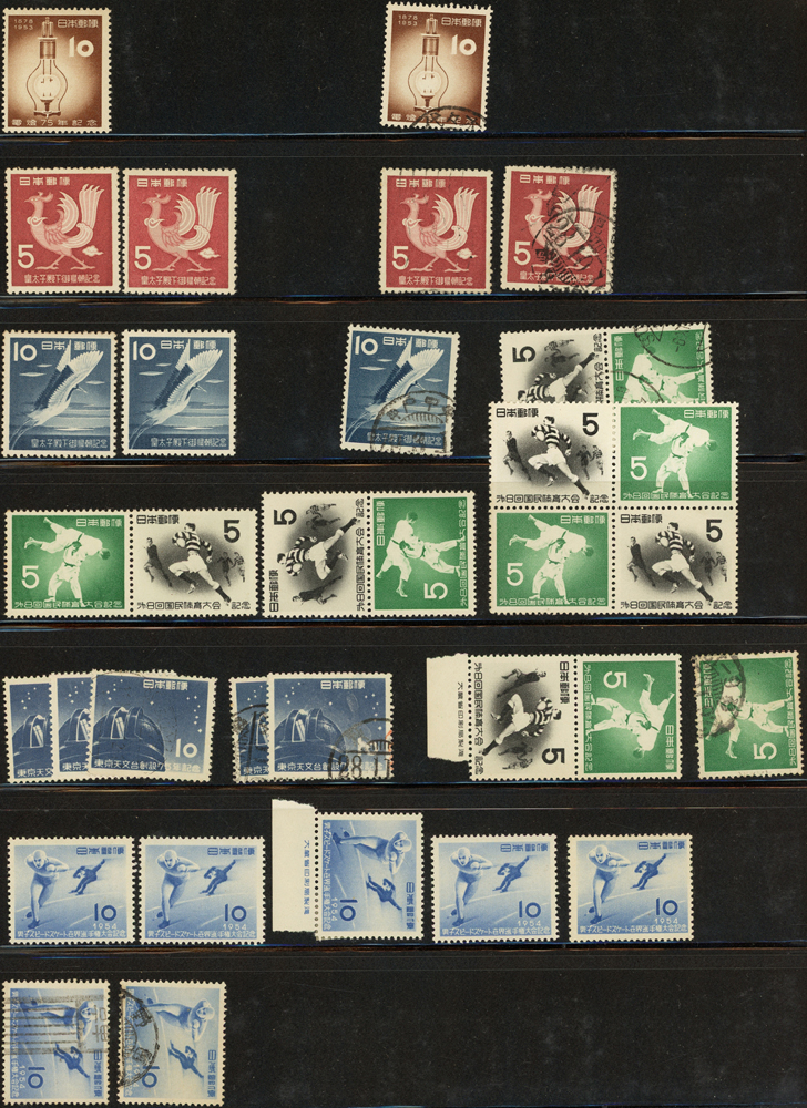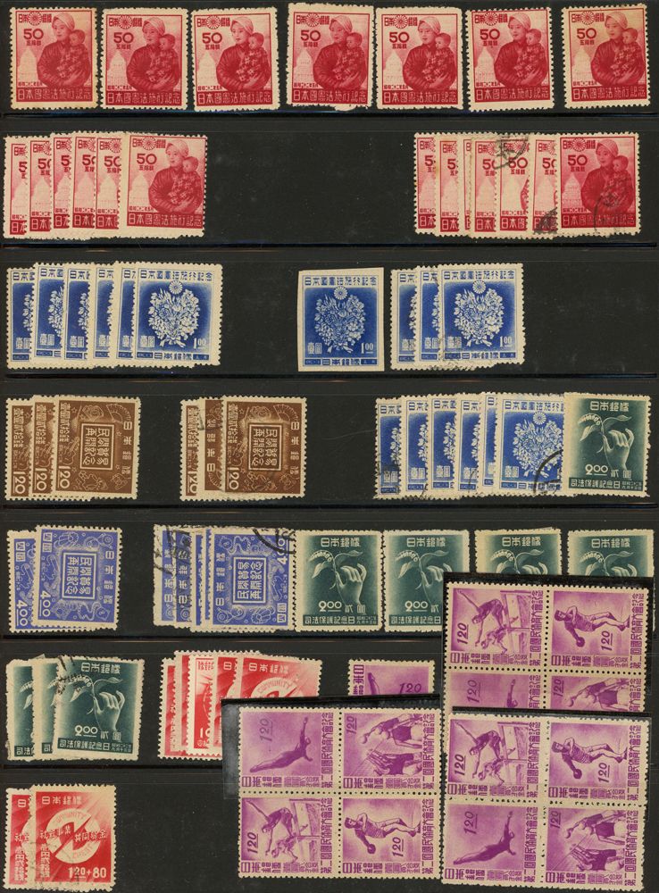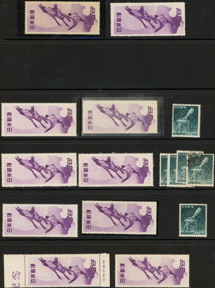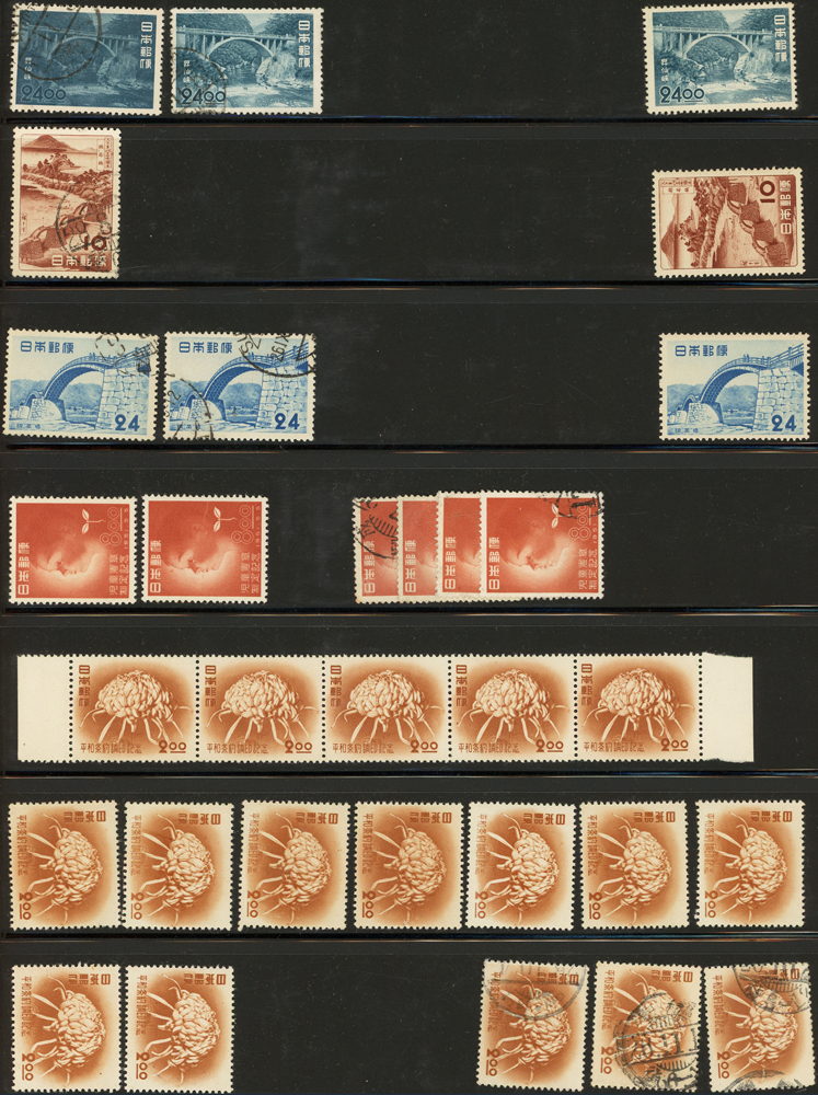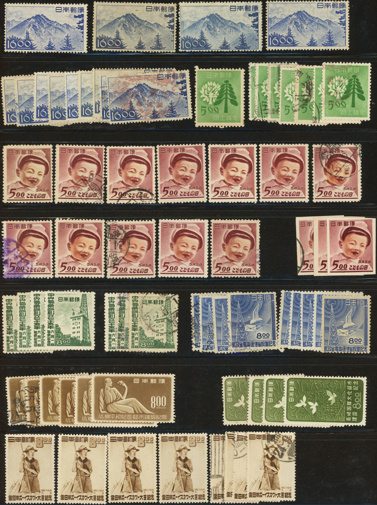 日本1899~1977年郵票5冊,含:新票3115枚,舊票2388枚,包括有:田澤型.菊票.航空切手系列.賀年切手.國立國家公園系列.國定公園系列.郵便創始75年.日本國憲法.民間貿易再開.司法保護.第二.三.四.六.七.八.九.十九回國民體育大會.共同募金.全國綠化.教育復興.見返美人.犬山博覽會.中央氣象台75年.廣島平和都市.長崎文化都市.別府觀光.岡山博覽會.萬國郵便連合75年.月雁.文化領袖系列.觀光地百選系列.平和條約.日赤創立75年.立太子禮.電燈75年.東京天文台.1955-1966年切手趣味週間.東海道電化.製鐵100年.天皇御成婚.花系列.1964年東京奧運募金.季節的行事系列.鳥系列.節慶祭系列等等,多數成套,品像混合,多重複,VF-F;總重約4公斤,歡迎至官網瀏覽全貌(Page 140)