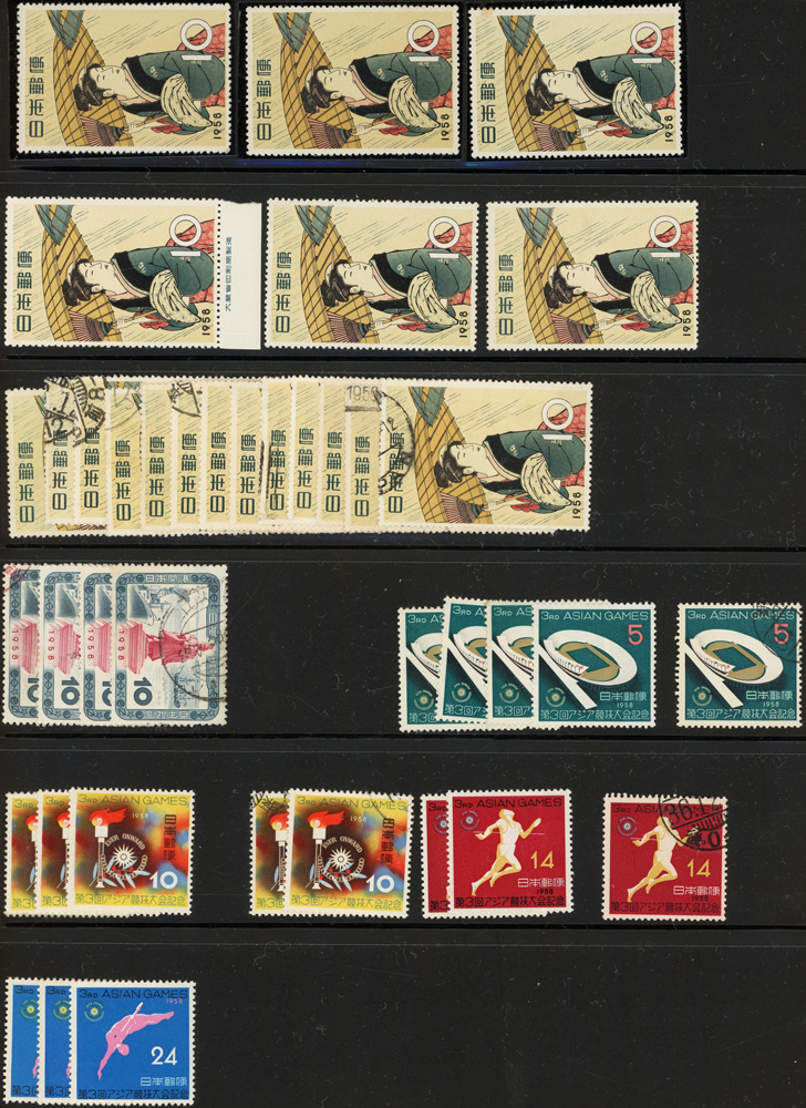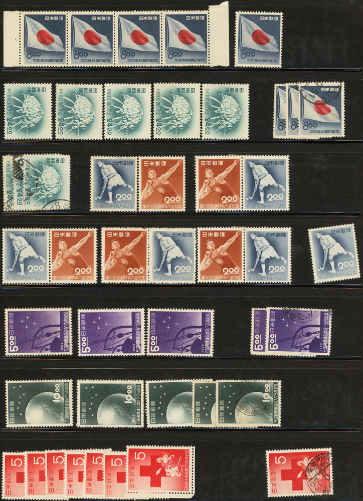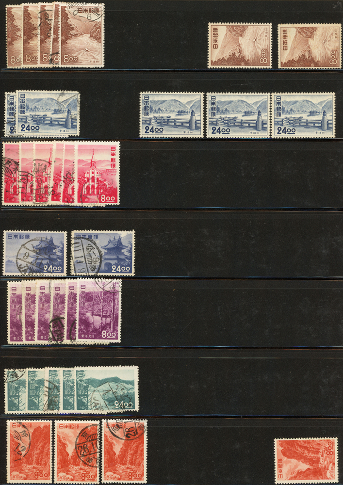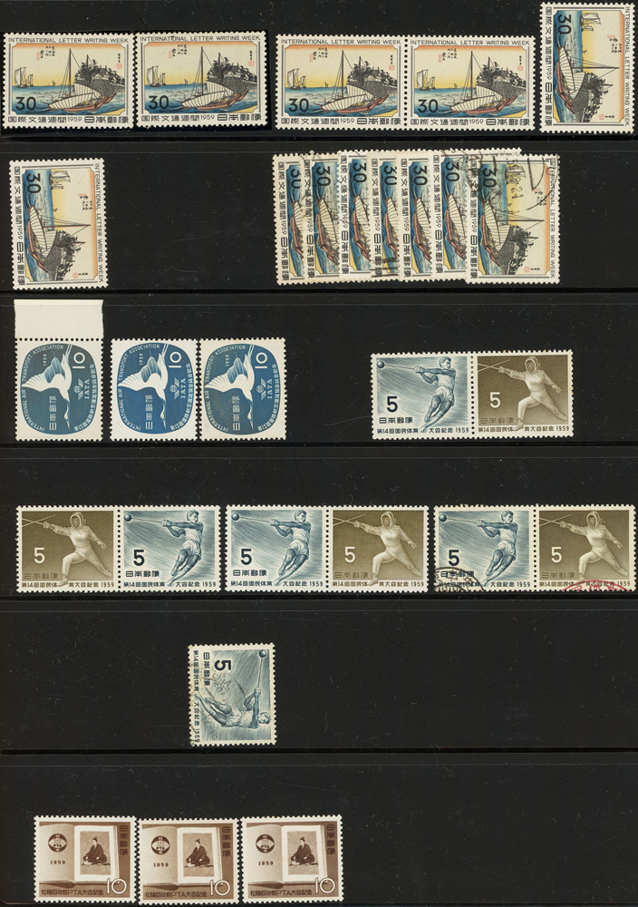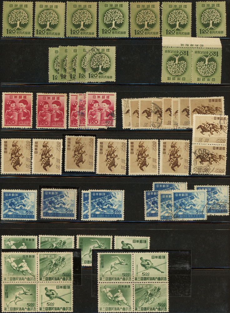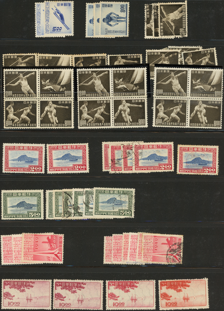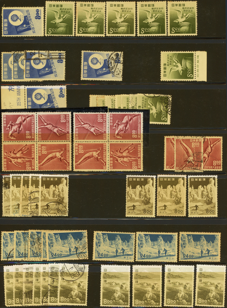 日本1899~1977年郵票5冊,含:新票3115枚,舊票2388枚,包括有:田澤型.菊票.航空切手系列.賀年切手.國立國家公園系列.國定公園系列.郵便創始75年.日本國憲法.民間貿易再開.司法保護.第二.三.四.六.七.八.九.十九回國民體育大會.共同募金.全國綠化.教育復興.見返美人.犬山博覽會.中央氣象台75年.廣島平和都市.長崎文化都市.別府觀光.岡山博覽會.萬國郵便連合75年.月雁.文化領袖系列.觀光地百選系列.平和條約.日赤創立75年.立太子禮.電燈75年.東京天文台.1955-1966年切手趣味週間.東海道電化.製鐵100年.天皇御成婚.花系列.1964年東京奧運募金.季節的行事系列.鳥系列.節慶祭系列等等,多數成套,品像混合,多重複,VF-F;總重約4公斤,歡迎至官網瀏覽全貌(Page 140)