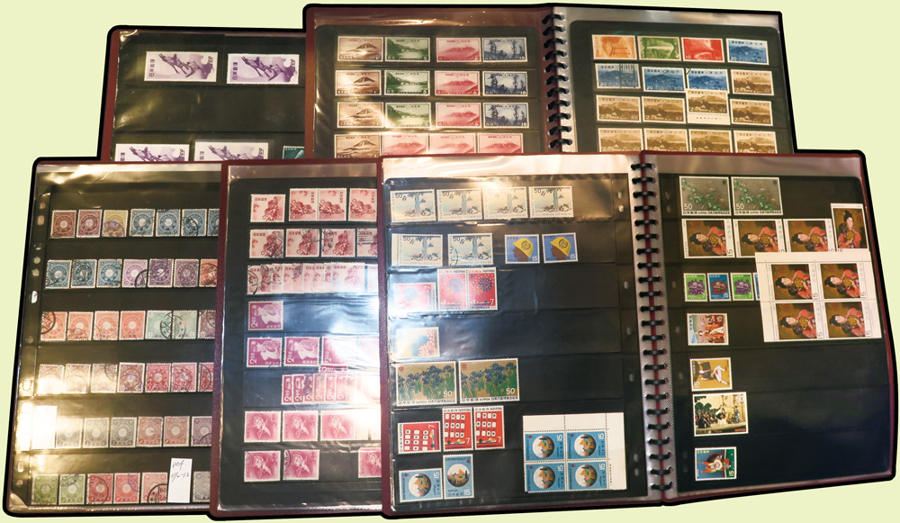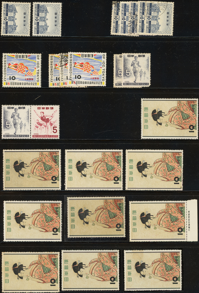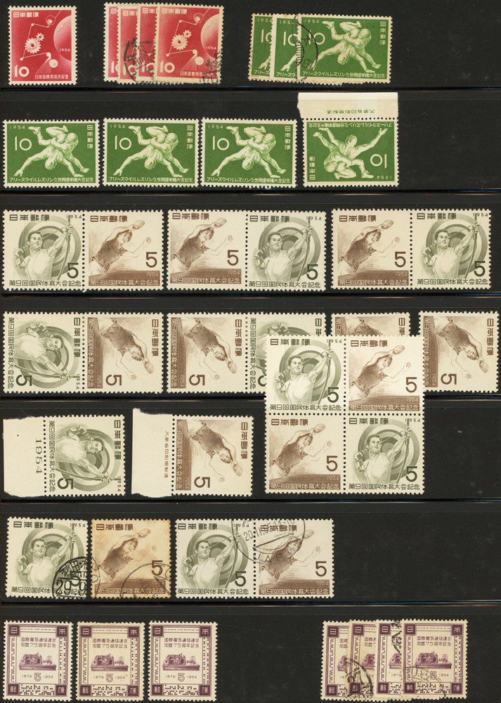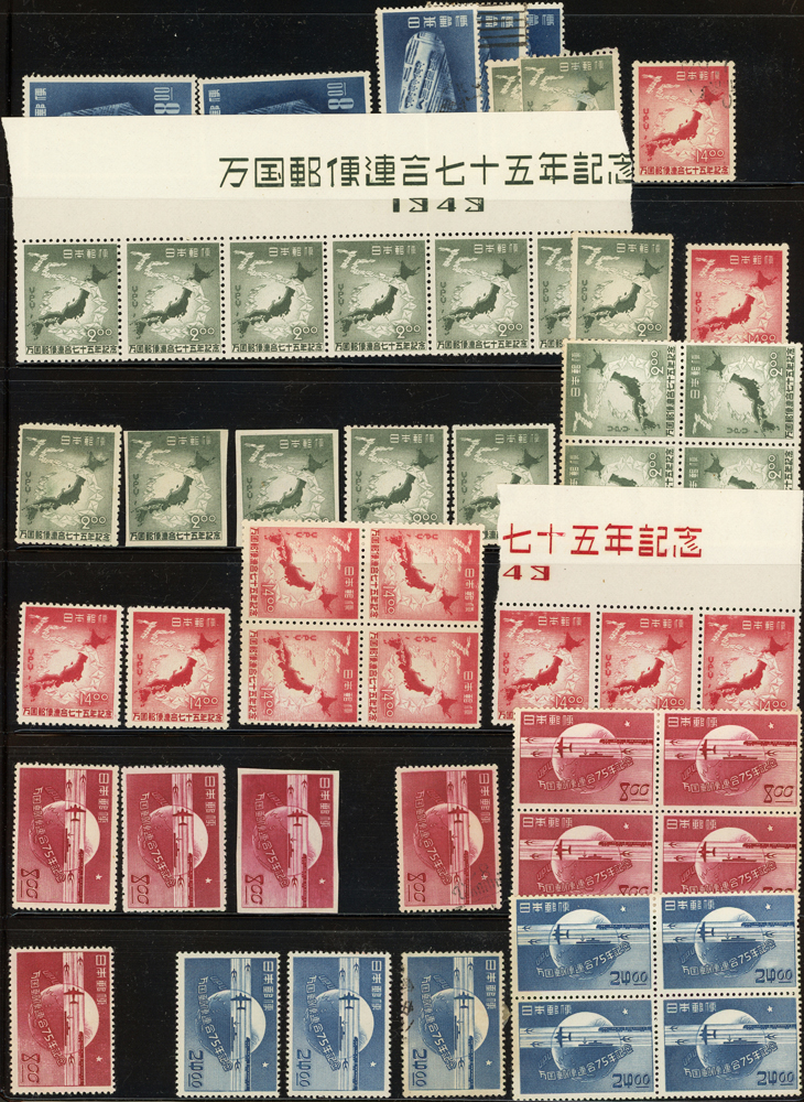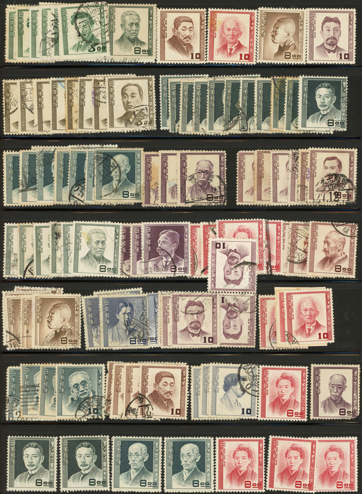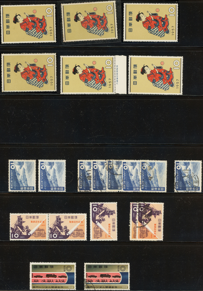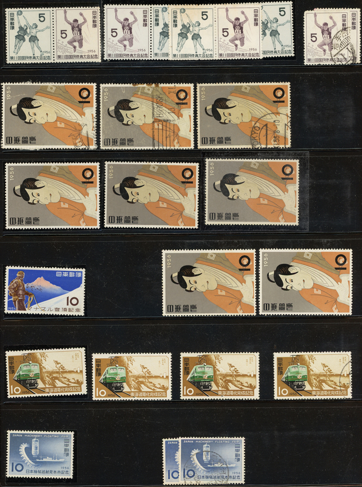 日本1899~1977年郵票5冊,含:新票3115枚,舊票2388枚,包括有:田澤型.菊票.航空切手系列.賀年切手.國立國家公園系列.國定公園系列.郵便創始75年.日本國憲法.民間貿易再開.司法保護.第二.三.四.六.七.八.九.十九回國民體育大會.共同募金.全國綠化.教育復興.見返美人.犬山博覽會.中央氣象台75年.廣島平和都市.長崎文化都市.別府觀光.岡山博覽會.萬國郵便連合75年.月雁.文化領袖系列.觀光地百選系列.平和條約.日赤創立75年.立太子禮.電燈75年.東京天文台.1955-1966年切手趣味週間.東海道電化.製鐵100年.天皇御成婚.花系列.1964年東京奧運募金.季節的行事系列.鳥系列.節慶祭系列等等,多數成套,品像混合,多重複,VF-F;總重約4公斤,歡迎至官網瀏覽全貌(Page 140)