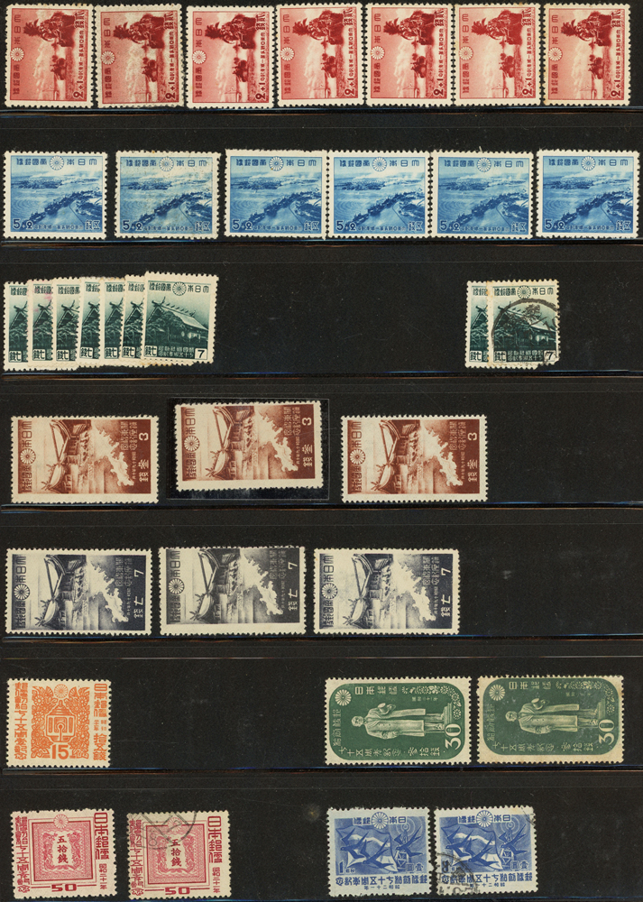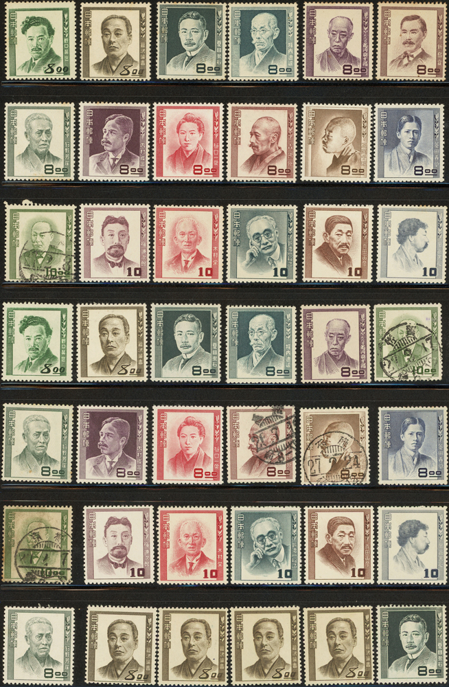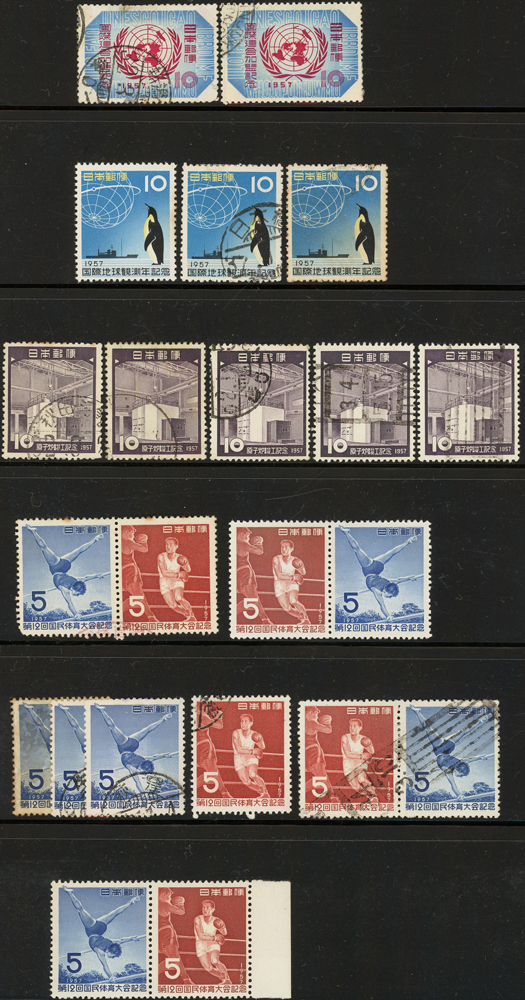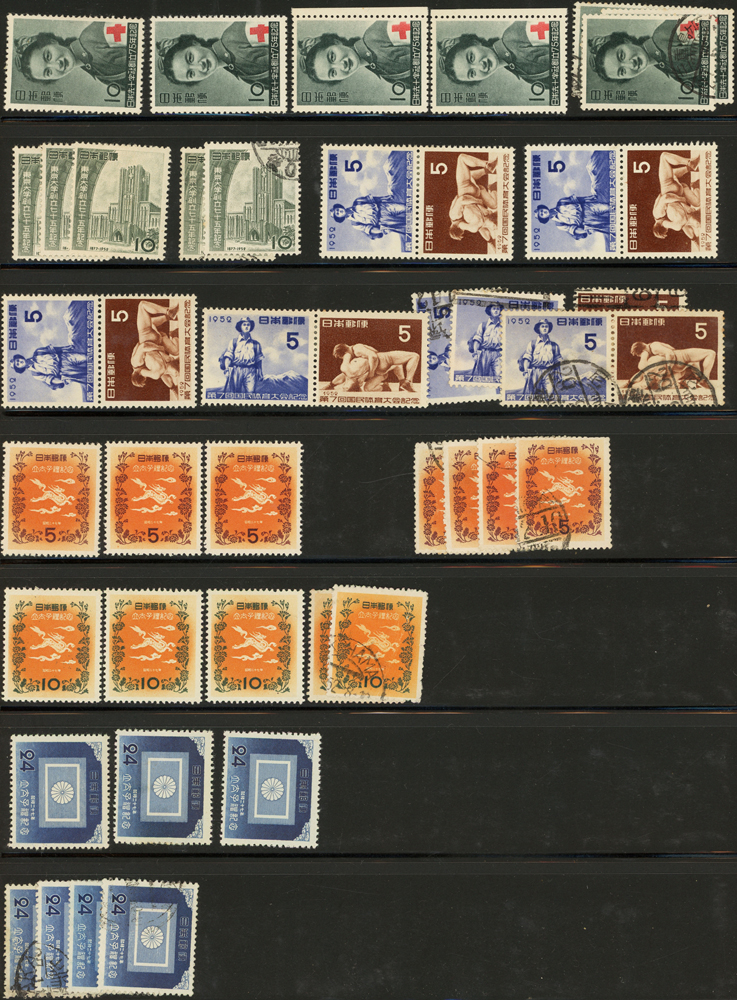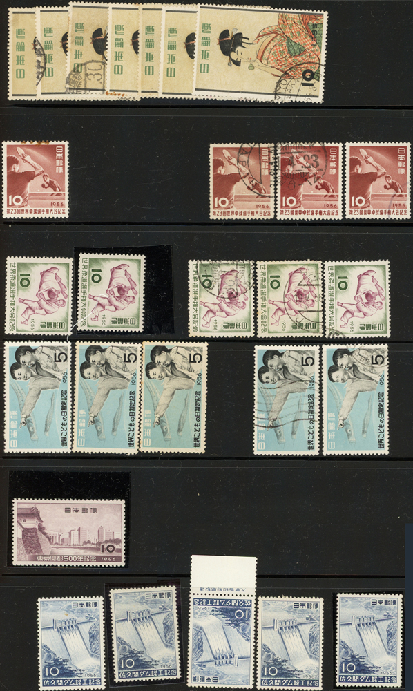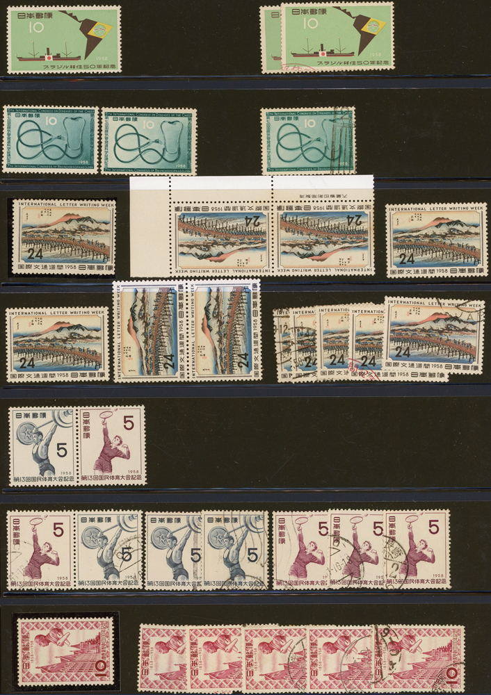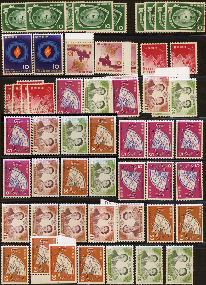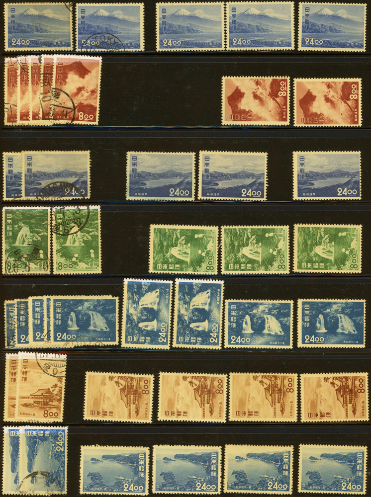 日本1899~1977年郵票5冊,含:新票3115枚,舊票2388枚,包括有:田澤型.菊票.航空切手系列.賀年切手.國立國家公園系列.國定公園系列.郵便創始75年.日本國憲法.民間貿易再開.司法保護.第二.三.四.六.七.八.九.十九回國民體育大會.共同募金.全國綠化.教育復興.見返美人.犬山博覽會.中央氣象台75年.廣島平和都市.長崎文化都市.別府觀光.岡山博覽會.萬國郵便連合75年.月雁.文化領袖系列.觀光地百選系列.平和條約.日赤創立75年.立太子禮.電燈75年.東京天文台.1955-1966年切手趣味週間.東海道電化.製鐵100年.天皇御成婚.花系列.1964年東京奧運募金.季節的行事系列.鳥系列.節慶祭系列等等,多數成套,品像混合,多重複,VF-F;總重約4公斤,歡迎至官網瀏覽全貌(Page 140)
