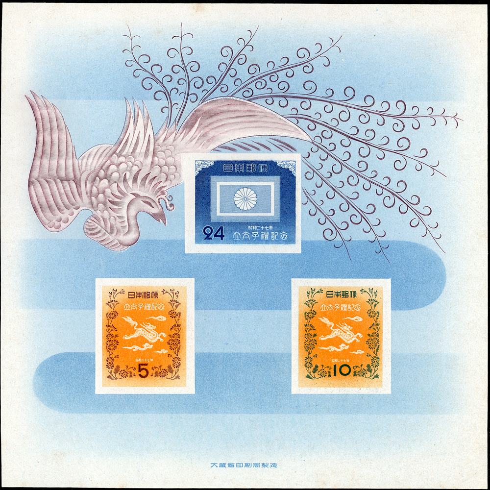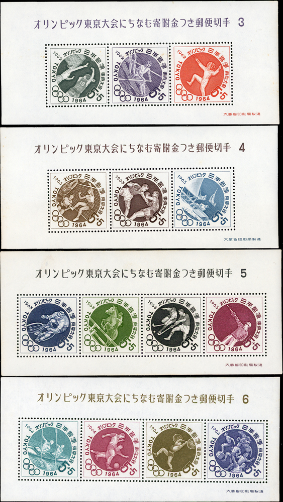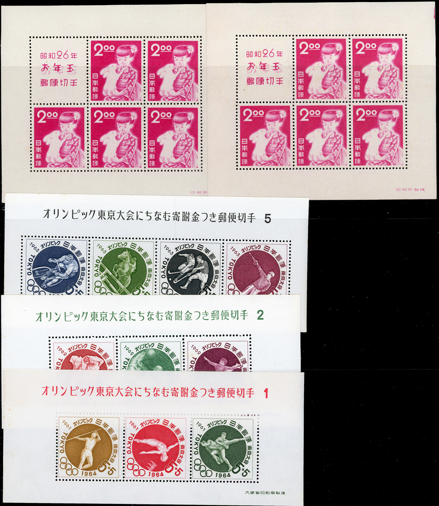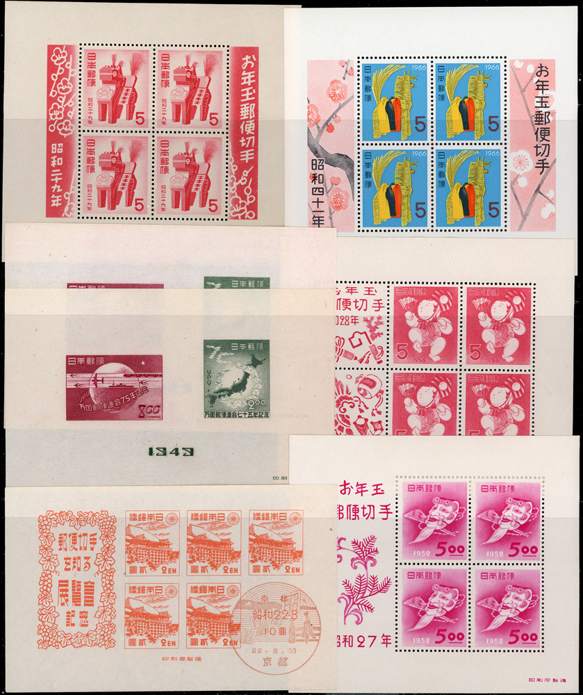 日本早期小全張17枚,含:1947年京都切手展銷紀戳1枚,其餘均為新票,包括有:1949年萬國郵便連合75年及1951年賀年切手各2枚,1952~1953年賀年切手3枚不同,1965年賀年切手1枚,1952年立太子禮1枚,1964年東京奧運募金6枚全,另多(5)1枚;品像混合,賀年切手背均勻黃,其餘局部淡黃,VF-F;歡迎至官網瀏覽全貌