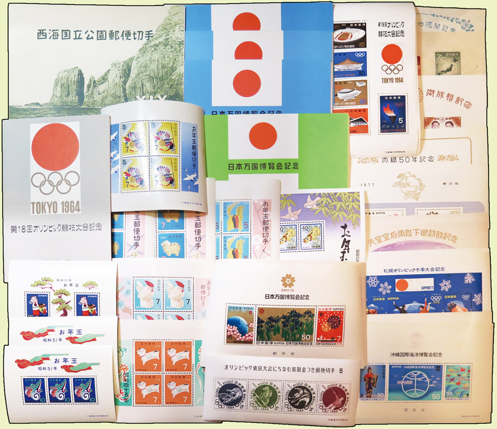 1947~1986年日本小全張38枚,包括有:昭和22年切手趣味週間.UPU七十五年.皇太子殿下御成婚紀念.西海國立公園.大婚50年紀念.萬國郵便連合加盟100年紀念.天皇皇后兩陛下御訪歐紀念.1964東京奧運.札幌冬奧.沖繩國際海洋博覽會.賀年切手(1966~1969.1978.1986).日本1970萬國博覽會等,品像混合或有重複,多數保存佳,VF-F;歡迎至官網瀏覽全貌(Page 140)
