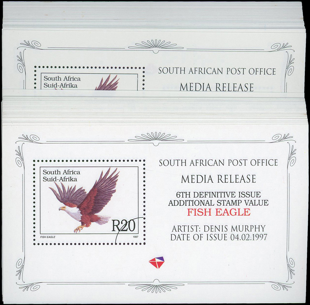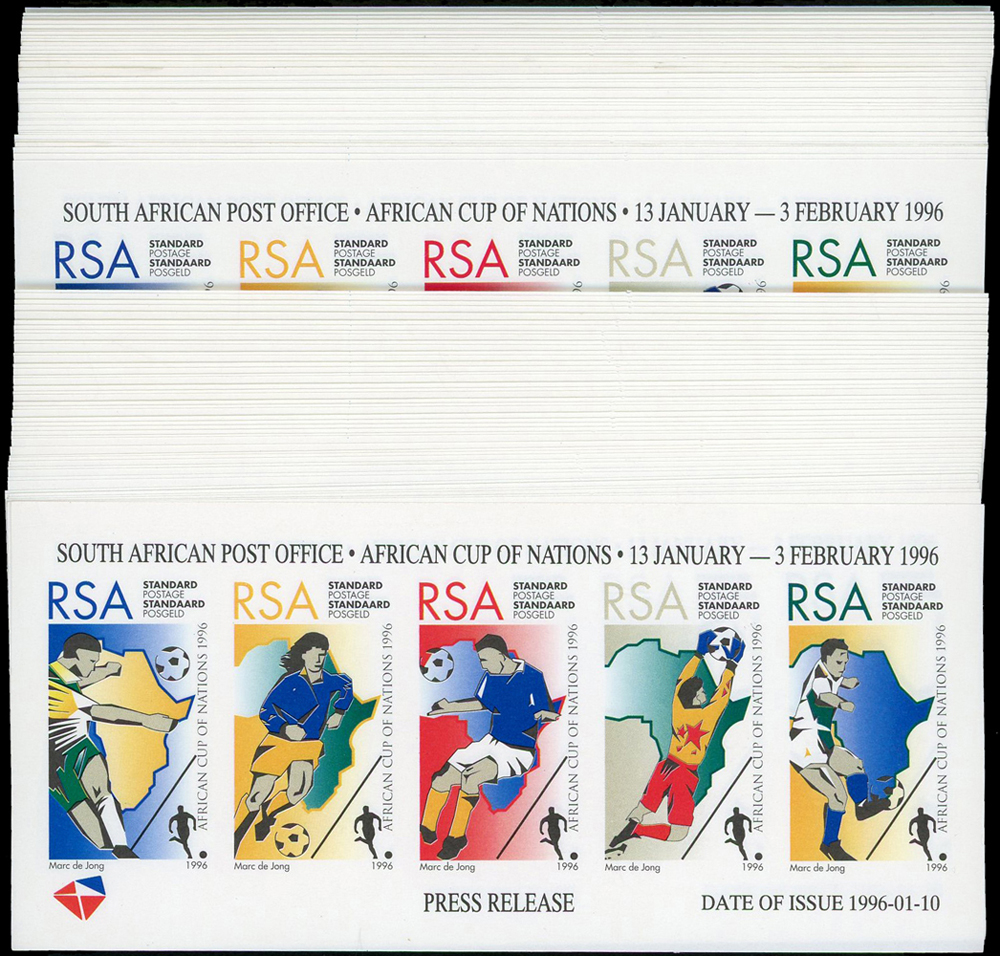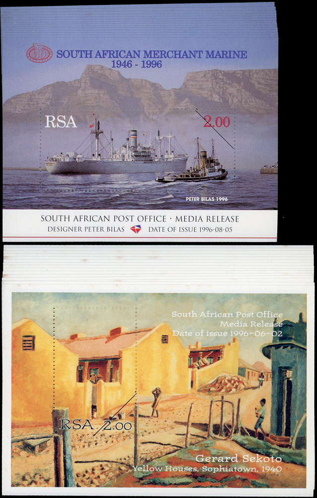 南非郵政發行紀念張,包括:1997年香港亞展紀念146枚,1996年南非商船隊50年14枚,1997年魚鷹郵票發行紀念234枚,1996年非洲國家盃足賽紀念81枚,1996年傑拉德·塞寇托畫作15枚;品像混合,少數背面有些許淡黃點,VF-F,歡迎至官網瀏覽全貌