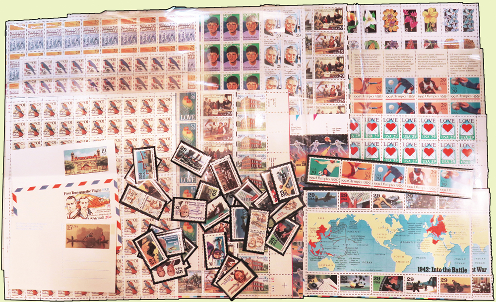 美國1991~1992年郵票,含版張16版,零票59枚,均為新票,總面值共計USD$221.65元,包括有:五十州花,二戰系列,哥倫比亞世界郵票博覽會,愛,太空探索領域合作,西奧多·馮·卡門物理學家,多蘿西·帕克作家,哥倫布的第一次航行等,品像混合或有重複,多數保存佳,VF-F;贈郵資片3片,歡迎至官網瀏覽全貌