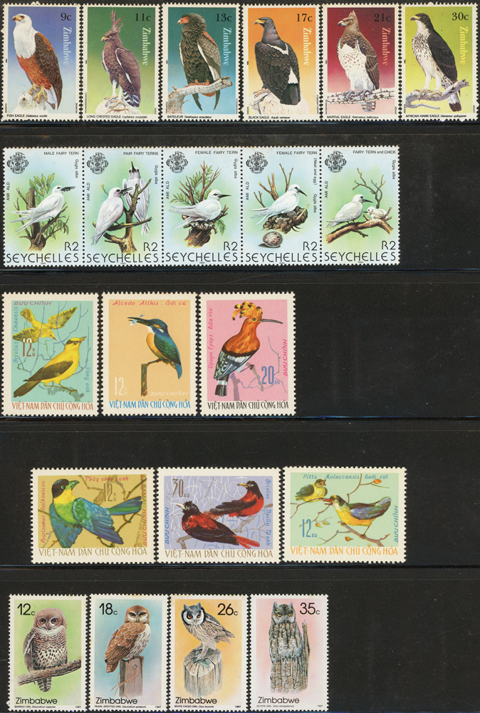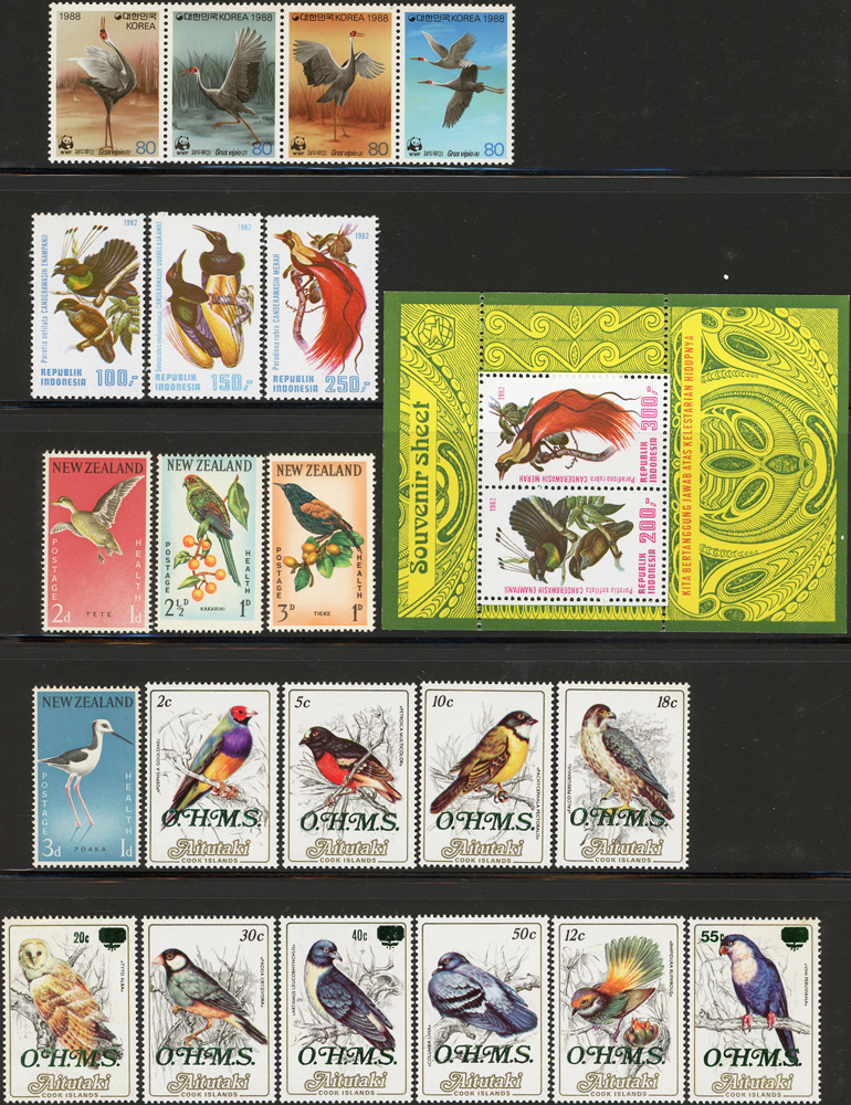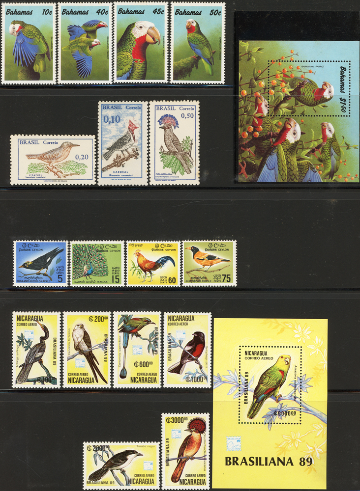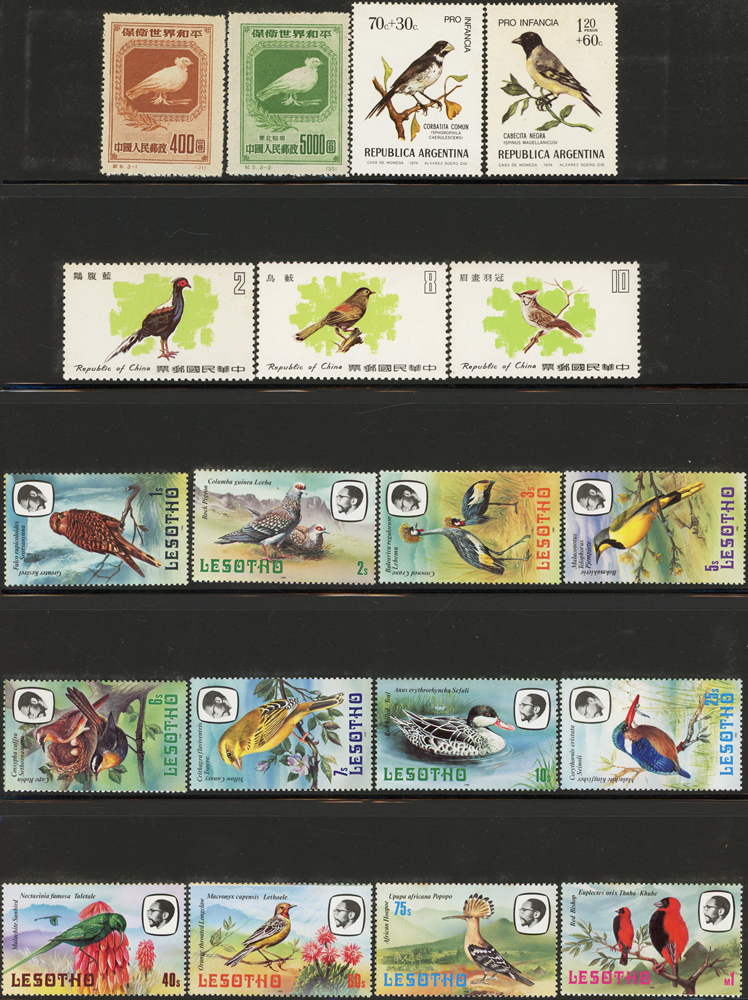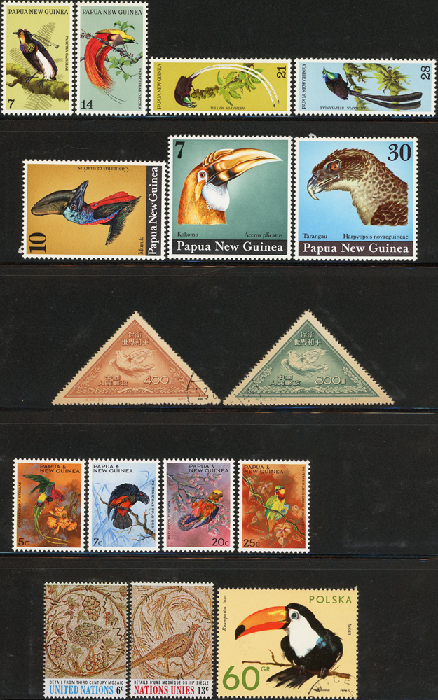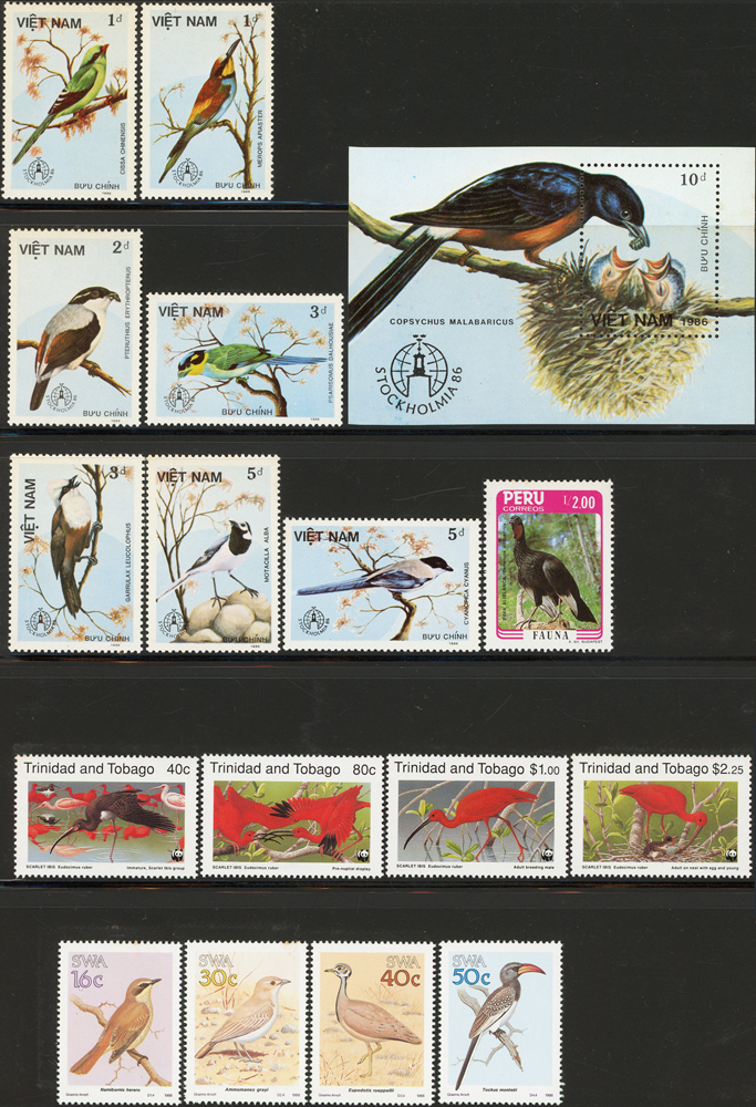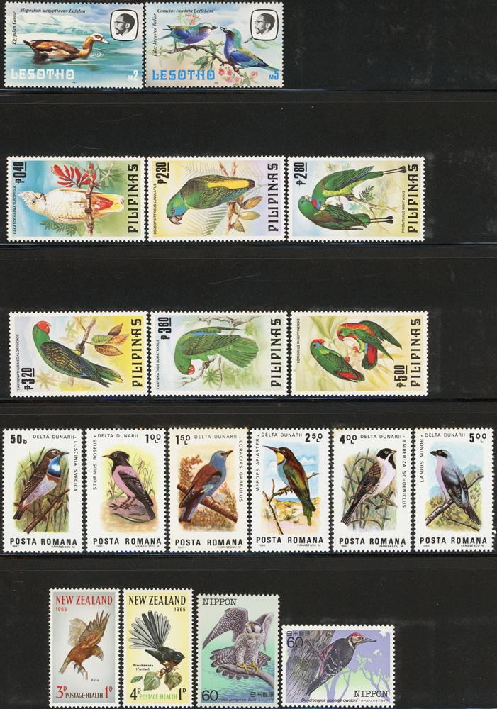 《鳥類》專題郵票小輯,含新票723枚,舊票98枚,未銷戳小全張18枚,未銷戳小版張4版,整理整齊於黑卡中,部分成套,國家包括有:美國.賴索托.羅馬.迦納.蒙古.巴拉圭.索羅門群島.史瓦濟蘭.福克蘭群島.加拿大.澳洲,紐西蘭.宏都拉斯.安圭拉.南非.格林那達.馬爾地夫.印尼.摩爾達維亞.根西島.以色列.斯洛伐克.波蘭.匈牙利.剛果.西班牙.保加利亞.馬尼亞.冰島.馬拉威.諾福克島.聖文森.安地卡及巴布達.多明尼加.蘇聯.巴哈馬.馬拉威.巴貝多.巴西.尼加拉瓜.圭亞那.韓國.台灣.巴布亞紐幾內亞.馬來西亞,越南.羅德西亞.中國.日本.牙買加.模里西斯.阿根廷.新加坡.萬那杜.辛巴威等等,少數為方連,多數不重複,品像混合,VF-F;歡迎至官網瀏覽全貌(Page 141)