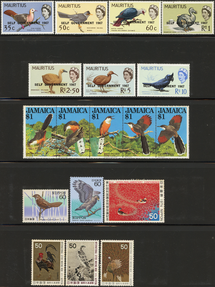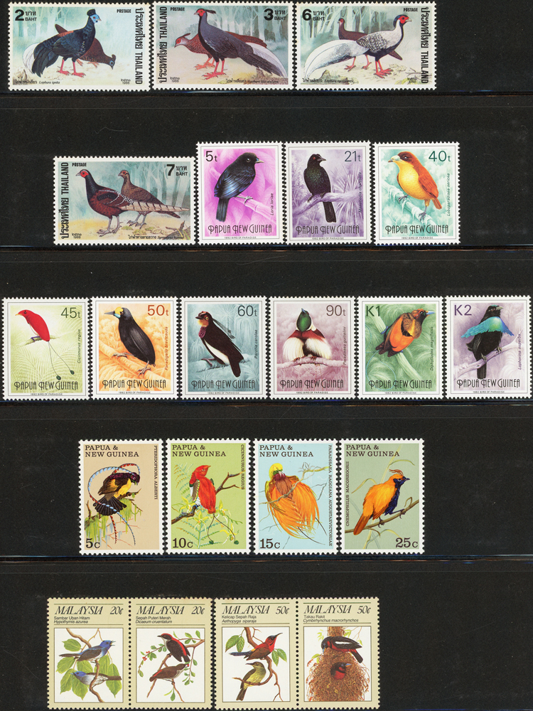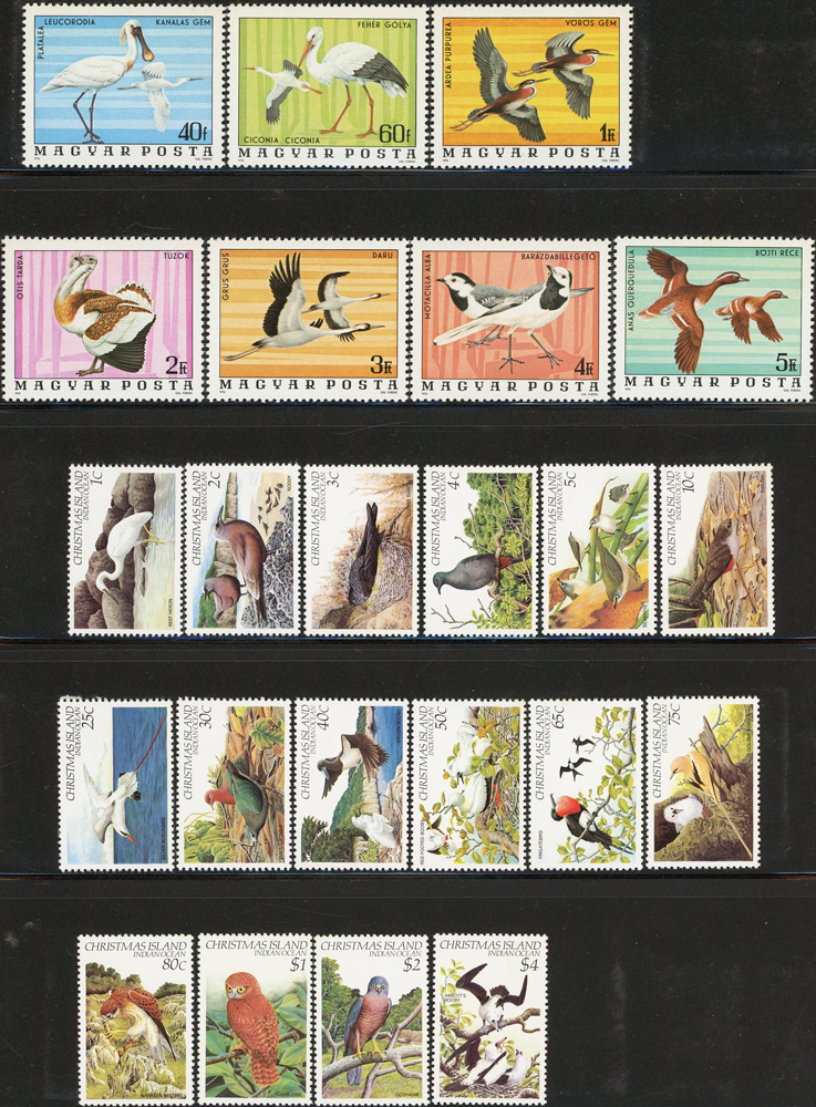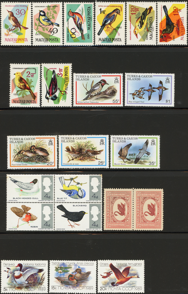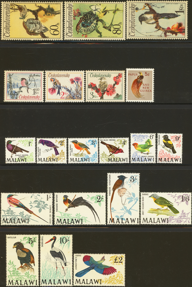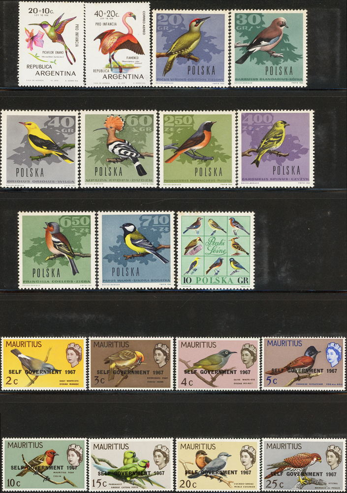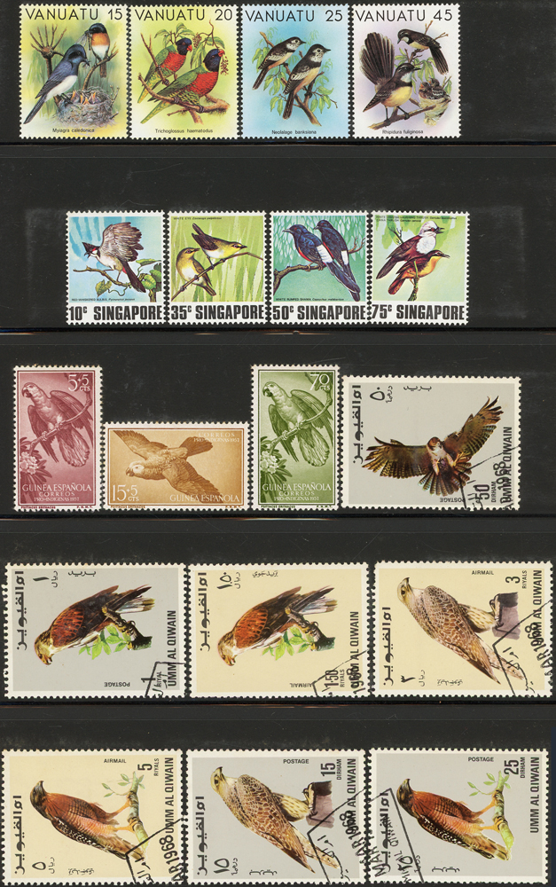 《鳥類》專題郵票小輯,含新票723枚,舊票98枚,未銷戳小全張18枚,未銷戳小版張4版,整理整齊於黑卡中,部分成套,國家包括有:美國.賴索托.羅馬.迦納.蒙古.巴拉圭.索羅門群島.史瓦濟蘭.福克蘭群島.加拿大.澳洲,紐西蘭.宏都拉斯.安圭拉.南非.格林那達.馬爾地夫.印尼.摩爾達維亞.根西島.以色列.斯洛伐克.波蘭.匈牙利.剛果.西班牙.保加利亞.馬尼亞.冰島.馬拉威.諾福克島.聖文森.安地卡及巴布達.多明尼加.蘇聯.巴哈馬.馬拉威.巴貝多.巴西.尼加拉瓜.圭亞那.韓國.台灣.巴布亞紐幾內亞.馬來西亞,越南.羅德西亞.中國.日本.牙買加.模里西斯.阿根廷.新加坡.萬那杜.辛巴威等等,少數為方連,多數不重複,品像混合,VF-F;歡迎至官網瀏覽全貌(Page 141)