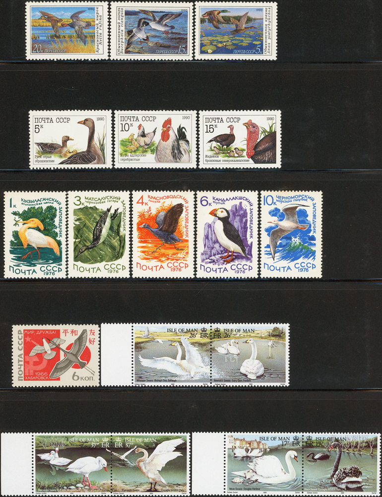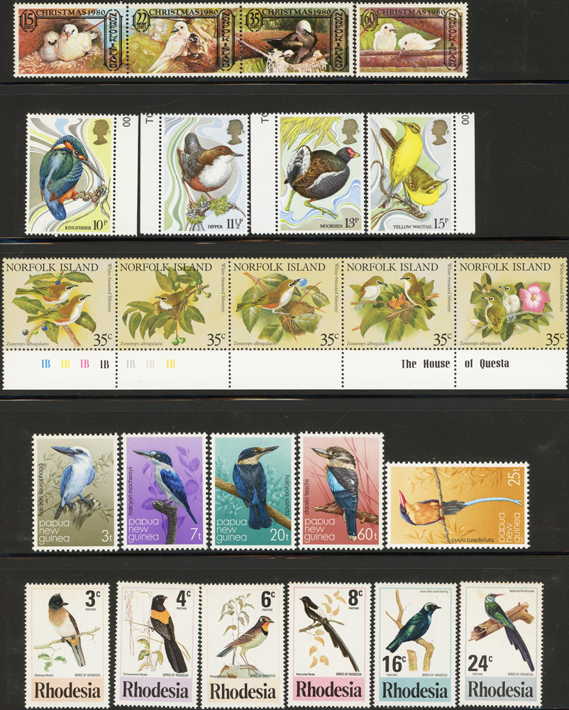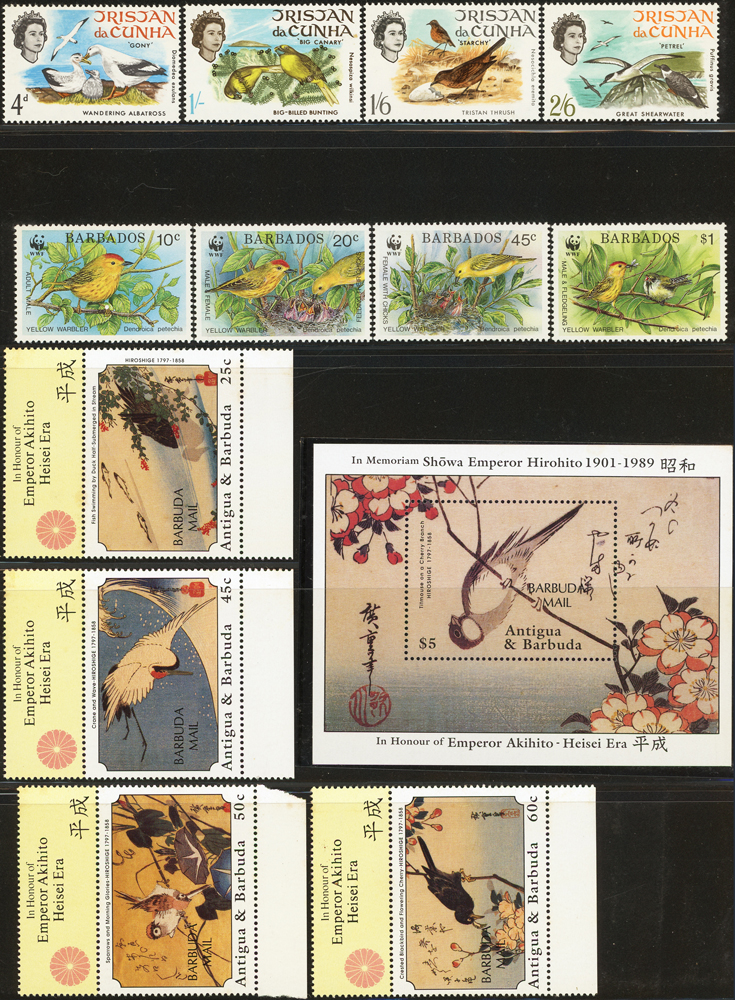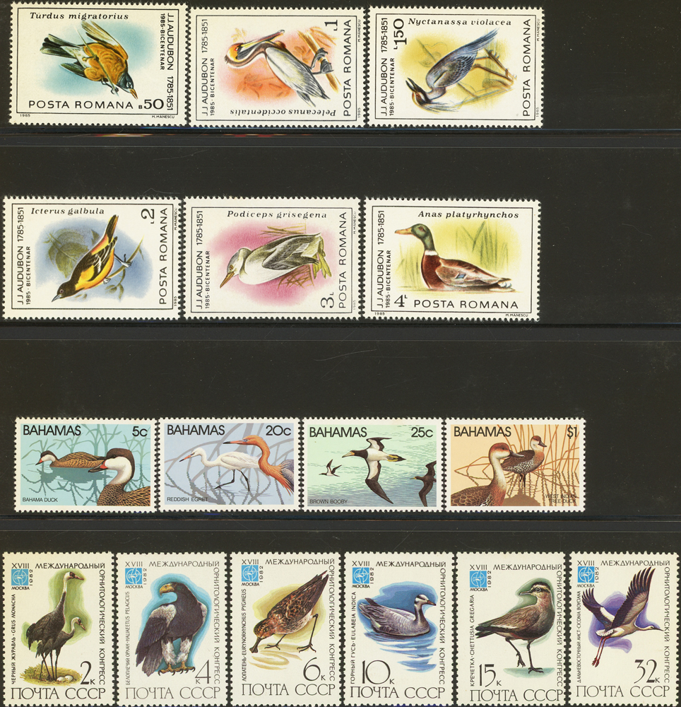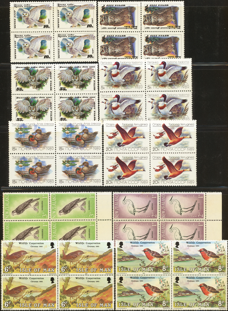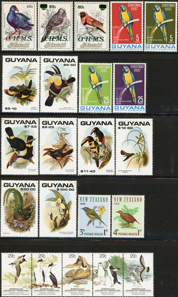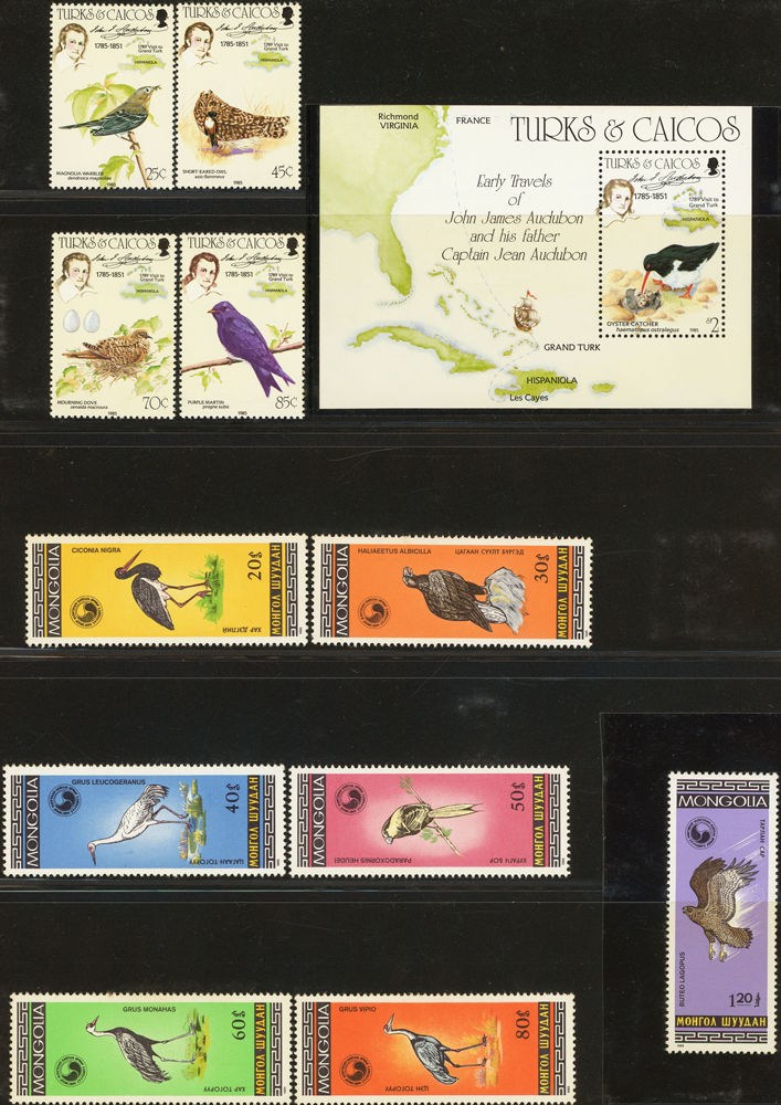 《鳥類》專題郵票小輯,含新票723枚,舊票98枚,未銷戳小全張18枚,未銷戳小版張4版,整理整齊於黑卡中,部分成套,國家包括有:美國.賴索托.羅馬.迦納.蒙古.巴拉圭.索羅門群島.史瓦濟蘭.福克蘭群島.加拿大.澳洲,紐西蘭.宏都拉斯.安圭拉.南非.格林那達.馬爾地夫.印尼.摩爾達維亞.根西島.以色列.斯洛伐克.波蘭.匈牙利.剛果.西班牙.保加利亞.馬尼亞.冰島.馬拉威.諾福克島.聖文森.安地卡及巴布達.多明尼加.蘇聯.巴哈馬.馬拉威.巴貝多.巴西.尼加拉瓜.圭亞那.韓國.台灣.巴布亞紐幾內亞.馬來西亞,越南.羅德西亞.中國.日本.牙買加.模里西斯.阿根廷.新加坡.萬那杜.辛巴威等等,少數為方連,多數不重複,品像混合,VF-F;歡迎至官網瀏覽全貌(Page 141)