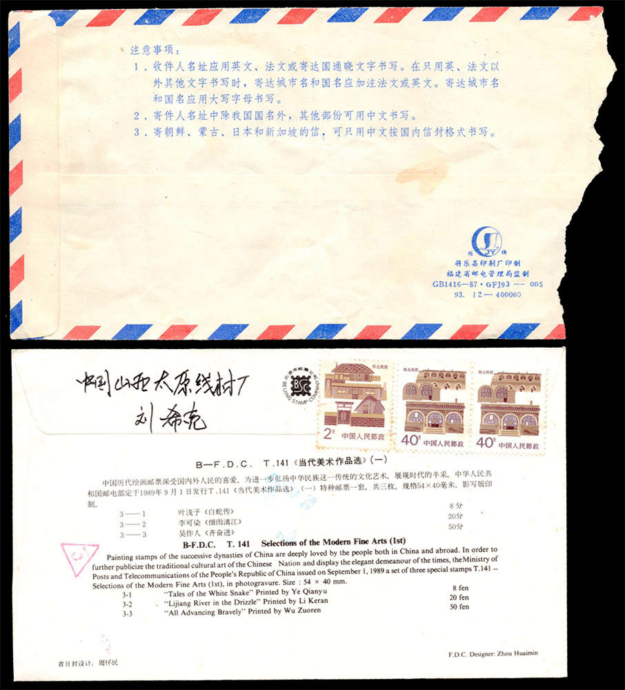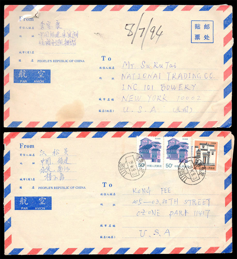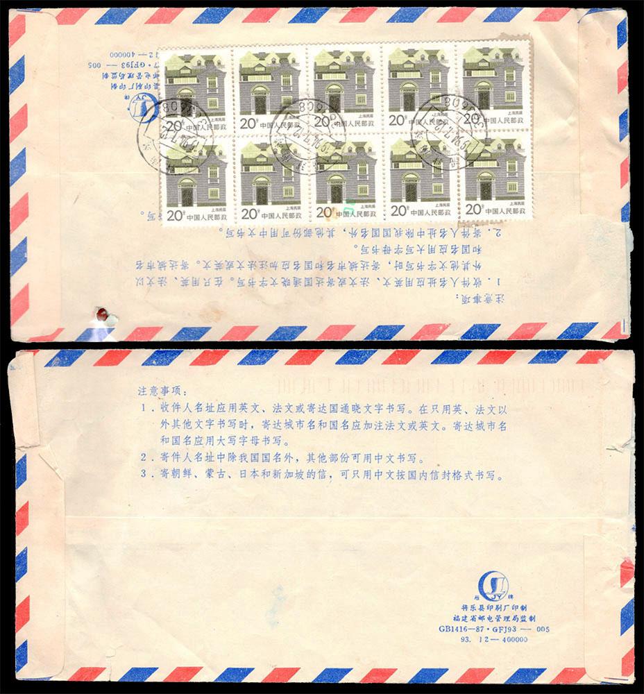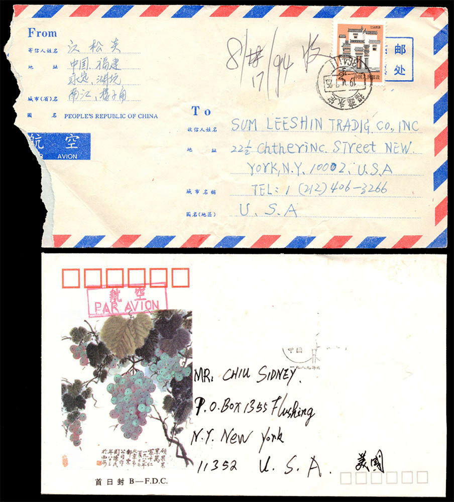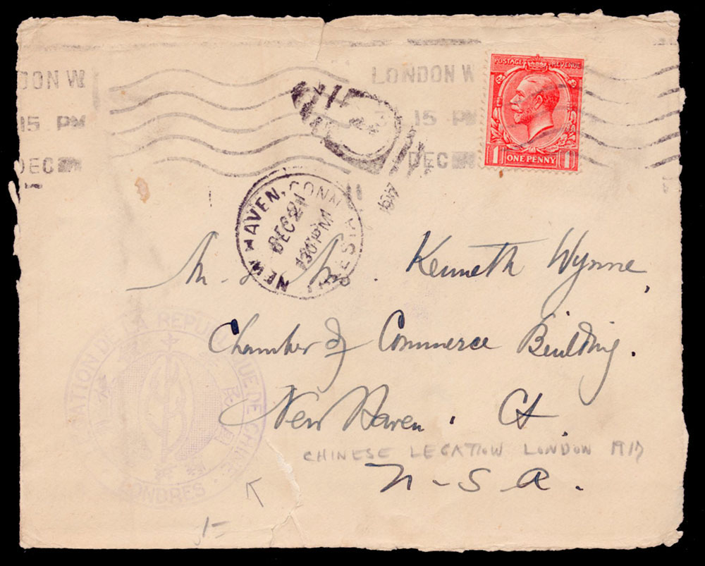 實寄封5件:(1)1917年中國駐英國大使館寄美國封,貼英郵1便士1枚,銷倫敦15.DEC.1917,NEW HAVEN 21.DEC中轉戳,旁另銷紫色『中華民國駐英吉利使館』中法文章,僅存封面;(2)1994年福建永定寄美國航空封四件,均貼民居普票,其中一件掉票