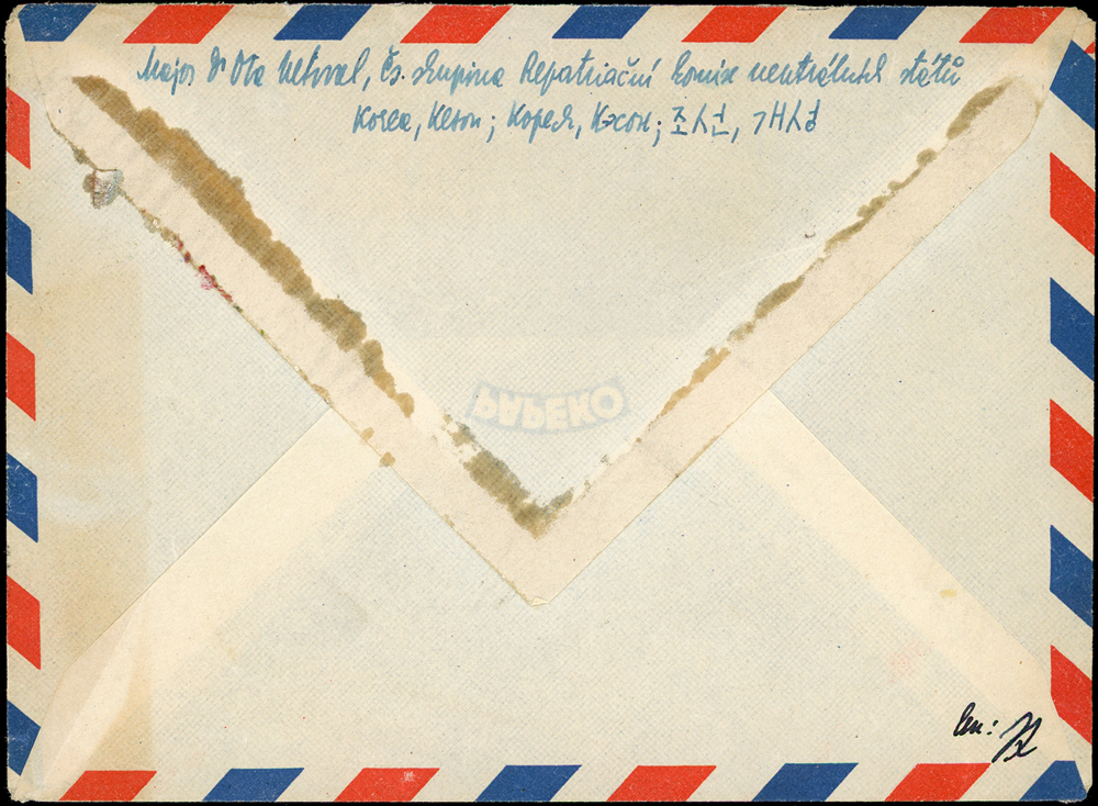 1953年北朝鮮寄捷克航空封,貼票3枚,銷黃海53.12.28日戳 註:1950年代韓戰停戰後,北朝鮮實寄封非常少見(Page 141)