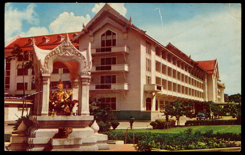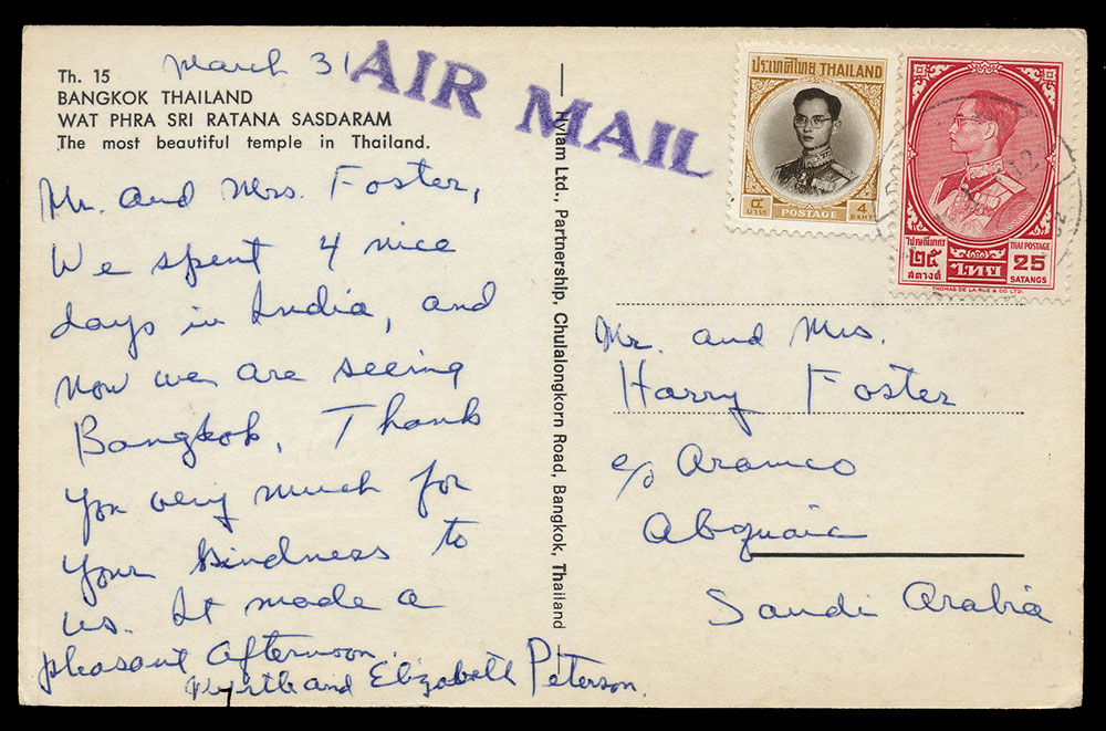 實寄片4片:(1)早期泰國寄沙烏地阿拉伯(金箔圖案)明信片一件,年份不清,貼票二枚;(2)早期泰國寄美國彩色風景明信片一件,年份不清,貼票一枚;(3)1958年泰國寄美國(四面佛)明信片一件,貼票三枚;(4)1960年泰國寄美國(寺廟圖)風景明信片一件,貼票三枚