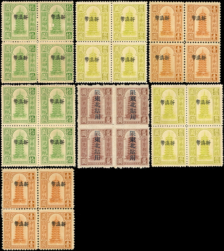 匯兌印紙新票一組共46枚,含:(1)加蓋『新滇幣』1元10枚,10元10枚,300元9枚,含4方連6件共30枚;(2)加蓋『限東北貼用』300元5枚,1萬元1枚,2萬元8枚;(3)加蓋『蒙疆』2元1枚;(4)加蓋『安徽』10元橫雙連無齒一件;VF-F(Page 143)