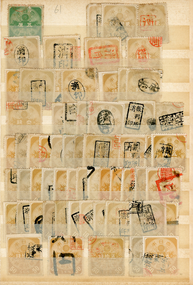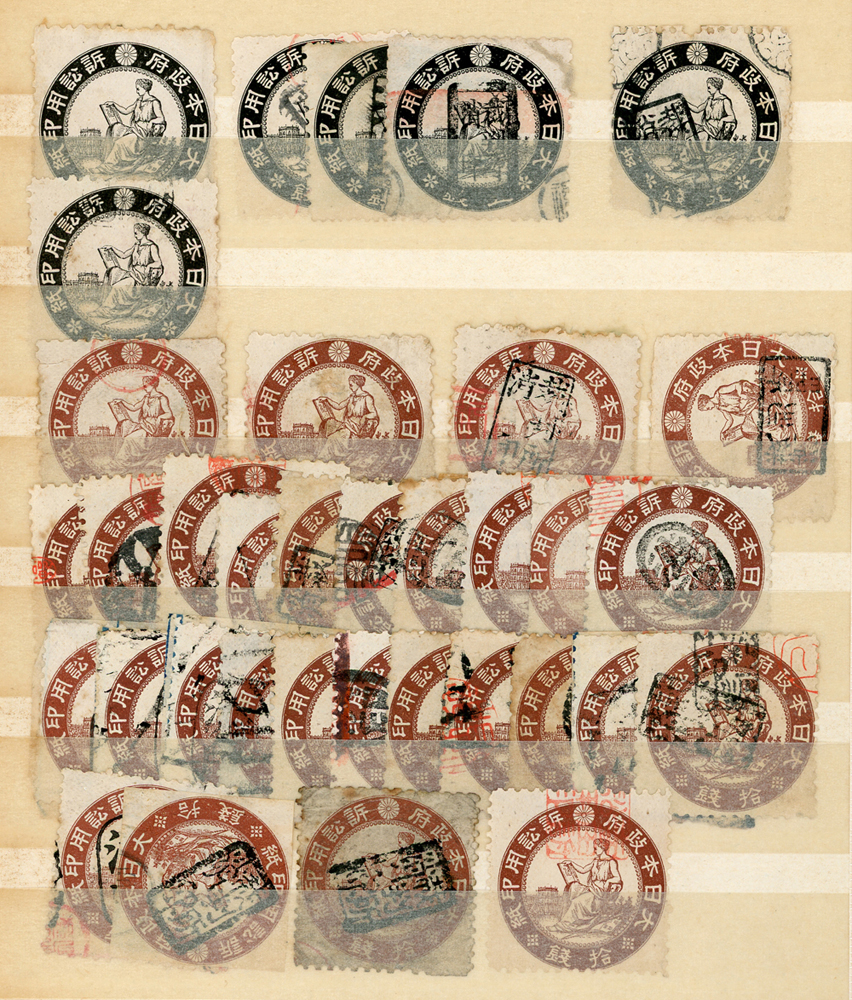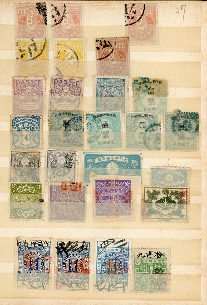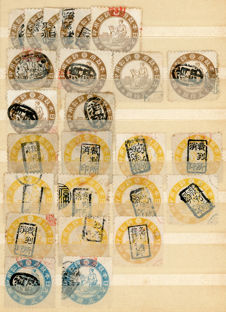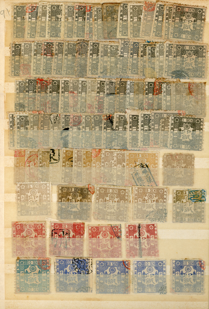 日本中早期各式印花票證新舊混合一冊,共684枚,多數已使用,包括有:烟火印紙.煙草印紙.登記印紙.收入印紙.賣藥印紙.證券印紙.訴訟用印紙.桐生輸出絹織物證票等,多重複,品像混合,F-VF;歡迎至官網瀏覽全貌(Page 143)