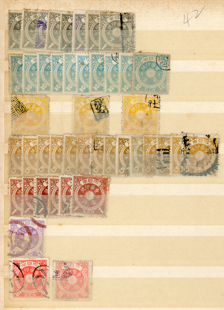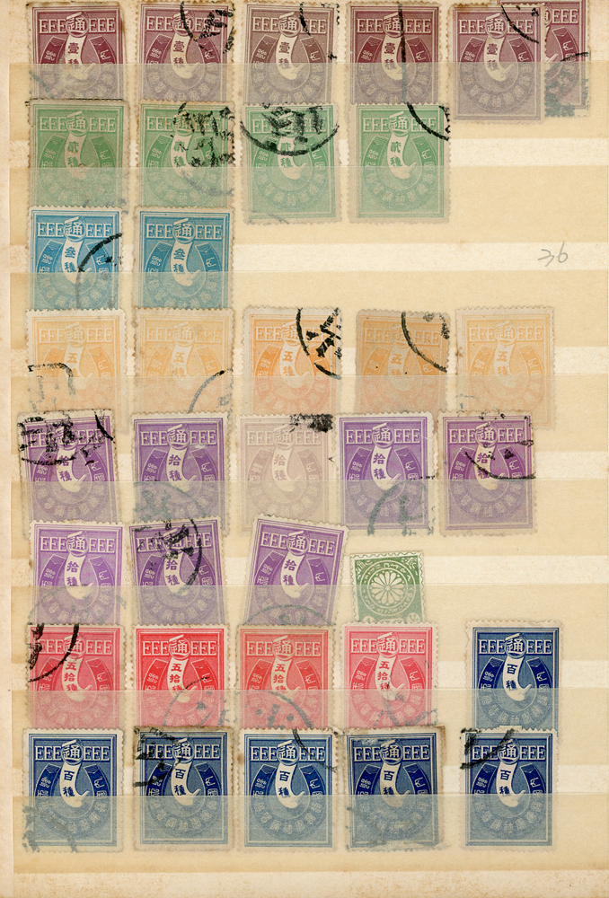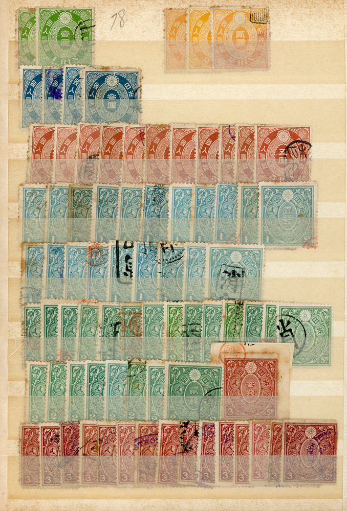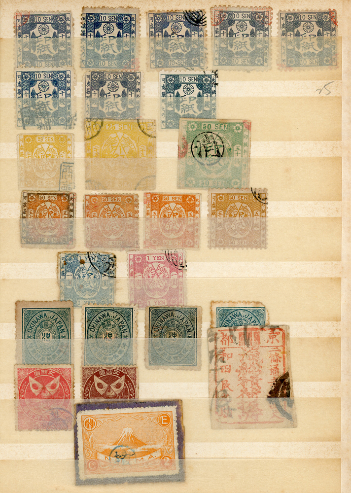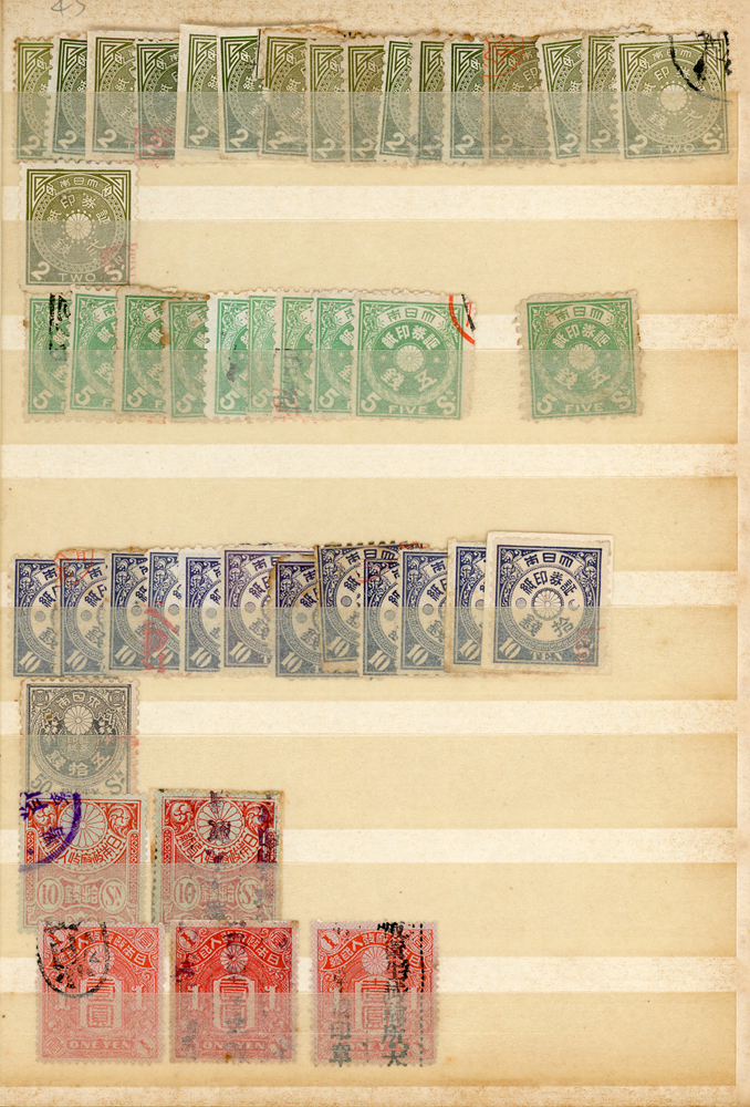 日本中早期各式印花票證新舊混合一冊,共684枚,多數已使用,包括有:烟火印紙.煙草印紙.登記印紙.收入印紙.賣藥印紙.證券印紙.訴訟用印紙.桐生輸出絹織物證票等,多重複,品像混合,F-VF;歡迎至官網瀏覽全貌(Page 143)