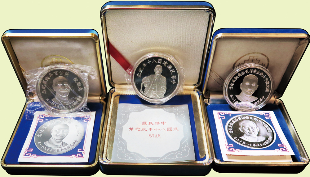 台灣銀行代售銀幣/章三枚:(1)民國74年國父孫中山先生120歲誕辰紀念27克銀章,原盒裝.證書,BU;(2)1991年中華民國建國八十年紀念1盎司銀幣,原盒裝.證書,PROOF;(3)民國75年先總統蔣公百年誕辰紀念銀章,重27克,原盒裝.證書,UNC(Page 22)