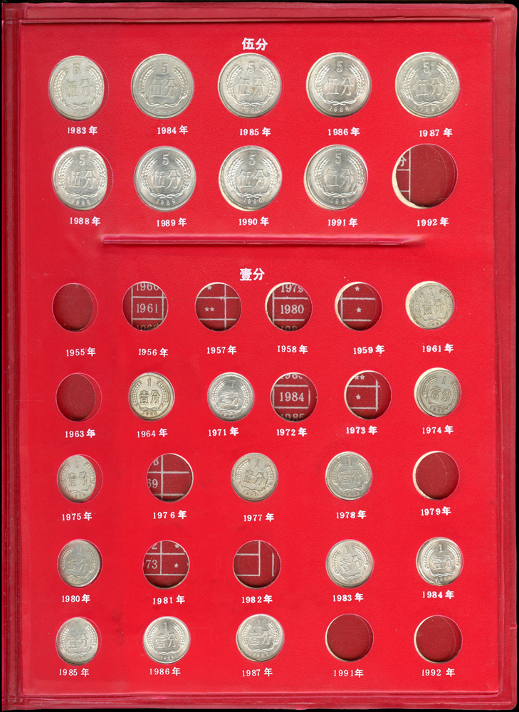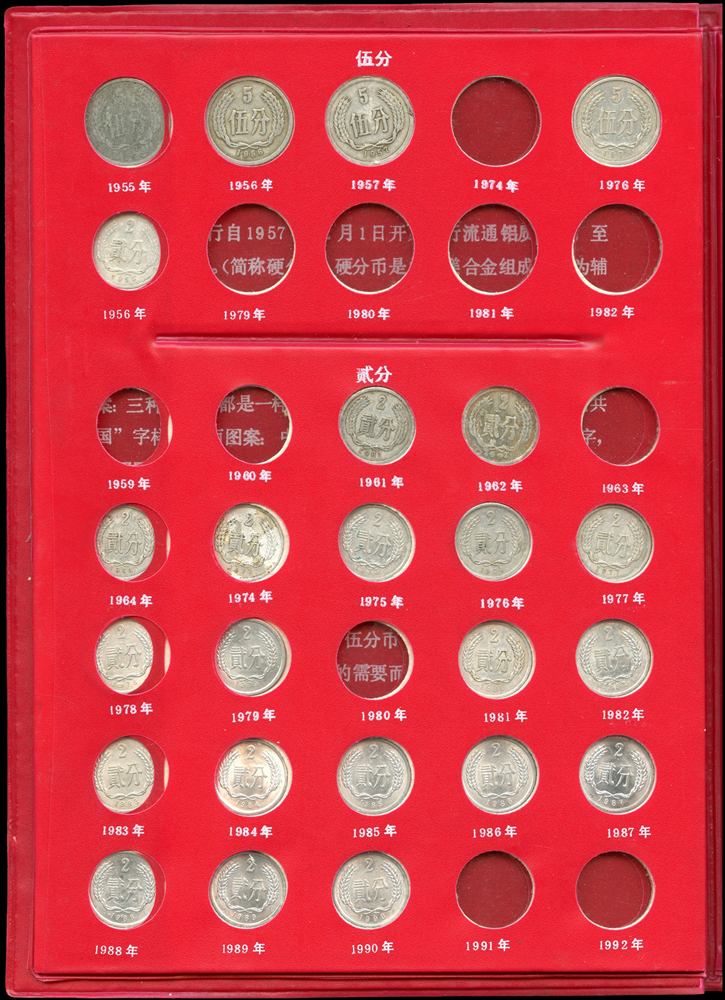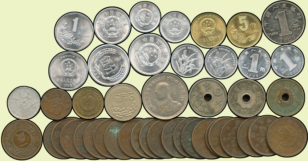 各國錢幣一組,包括:(1)1955~2001年大陸流通幣60枚,含:5角銅幣2枚,1元鎳幣1枚,1分~1角鋁幣57枚,約14枚VF-XF,其餘UNC,附定位冊;(2)台灣2011年辛亥革命一百周年專冊,內有慶祝中華民國建國一百年百元紀念鈔1枚,建國九十年10元鎳幣1枚,AU;(3)日本桐一錢銅幣21枚,中圓孔10錢鎳幣2枚.銅幣1枚,鳥一錢銅幣1枚,共25枚,VF-XF;(4)保加利亞.韓國.泰國流通幣各1枚,台灣流通幣5角.1角各1枚,XF(Page 23)