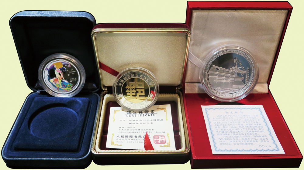 紀念章/幣:(1)2006年台北郵局贈-民國95年全國郵展鑲鑽雙色紀念章(內環24K包金鑲嵌施華洛世奇水晶鑽石,外環包銀),重31.1克,原盒裝.證書,BU;(2)庫克群島2003年雙魚座銅鎳紀念幣,重27.8克,原盒裝,UNC;(3)2008年武漢武鋼集團發行-武鋼投產50周年紀念銀章,重50克,原盒裝.證書,PROOF(Page 28)