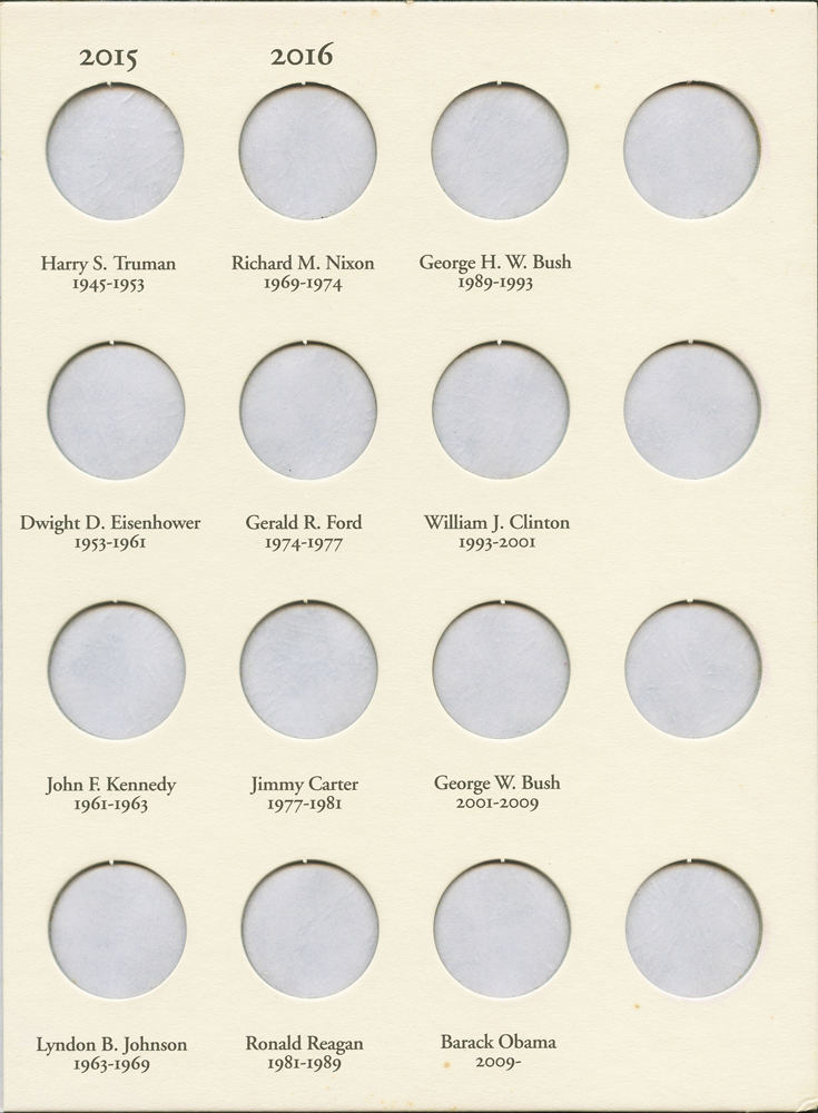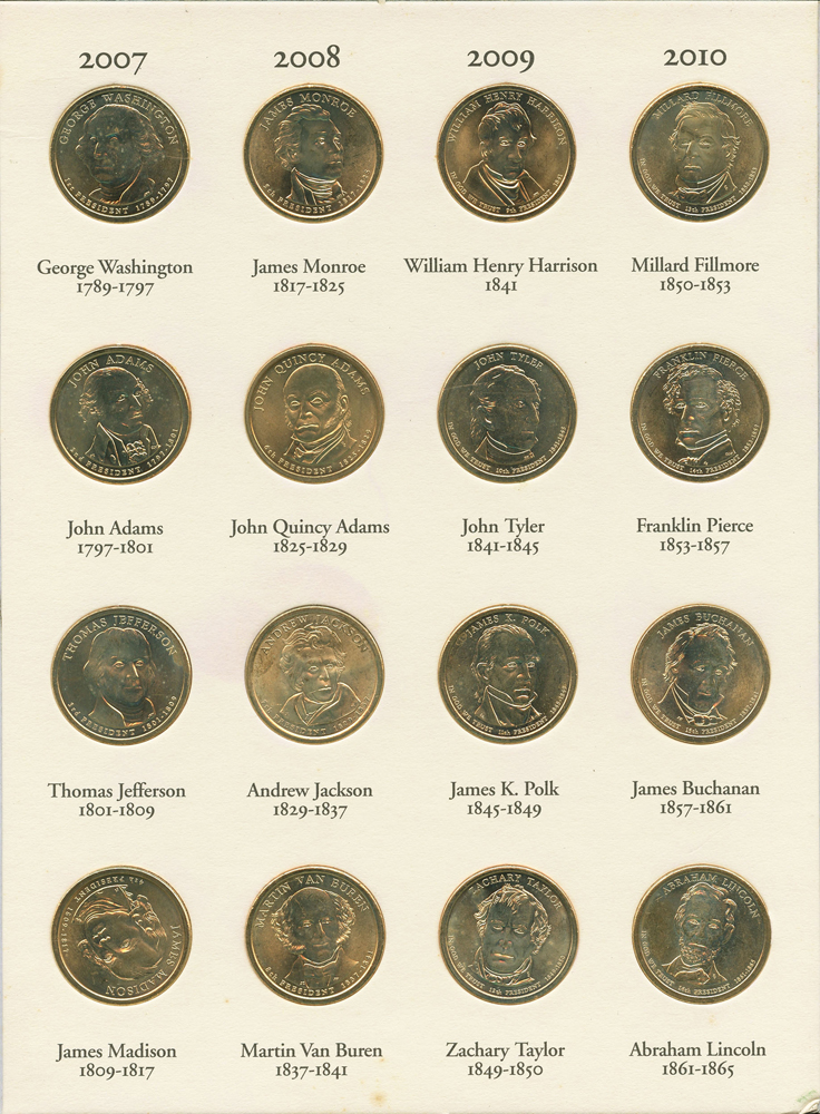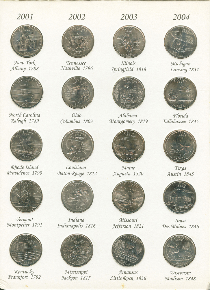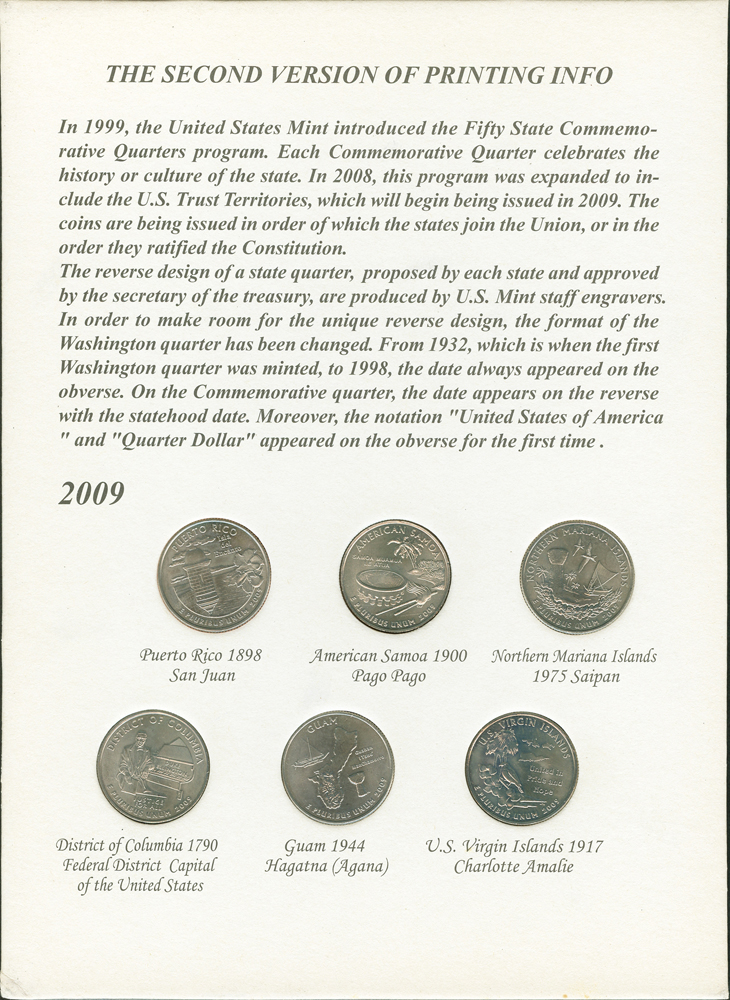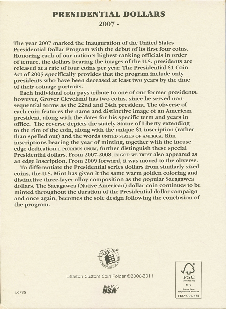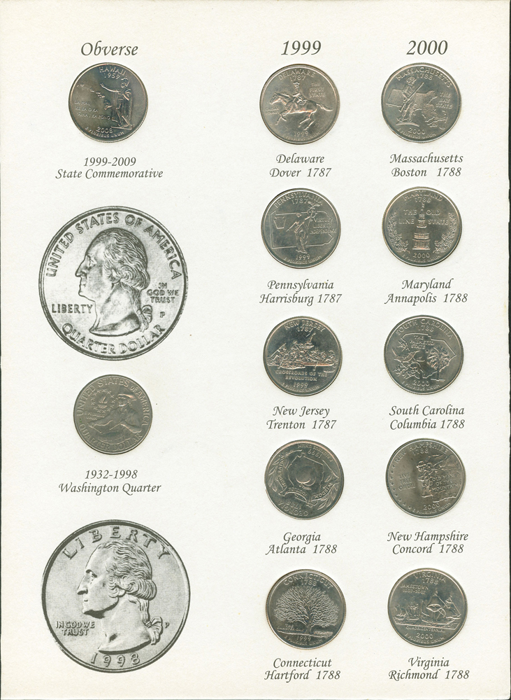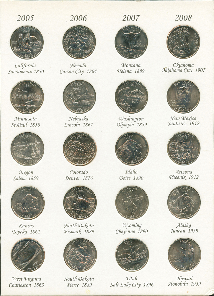 美國(America)流通紀念幣定位冊二冊,包括:(1)2007年發行各時期美國總統1元紀念銅幣20枚,UNC;(2)1999~2009年第二版25美分50州紀念幣58枚全套,UNC