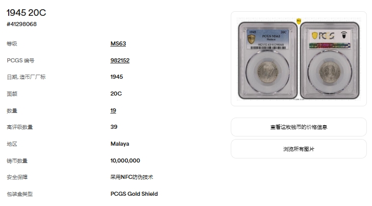 錢幣分類 中國錢幣中國歷代古錢(8001-8022)中國機制銀幣(8023-8108)中國機制銅幣/鎳幣/鋁幣(8109-8142)偽政權錢幣(8143-8144)台灣銀行~流通幣(8145-8187)台灣銀行~試鑄幣(8188)台灣銀行~紀念幣(章)(8189-8210)中國人民銀行~流通幣(8211-8217)中國人民銀行~金銀紀念幣(8218-8236)各時期~紀念章(8238-8258)中國香港錢幣(8259-8263)世界各國錢幣日本錢幣(8264-8283)世界各國錢幣(A~Z)(8284-8309)晚到項次~新中國金.銀幣(8825-8827) 中國錢幣 ↳中國歷代古錢(8001-8022) ↳中國機制銀幣(8023-8108) ↳中國機制銅幣/鎳幣/鋁幣(8109-8142) ↳偽政權錢幣(8143-8144) ↳台灣銀行~流通幣(8145-8187) ↳台灣銀行~試鑄幣(8188) ↳台灣銀行~紀念幣(章)(8189-8210) ↳中國人民銀行~流通幣(8211-8217) ↳中國人民銀行~金銀紀念幣(8218-8236) ↳各時期~紀念章(8238-8258) ↳中國香港錢幣(8259-8263)世界各國錢幣 ↳日本錢幣(8264-8283) ↳世界各國錢幣(A~Z)(8284-8309) ↳晚到項次~新中國金.銀幣(8825-8827) 點大圖放大展示,點小圖切換 馬來亞(Malaya)1945年20 CENTS銀幣,稀年,PCGS MS63 金盾(Page 34) 結標時間 2025-12-16 11:39:20 拍品編號:8299 起拍價:NT$1500 當前價:NT$1500 自動出價 直接出價 出價 系統將按出價級數,依序為您比(出)價至上限金額 提醒您:直接出價後不可將金額改低,只能改高,蟠龍無法降低您的出價,最高出價者無法取消出價 (查看出價說明) 得標說明:需按得標價另加10%佣金 當前加價幅度:NT$0元 (查看加價級數表) 回上頁 線上出價記錄 線上 0 人次,書面 0 人次 競價客戶 所在地 出價時間 出價金額 出價方式 問與答 目前尚無提問 我要提問 請先登入會員