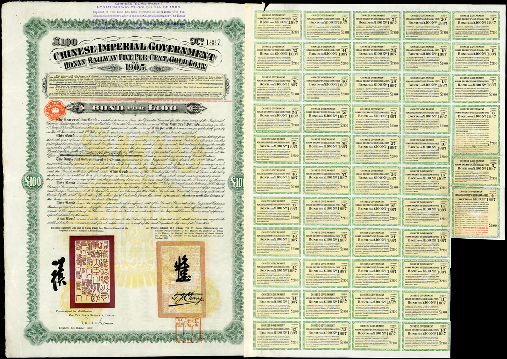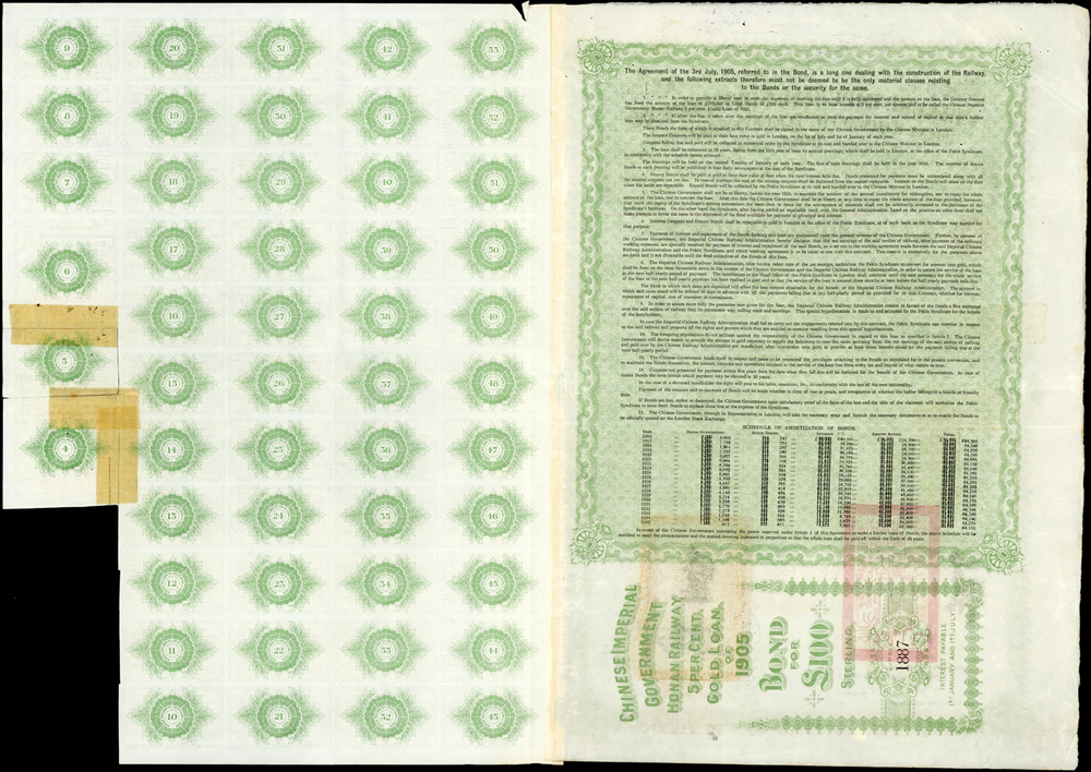 1905年大清帝國政府對外發行,河南鐵路五厘黃金貸款債券£100英鎊(46.5*66cm),含大部份息票,有水印,由英商北京福公司(PEKIN SYNDICATE,LTD.)代理發行,發行量7000張,有督辦鐵路總公司事務大臣盛宣懷和中國駐英大使張德彝的關防和簽押,並有福公司代表簽字,對折,80新(Page 36)