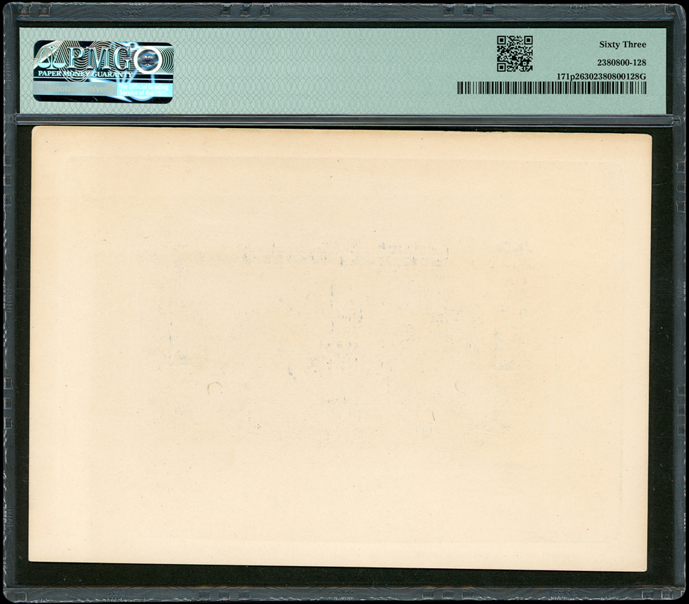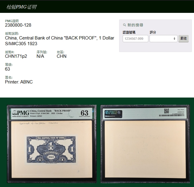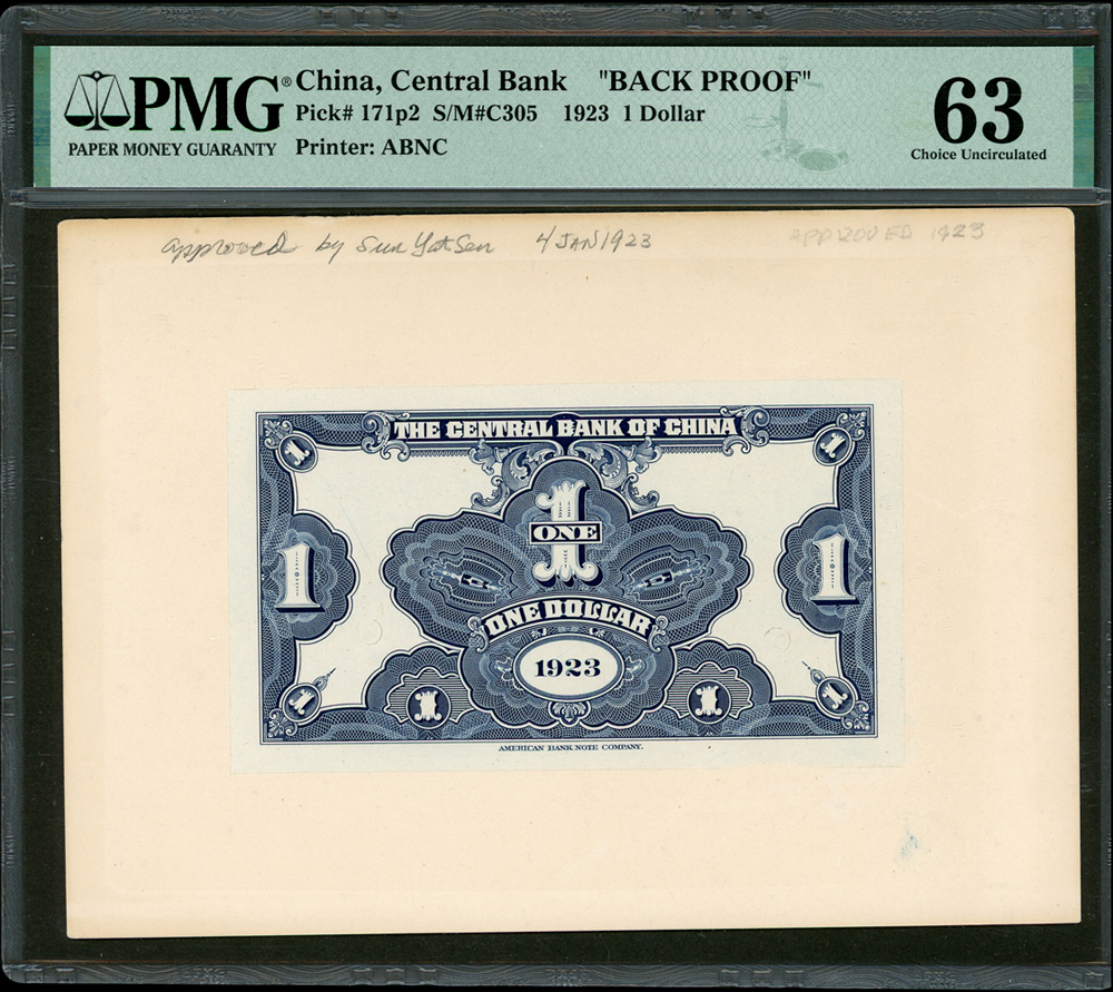 中央銀行十二年1元背面試模票,上面有鉛筆寫的“approved by Sun Yat Sen 4 JAN 1923”。這是孫中山批准鈔票設計的唯一證據。PMG 63。楊著「中央銀行銀元兑換券」第16頁(Page 37)