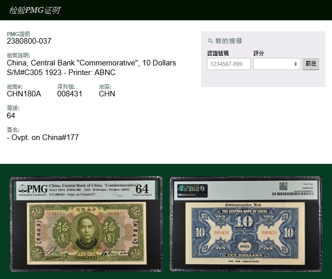 紙鈔分類 中國紙鈔清代~紙幣/股票/債券(8310-8323)『楊展孝』收藏~中央銀行銀元兑換券(8324-8380)民國~中央銀行紙幣(8381-8424)民國~中國銀行(8425-8448)民國~交通銀行(8449-8459)民國~中國農民銀行(8460-8462)民國~各省銀行券(8463-8491)民國~軍用鈔票(8492-8504)民國~地方券/錢莊票(8505-8510)民國~偽政權紙幣(8511-8519)民國金融票證~債券/股票(8520-8543)臺灣銀行~日治時期(8544-8552)臺灣銀行~老台幣(8553-8577)臺灣銀行~新台幣(8578-8679)臺灣銀行~限金門/限馬祖通用(8680-8694)臺灣銀行~限大陳島通用(8695-8696)臺灣/中央銀行~趣味號(8697-8706)中央銀行~三連鈔(8707-8709)臺灣各式金融票證(8710-8715)日本『山崎 修之亮』收藏~中國及外國紙幣(8716-8738)新中國紙幣解放區時期紙幣/債券(8739-8740)中國人民銀行~各版人民幣/外匯券/金融票證(8741-8759)世界各國紙幣日本紙幣(8760-8773)世界各國紙幣(A~Z)(8774-8783) 中國紙鈔 ↳清代~紙幣/股票/債券(8310-8323) ↳『楊展孝』收藏~中央銀行銀元兑換券(8324-8380) ↳民國~中央銀行紙幣(8381-8424) ↳民國~中國銀行(8425-8448) ↳民國~交通銀行(8449-8459) ↳民國~中國農民銀行(8460-8462) ↳民國~各省銀行券(8463-8491) ↳民國~軍用鈔票(8492-8504) ↳民國~地方券/錢莊票(8505-8510) ↳民國~偽政權紙幣(8511-8519) ↳民國金融票證~債券/股票(8520-8543) ↳臺灣銀行~日治時期(8544-8552) ↳臺灣銀行~老台幣(8553-8577) ↳臺灣銀行~新台幣(8578-8679) ↳臺灣銀行~限金門/限馬祖通用(8680-8694) ↳臺灣銀行~限大陳島通用(8695-8696) ↳臺灣/中央銀行~趣味號(8697-8706) ↳中央銀行~三連鈔(8707-8709) ↳臺灣各式金融票證(8710-8715) ↳日本『山崎 修之亮』收藏~中國及外國紙幣(8716-8738)新中國紙幣 ↳解放區時期紙幣/債券(8739-8740) ↳中國人民銀行~各版人民幣/外匯券/金融票證(8741-8759)世界各國紙幣 ↳日本紙幣(8760-8773) ↳世界各國紙幣(A~Z)(8774-8783) 點大圖放大展示,點小圖切換 6 中央銀行十二年10元愛國紀念券,鈔號008431。PMG 64。楊著「中央銀行銀元兑換券」第18頁(Page 38) 結標時間 2025-12-16 11:49:40 拍品編號:8330 起拍價:NT$80000 當前價:NT$80000 自動出價 直接出價 出價 系統將按出價級數,依序為您比(出)價至上限金額 提醒您:直接出價後不可將金額改低,只能改高,蟠龍無法降低您的出價,最高出價者無法取消出價 (查看出價說明) 得標說明:需按得標價另加10%佣金 當前加價幅度:NT$0元 (查看加價級數表) 回上頁 線上出價記錄 線上 0 人次,書面 0 人次 競價客戶 所在地 出價時間 出價金額 出價方式 問與答 目前尚無提問 我要提問 請先登入會員