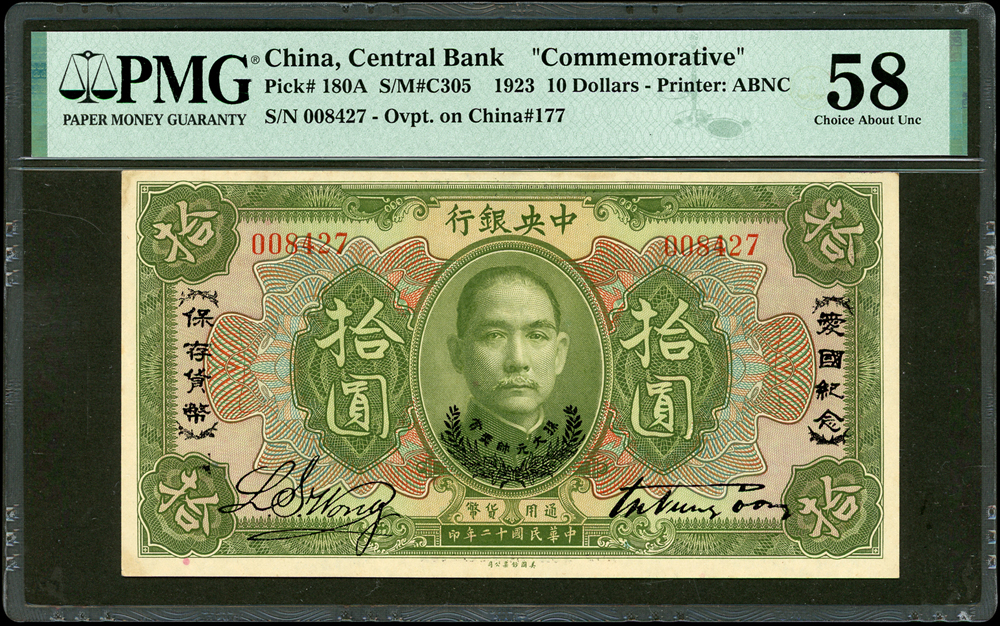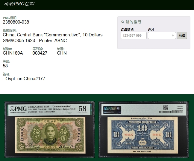 紙鈔分類 中國紙鈔清代~紙幣/股票/債券(8310-8323)『楊展孝』收藏~中央銀行銀元兑換券(8324-8380)民國~中央銀行紙幣(8381-8424)民國~中國銀行(8425-8448)民國~交通銀行(8449-8459)民國~中國農民銀行(8460-8462)民國~各省銀行券(8463-8491)民國~軍用鈔票(8492-8504)民國~地方券/錢莊票(8505-8510)民國~偽政權紙幣(8511-8519)民國金融票證~債券/股票(8520-8543)臺灣銀行~日治時期(8544-8552)臺灣銀行~老台幣(8553-8577)臺灣銀行~新台幣(8578-8679)臺灣銀行~限金門/限馬祖通用(8680-8694)臺灣銀行~限大陳島通用(8695-8696)臺灣/中央銀行~趣味號(8697-8706)中央銀行~三連鈔(8707-8709)臺灣各式金融票證(8710-8715)日本『山崎 修之亮』收藏~中國及外國紙幣(8716-8738)新中國紙幣解放區時期紙幣/債券(8739-8740)中國人民銀行~各版人民幣/外匯券/金融票證(8741-8759)世界各國紙幣日本紙幣(8760-8773)世界各國紙幣(A~Z)(8774-8783) 中國紙鈔 ↳清代~紙幣/股票/債券(8310-8323) ↳『楊展孝』收藏~中央銀行銀元兑換券(8324-8380) ↳民國~中央銀行紙幣(8381-8424) ↳民國~中國銀行(8425-8448) ↳民國~交通銀行(8449-8459) ↳民國~中國農民銀行(8460-8462) ↳民國~各省銀行券(8463-8491) ↳民國~軍用鈔票(8492-8504) ↳民國~地方券/錢莊票(8505-8510) ↳民國~偽政權紙幣(8511-8519) ↳民國金融票證~債券/股票(8520-8543) ↳臺灣銀行~日治時期(8544-8552) ↳臺灣銀行~老台幣(8553-8577) ↳臺灣銀行~新台幣(8578-8679) ↳臺灣銀行~限金門/限馬祖通用(8680-8694) ↳臺灣銀行~限大陳島通用(8695-8696) ↳臺灣/中央銀行~趣味號(8697-8706) ↳中央銀行~三連鈔(8707-8709) ↳臺灣各式金融票證(8710-8715) ↳日本『山崎 修之亮』收藏~中國及外國紙幣(8716-8738)新中國紙幣 ↳解放區時期紙幣/債券(8739-8740) ↳中國人民銀行~各版人民幣/外匯券/金融票證(8741-8759)世界各國紙幣 ↳日本紙幣(8760-8773) ↳世界各國紙幣(A~Z)(8774-8783) 點大圖放大展示,點小圖切換 5 中央銀行十二年10元愛國紀念券,鈔號008427。PMG 58。楊著「中央銀行銀元兑換券」第18頁(Page 38) 結標時間 2025-12-16 11:50:00 拍品編號:8331 起拍價:NT$50000 當前價:NT$50000 自動出價 直接出價 出價 系統將按出價級數,依序為您比(出)價至上限金額 提醒您:直接出價後不可將金額改低,只能改高,蟠龍無法降低您的出價,最高出價者無法取消出價 (查看出價說明) 得標說明:需按得標價另加10%佣金 當前加價幅度:NT$0元 (查看加價級數表) 回上頁 線上出價記錄 線上 0 人次,書面 0 人次 競價客戶 所在地 出價時間 出價金額 出價方式 問與答 目前尚無提問 我要提問 請先登入會員
