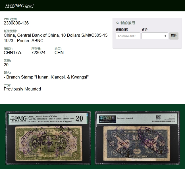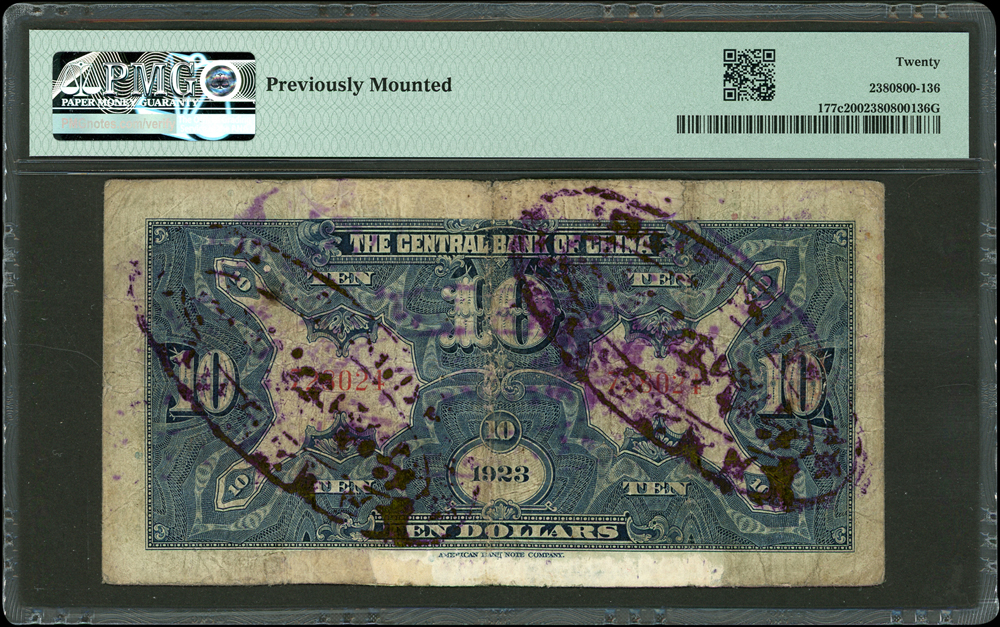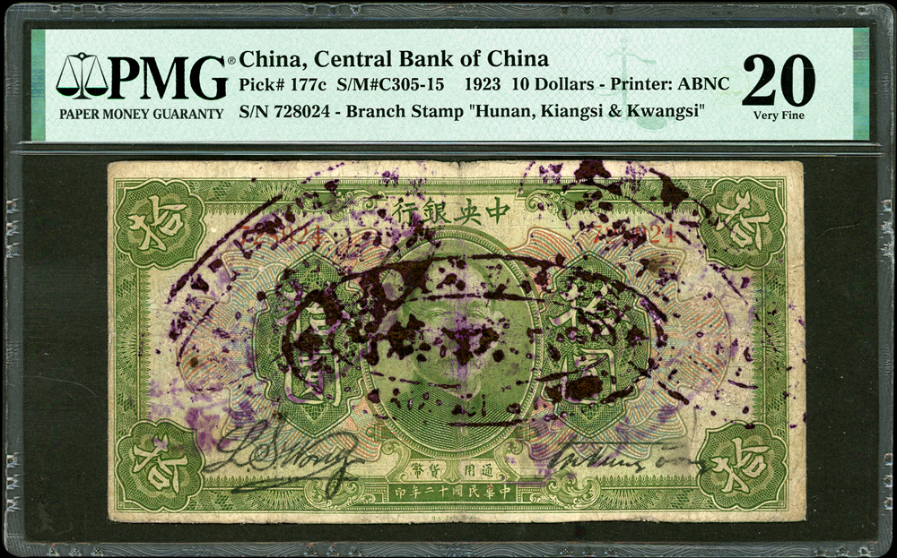 中央銀行十二年湘贛桂通用券10元被塗抹掉,在銀行兌現時被發現後,加蓋中央銀行總行湘贛桂三省通用券橢圓戳,鈔號728024。加蓋橢圓戳的10元僅此一枚。PMG 20。楊著「中央銀行銀元兑換券」第35頁。黨恩來舊藏,丁張弓良「中國軍用鈔票史略」第357頁原件(Page 40)