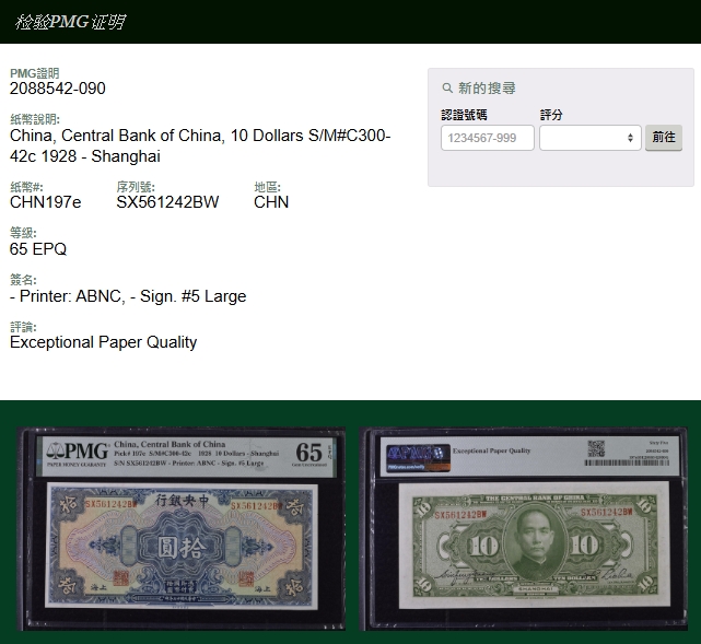 紙鈔分類 中國紙鈔清代~紙幣/股票/債券(8310-8323)『楊展孝』收藏~中央銀行銀元兑換券(8324-8380)民國~中央銀行紙幣(8381-8424)民國~中國銀行(8425-8448)民國~交通銀行(8449-8459)民國~中國農民銀行(8460-8462)民國~各省銀行券(8463-8491)民國~軍用鈔票(8492-8504)民國~地方券/錢莊票(8505-8510)民國~偽政權紙幣(8511-8519)民國金融票證~債券/股票(8520-8543)臺灣銀行~日治時期(8544-8552)臺灣銀行~老台幣(8553-8577)臺灣銀行~新台幣(8578-8679)臺灣銀行~限金門/限馬祖通用(8680-8694)臺灣銀行~限大陳島通用(8695-8696)臺灣/中央銀行~趣味號(8697-8706)中央銀行~三連鈔(8707-8709)臺灣各式金融票證(8710-8715)日本『山崎 修之亮』收藏~中國及外國紙幣(8716-8738)新中國紙幣解放區時期紙幣/債券(8739-8740)中國人民銀行~各版人民幣/外匯券/金融票證(8741-8759)世界各國紙幣日本紙幣(8760-8773)世界各國紙幣(A~Z)(8774-8783) 中國紙鈔 ↳清代~紙幣/股票/債券(8310-8323) ↳『楊展孝』收藏~中央銀行銀元兑換券(8324-8380) ↳民國~中央銀行紙幣(8381-8424) ↳民國~中國銀行(8425-8448) ↳民國~交通銀行(8449-8459) ↳民國~中國農民銀行(8460-8462) ↳民國~各省銀行券(8463-8491) ↳民國~軍用鈔票(8492-8504) ↳民國~地方券/錢莊票(8505-8510) ↳民國~偽政權紙幣(8511-8519) ↳民國金融票證~債券/股票(8520-8543) ↳臺灣銀行~日治時期(8544-8552) ↳臺灣銀行~老台幣(8553-8577) ↳臺灣銀行~新台幣(8578-8679) ↳臺灣銀行~限金門/限馬祖通用(8680-8694) ↳臺灣銀行~限大陳島通用(8695-8696) ↳臺灣/中央銀行~趣味號(8697-8706) ↳中央銀行~三連鈔(8707-8709) ↳臺灣各式金融票證(8710-8715) ↳日本『山崎 修之亮』收藏~中國及外國紙幣(8716-8738)新中國紙幣 ↳解放區時期紙幣/債券(8739-8740) ↳中國人民銀行~各版人民幣/外匯券/金融票證(8741-8759)世界各國紙幣 ↳日本紙幣(8760-8773) ↳世界各國紙幣(A~Z)(8774-8783) 點大圖放大展示,點小圖切換 2 中央銀行銀元兌換券美鈔版民國17年10元上海,PMG Gem Uncirculated 65 EPQ(Page 52) 結標時間 2025-12-16 12:06:40 拍品編號:8381 起拍價:NT$1500 當前價:NT$1500 自動出價 直接出價 出價 系統將按出價級數,依序為您比(出)價至上限金額 提醒您:直接出價後不可將金額改低,只能改高,蟠龍無法降低您的出價,最高出價者無法取消出價 (查看出價說明) 得標說明:需按得標價另加10%佣金 當前加價幅度:NT$0元 (查看加價級數表) 回上頁 線上出價記錄 線上 0 人次,書面 0 人次 競價客戶 所在地 出價時間 出價金額 出價方式 問與答 目前尚無提問 我要提問 請先登入會員