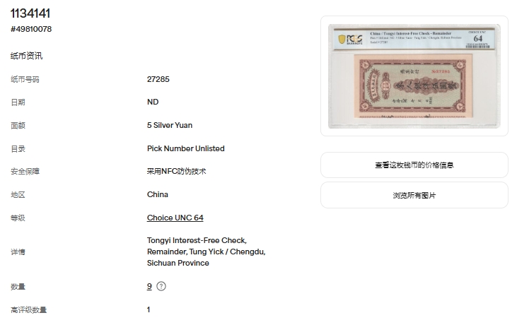 紙鈔分類 中國紙鈔清代~紙幣/股票/債券(8310-8323)『楊展孝』收藏~中央銀行銀元兑換券(8324-8380)民國~中央銀行紙幣(8381-8424)民國~中國銀行(8425-8448)民國~交通銀行(8449-8459)民國~中國農民銀行(8460-8462)民國~各省銀行券(8463-8491)民國~軍用鈔票(8492-8504)民國~地方券/錢莊票(8505-8510)民國~偽政權紙幣(8511-8519)民國金融票證~債券/股票(8520-8543)臺灣銀行~日治時期(8544-8552)臺灣銀行~老台幣(8553-8577)臺灣銀行~新台幣(8578-8679)臺灣銀行~限金門/限馬祖通用(8680-8694)臺灣銀行~限大陳島通用(8695-8696)臺灣/中央銀行~趣味號(8697-8706)中央銀行~三連鈔(8707-8709)臺灣各式金融票證(8710-8715)日本『山崎 修之亮』收藏~中國及外國紙幣(8716-8738)新中國紙幣解放區時期紙幣/債券(8739-8740)中國人民銀行~各版人民幣/外匯券/金融票證(8741-8759)世界各國紙幣日本紙幣(8760-8773)世界各國紙幣(A~Z)(8774-8783) 中國紙鈔 ↳清代~紙幣/股票/債券(8310-8323) ↳『楊展孝』收藏~中央銀行銀元兑換券(8324-8380) ↳民國~中央銀行紙幣(8381-8424) ↳民國~中國銀行(8425-8448) ↳民國~交通銀行(8449-8459) ↳民國~中國農民銀行(8460-8462) ↳民國~各省銀行券(8463-8491) ↳民國~軍用鈔票(8492-8504) ↳民國~地方券/錢莊票(8505-8510) ↳民國~偽政權紙幣(8511-8519) ↳民國金融票證~債券/股票(8520-8543) ↳臺灣銀行~日治時期(8544-8552) ↳臺灣銀行~老台幣(8553-8577) ↳臺灣銀行~新台幣(8578-8679) ↳臺灣銀行~限金門/限馬祖通用(8680-8694) ↳臺灣銀行~限大陳島通用(8695-8696) ↳臺灣/中央銀行~趣味號(8697-8706) ↳中央銀行~三連鈔(8707-8709) ↳臺灣各式金融票證(8710-8715) ↳日本『山崎 修之亮』收藏~中國及外國紙幣(8716-8738)新中國紙幣 ↳解放區時期紙幣/債券(8739-8740) ↳中國人民銀行~各版人民幣/外匯券/金融票證(8741-8759)世界各國紙幣 ↳日本紙幣(8760-8773) ↳世界各國紙幣(A~Z)(8774-8783) 點大圖放大展示,點小圖切換 3 民國年成都同益無息支票,來人銀洋伍圓,未簽用,少見, PCGS CHOICE UNC 64(Page 62) 結標時間 2025-12-16 12:48:40 拍品編號:8507 起拍價:NT$3500 當前價:NT$3500 自動出價 直接出價 出價 系統將按出價級數,依序為您比(出)價至上限金額 提醒您:直接出價後不可將金額改低,只能改高,蟠龍無法降低您的出價,最高出價者無法取消出價 (查看出價說明) 得標說明:需按得標價另加10%佣金 當前加價幅度:NT$0元 (查看加價級數表) 回上頁 線上出價記錄 線上 0 人次,書面 0 人次 競價客戶 所在地 出價時間 出價金額 出價方式 問與答 目前尚無提問 我要提問 請先登入會員
