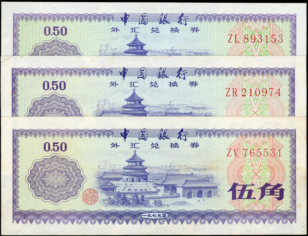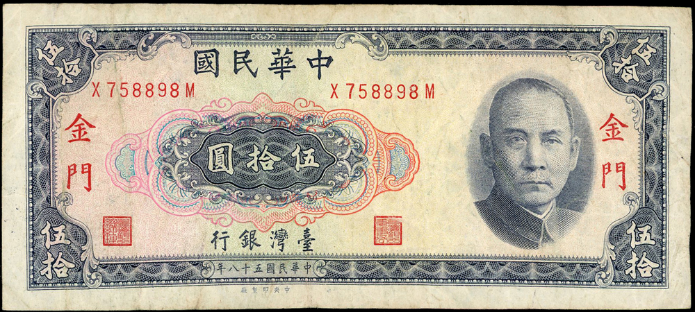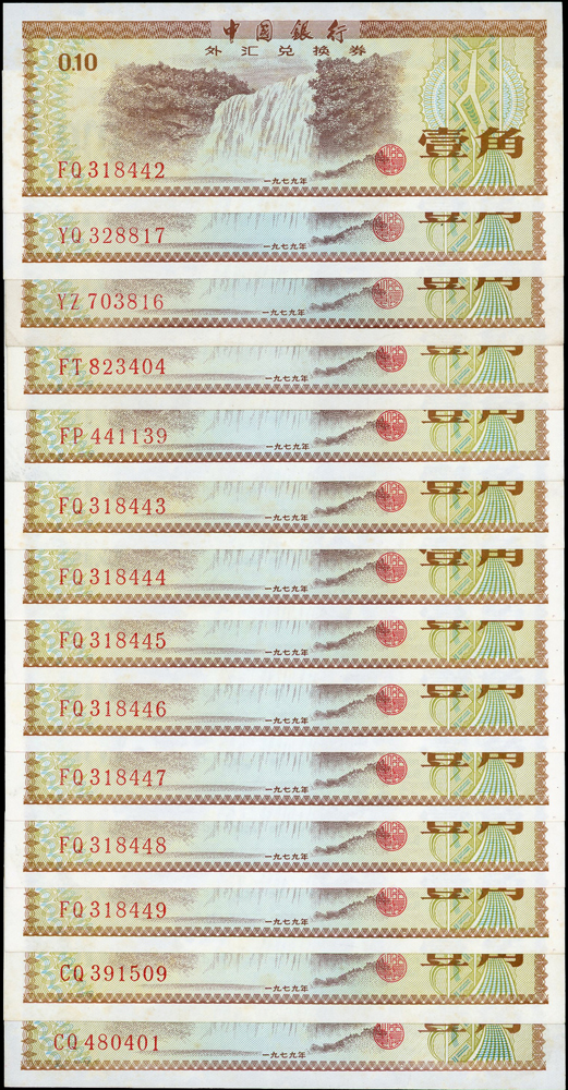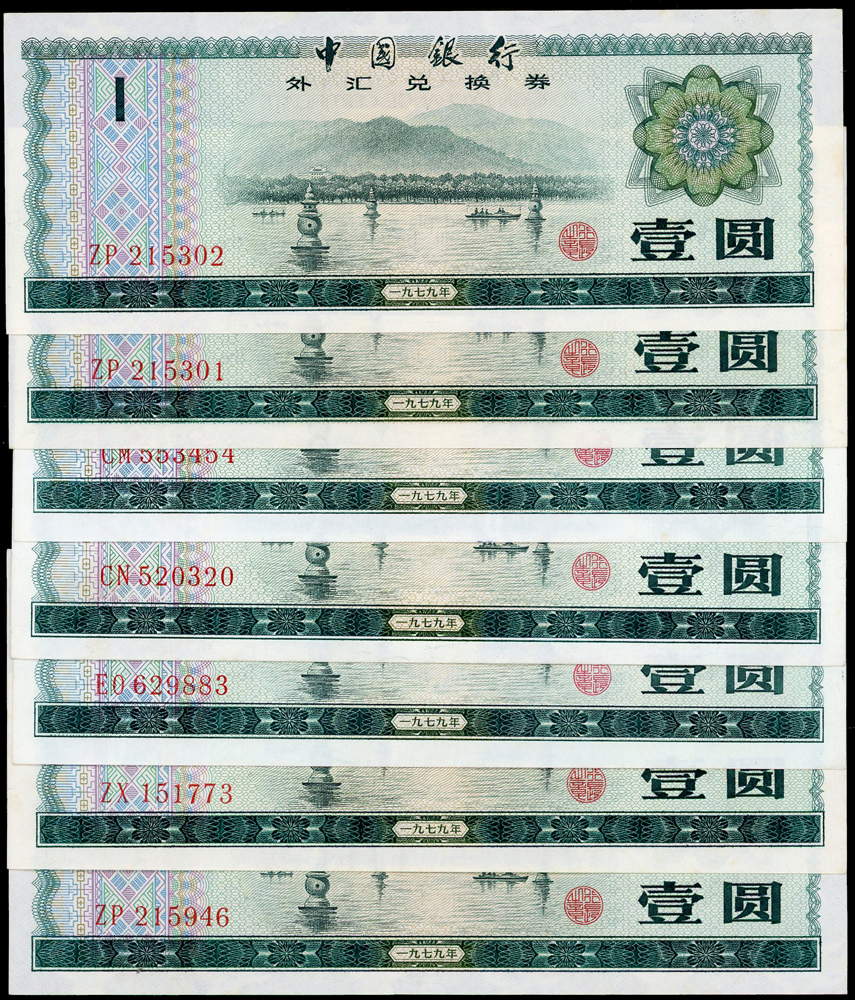 兩岸鈔券:(1)台灣老台幣民國35年1元.10元各1枚,85-90新;金門民國58年50元,數折,70新;(2)中國銀行外匯券:1979年1元16枚.5角3枚.1角14枚,其中1元約8枚中折,其餘無折,80-全新