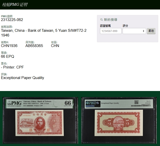 紙鈔分類 中國紙鈔清代~紙幣/股票/債券(8310-8323)『楊展孝』收藏~中央銀行銀元兑換券(8324-8380)民國~中央銀行紙幣(8381-8424)民國~中國銀行(8425-8448)民國~交通銀行(8449-8459)民國~中國農民銀行(8460-8462)民國~各省銀行券(8463-8491)民國~軍用鈔票(8492-8504)民國~地方券/錢莊票(8505-8510)民國~偽政權紙幣(8511-8519)民國金融票證~債券/股票(8520-8543)臺灣銀行~日治時期(8544-8552)臺灣銀行~老台幣(8553-8577)臺灣銀行~新台幣(8578-8679)臺灣銀行~限金門/限馬祖通用(8680-8694)臺灣銀行~限大陳島通用(8695-8696)臺灣/中央銀行~趣味號(8697-8706)中央銀行~三連鈔(8707-8709)臺灣各式金融票證(8710-8715)日本『山崎 修之亮』收藏~中國及外國紙幣(8716-8738)新中國紙幣解放區時期紙幣/債券(8739-8740)中國人民銀行~各版人民幣/外匯券/金融票證(8741-8759)世界各國紙幣日本紙幣(8760-8773)世界各國紙幣(A~Z)(8774-8783) 中國紙鈔 ↳清代~紙幣/股票/債券(8310-8323) ↳『楊展孝』收藏~中央銀行銀元兑換券(8324-8380) ↳民國~中央銀行紙幣(8381-8424) ↳民國~中國銀行(8425-8448) ↳民國~交通銀行(8449-8459) ↳民國~中國農民銀行(8460-8462) ↳民國~各省銀行券(8463-8491) ↳民國~軍用鈔票(8492-8504) ↳民國~地方券/錢莊票(8505-8510) ↳民國~偽政權紙幣(8511-8519) ↳民國金融票證~債券/股票(8520-8543) ↳臺灣銀行~日治時期(8544-8552) ↳臺灣銀行~老台幣(8553-8577) ↳臺灣銀行~新台幣(8578-8679) ↳臺灣銀行~限金門/限馬祖通用(8680-8694) ↳臺灣銀行~限大陳島通用(8695-8696) ↳臺灣/中央銀行~趣味號(8697-8706) ↳中央銀行~三連鈔(8707-8709) ↳臺灣各式金融票證(8710-8715) ↳日本『山崎 修之亮』收藏~中國及外國紙幣(8716-8738)新中國紙幣 ↳解放區時期紙幣/債券(8739-8740) ↳中國人民銀行~各版人民幣/外匯券/金融票證(8741-8759)世界各國紙幣 ↳日本紙幣(8760-8773) ↳世界各國紙幣(A~Z)(8774-8783) 點大圖放大展示,點小圖切換 臺灣銀行老台幣民國35年5元,PMG Gem Uncirculated 66 EPQ(Page 67) 結標時間 2025-12-16 13:05:00 拍品編號:8556 起拍價:NT$1500 當前價:NT$1500 自動出價 直接出價 出價 系統將按出價級數,依序為您比(出)價至上限金額 提醒您:直接出價後不可將金額改低,只能改高,蟠龍無法降低您的出價,最高出價者無法取消出價 (查看出價說明) 得標說明:需按得標價另加10%佣金 當前加價幅度:NT$0元 (查看加價級數表) 回上頁 線上出價記錄 線上 0 人次,書面 0 人次 競價客戶 所在地 出價時間 出價金額 出價方式 問與答 目前尚無提問 我要提問 請先登入會員