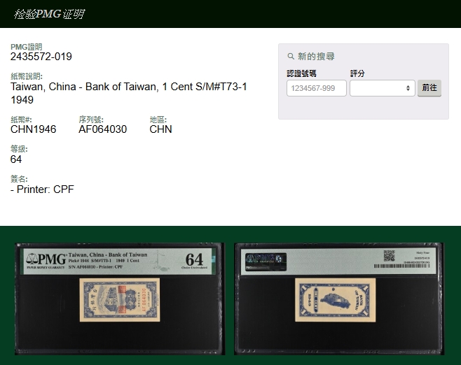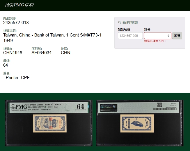 紙鈔分類 中國紙鈔清代~紙幣/股票/債券(8310-8323)『楊展孝』收藏~中央銀行銀元兑換券(8324-8380)民國~中央銀行紙幣(8381-8424)民國~中國銀行(8425-8448)民國~交通銀行(8449-8459)民國~中國農民銀行(8460-8462)民國~各省銀行券(8463-8491)民國~軍用鈔票(8492-8504)民國~地方券/錢莊票(8505-8510)民國~偽政權紙幣(8511-8519)民國金融票證~債券/股票(8520-8543)臺灣銀行~日治時期(8544-8552)臺灣銀行~老台幣(8553-8577)臺灣銀行~新台幣(8578-8679)臺灣銀行~限金門/限馬祖通用(8680-8694)臺灣銀行~限大陳島通用(8695-8696)臺灣/中央銀行~趣味號(8697-8706)中央銀行~三連鈔(8707-8709)臺灣各式金融票證(8710-8715)日本『山崎 修之亮』收藏~中國及外國紙幣(8716-8738)新中國紙幣解放區時期紙幣/債券(8739-8740)中國人民銀行~各版人民幣/外匯券/金融票證(8741-8759)世界各國紙幣日本紙幣(8760-8773)世界各國紙幣(A~Z)(8774-8783) 中國紙鈔 ↳清代~紙幣/股票/債券(8310-8323) ↳『楊展孝』收藏~中央銀行銀元兑換券(8324-8380) ↳民國~中央銀行紙幣(8381-8424) ↳民國~中國銀行(8425-8448) ↳民國~交通銀行(8449-8459) ↳民國~中國農民銀行(8460-8462) ↳民國~各省銀行券(8463-8491) ↳民國~軍用鈔票(8492-8504) ↳民國~地方券/錢莊票(8505-8510) ↳民國~偽政權紙幣(8511-8519) ↳民國金融票證~債券/股票(8520-8543) ↳臺灣銀行~日治時期(8544-8552) ↳臺灣銀行~老台幣(8553-8577) ↳臺灣銀行~新台幣(8578-8679) ↳臺灣銀行~限金門/限馬祖通用(8680-8694) ↳臺灣銀行~限大陳島通用(8695-8696) ↳臺灣/中央銀行~趣味號(8697-8706) ↳中央銀行~三連鈔(8707-8709) ↳臺灣各式金融票證(8710-8715) ↳日本『山崎 修之亮』收藏~中國及外國紙幣(8716-8738)新中國紙幣 ↳解放區時期紙幣/債券(8739-8740) ↳中國人民銀行~各版人民幣/外匯券/金融票證(8741-8759)世界各國紙幣 ↳日本紙幣(8760-8773) ↳世界各國紙幣(A~Z)(8774-8783) 點大圖放大展示,點小圖切換 3 臺灣銀行民國38年1分黃紙彎水,AF字軌帶3,共二枚,均評級:PMG Choice Uncirculated 64 (Page 69) 結標時間 2025-12-16 13:12:20 拍品編號:8578 起拍價:NT$2000 當前價:NT$2000 自動出價 直接出價 出價 系統將按出價級數,依序為您比(出)價至上限金額 提醒您:直接出價後不可將金額改低,只能改高,蟠龍無法降低您的出價,最高出價者無法取消出價 (查看出價說明) 得標說明:需按得標價另加10%佣金 當前加價幅度:NT$0元 (查看加價級數表) 回上頁 線上出價記錄 線上 0 人次,書面 0 人次 競價客戶 所在地 出價時間 出價金額 出價方式 問與答 目前尚無提問 我要提問 請先登入會員