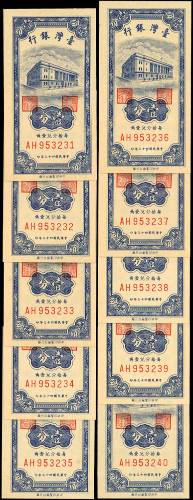 紙鈔分類 中國紙鈔清代~紙幣/股票/債券(8310-8323)『楊展孝』收藏~中央銀行銀元兑換券(8324-8380)民國~中央銀行紙幣(8381-8424)民國~中國銀行(8425-8448)民國~交通銀行(8449-8459)民國~中國農民銀行(8460-8462)民國~各省銀行券(8463-8491)民國~軍用鈔票(8492-8504)民國~地方券/錢莊票(8505-8510)民國~偽政權紙幣(8511-8519)民國金融票證~債券/股票(8520-8543)臺灣銀行~日治時期(8544-8552)臺灣銀行~老台幣(8553-8577)臺灣銀行~新台幣(8578-8679)臺灣銀行~限金門/限馬祖通用(8680-8694)臺灣銀行~限大陳島通用(8695-8696)臺灣/中央銀行~趣味號(8697-8706)中央銀行~三連鈔(8707-8709)臺灣各式金融票證(8710-8715)日本『山崎 修之亮』收藏~中國及外國紙幣(8716-8738)新中國紙幣解放區時期紙幣/債券(8739-8740)中國人民銀行~各版人民幣/外匯券/金融票證(8741-8759)世界各國紙幣日本紙幣(8760-8773)世界各國紙幣(A~Z)(8774-8783) 中國紙鈔 ↳清代~紙幣/股票/債券(8310-8323) ↳『楊展孝』收藏~中央銀行銀元兑換券(8324-8380) ↳民國~中央銀行紙幣(8381-8424) ↳民國~中國銀行(8425-8448) ↳民國~交通銀行(8449-8459) ↳民國~中國農民銀行(8460-8462) ↳民國~各省銀行券(8463-8491) ↳民國~軍用鈔票(8492-8504) ↳民國~地方券/錢莊票(8505-8510) ↳民國~偽政權紙幣(8511-8519) ↳民國金融票證~債券/股票(8520-8543) ↳臺灣銀行~日治時期(8544-8552) ↳臺灣銀行~老台幣(8553-8577) ↳臺灣銀行~新台幣(8578-8679) ↳臺灣銀行~限金門/限馬祖通用(8680-8694) ↳臺灣銀行~限大陳島通用(8695-8696) ↳臺灣/中央銀行~趣味號(8697-8706) ↳中央銀行~三連鈔(8707-8709) ↳臺灣各式金融票證(8710-8715) ↳日本『山崎 修之亮』收藏~中國及外國紙幣(8716-8738)新中國紙幣 ↳解放區時期紙幣/債券(8739-8740) ↳中國人民銀行~各版人民幣/外匯券/金融票證(8741-8759)世界各國紙幣 ↳日本紙幣(8760-8773) ↳世界各國紙幣(A~Z)(8774-8783) 點大圖放大展示,點小圖切換 2 臺灣銀行民國43年1分AH字軌,連號10枚,均帶3,99-全新(Page 68) 結標時間 2025-12-16 13:12:40 拍品編號:8579 起拍價:NT$1800 當前價:NT$1800 自動出價 直接出價 出價 系統將按出價級數,依序為您比(出)價至上限金額 提醒您:直接出價後不可將金額改低,只能改高,蟠龍無法降低您的出價,最高出價者無法取消出價 (查看出價說明) 得標說明:需按得標價另加10%佣金 當前加價幅度:NT$0元 (查看加價級數表) 回上頁 線上出價記錄 線上 0 人次,書面 0 人次 競價客戶 所在地 出價時間 出價金額 出價方式 問與答 目前尚無提問 我要提問 請先登入會員