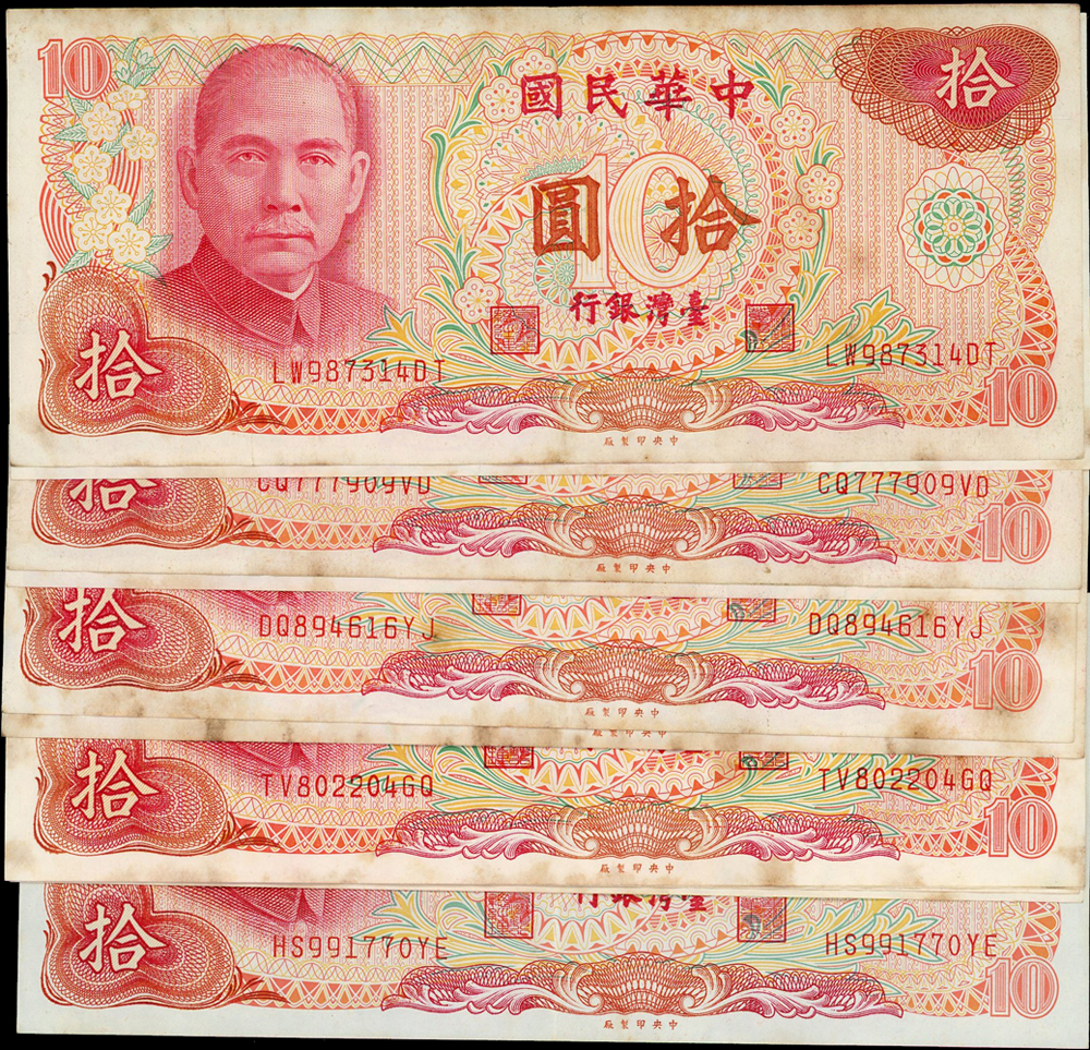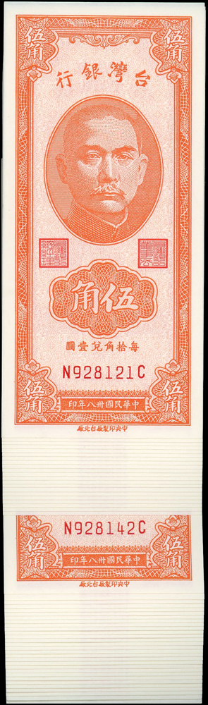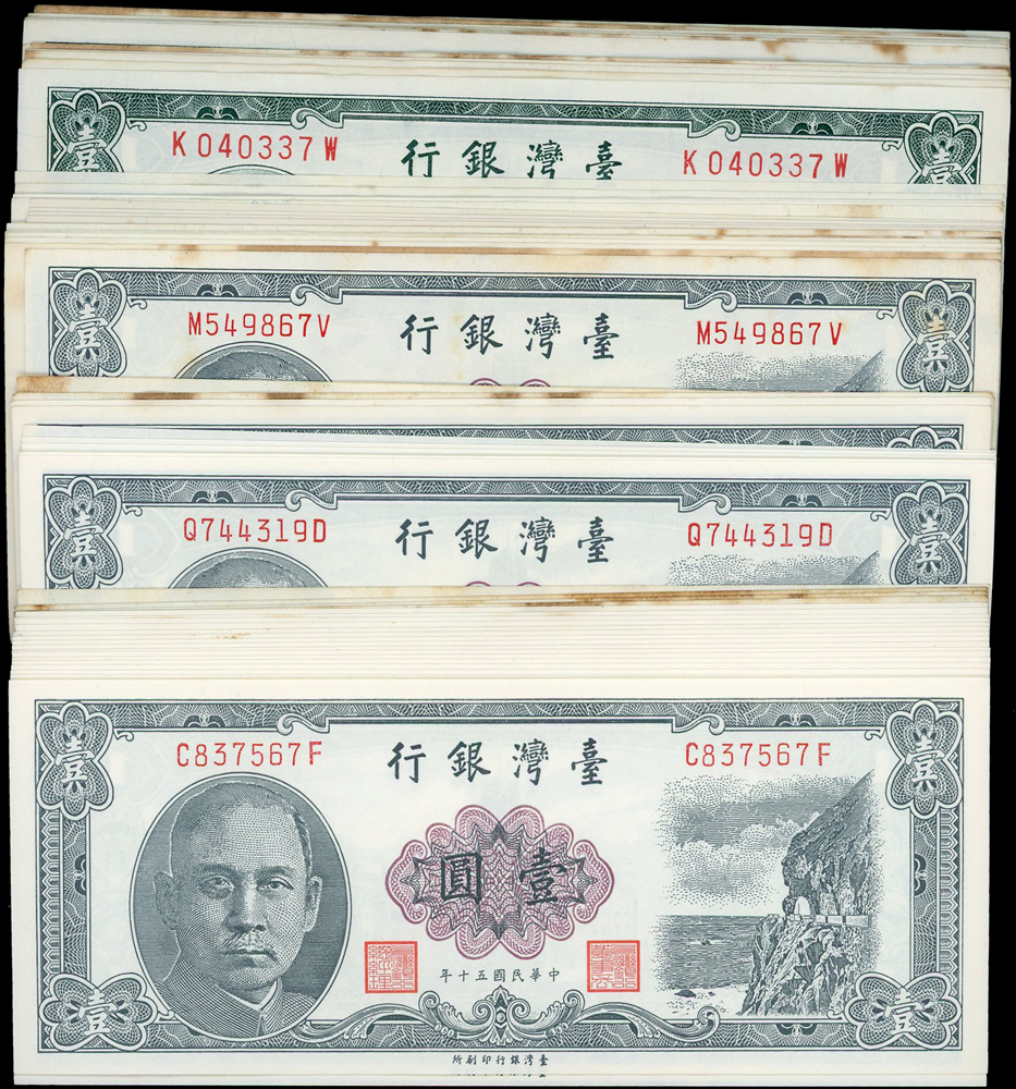 臺灣銀行券一組共131枚,包括:(1)民國38年5角第二版NC字軌連號50枚,其中14枚帶3,全新;(2)民國50年1元第一版直水33枚,其中23枚帶3,中折,約8枚局部黃斑,79-88新;(3)民國50年1元第二版37枚,其中35枚帶3,約9枚局部黃斑約80-85新,其餘95-全新;(4)民國65年10元11枚,其中4枚帶3,中折,80-88新