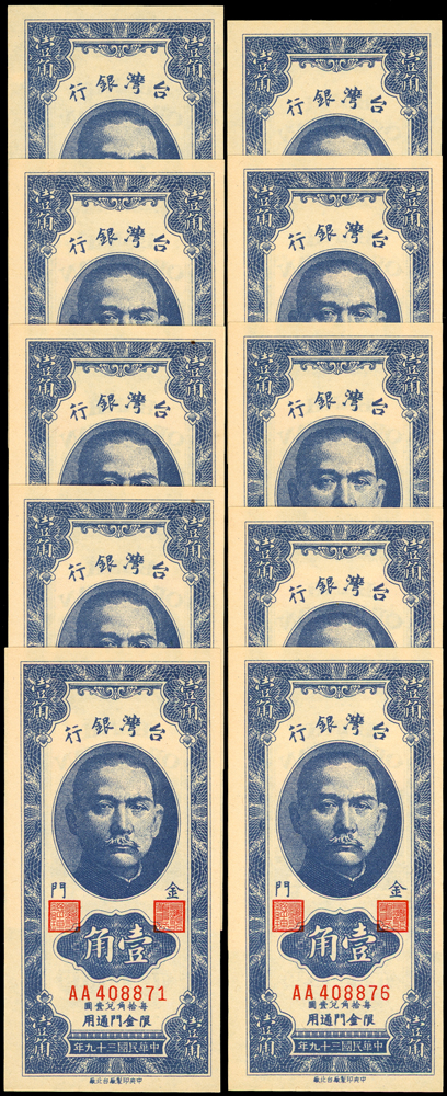 紙鈔分類 中國紙鈔清代~紙幣/股票/債券(8310-8323)『楊展孝』收藏~中央銀行銀元兑換券(8324-8380)民國~中央銀行紙幣(8381-8424)民國~中國銀行(8425-8448)民國~交通銀行(8449-8459)民國~中國農民銀行(8460-8462)民國~各省銀行券(8463-8491)民國~軍用鈔票(8492-8504)民國~地方券/錢莊票(8505-8510)民國~偽政權紙幣(8511-8519)民國金融票證~債券/股票(8520-8543)臺灣銀行~日治時期(8544-8552)臺灣銀行~老台幣(8553-8577)臺灣銀行~新台幣(8578-8679)臺灣銀行~限金門/限馬祖通用(8680-8694)臺灣銀行~限大陳島通用(8695-8696)臺灣/中央銀行~趣味號(8697-8706)中央銀行~三連鈔(8707-8709)臺灣各式金融票證(8710-8715)日本『山崎 修之亮』收藏~中國及外國紙幣(8716-8738)新中國紙幣解放區時期紙幣/債券(8739-8740)中國人民銀行~各版人民幣/外匯券/金融票證(8741-8759)世界各國紙幣日本紙幣(8760-8773)世界各國紙幣(A~Z)(8774-8783) 中國紙鈔 ↳清代~紙幣/股票/債券(8310-8323) ↳『楊展孝』收藏~中央銀行銀元兑換券(8324-8380) ↳民國~中央銀行紙幣(8381-8424) ↳民國~中國銀行(8425-8448) ↳民國~交通銀行(8449-8459) ↳民國~中國農民銀行(8460-8462) ↳民國~各省銀行券(8463-8491) ↳民國~軍用鈔票(8492-8504) ↳民國~地方券/錢莊票(8505-8510) ↳民國~偽政權紙幣(8511-8519) ↳民國金融票證~債券/股票(8520-8543) ↳臺灣銀行~日治時期(8544-8552) ↳臺灣銀行~老台幣(8553-8577) ↳臺灣銀行~新台幣(8578-8679) ↳臺灣銀行~限金門/限馬祖通用(8680-8694) ↳臺灣銀行~限大陳島通用(8695-8696) ↳臺灣/中央銀行~趣味號(8697-8706) ↳中央銀行~三連鈔(8707-8709) ↳臺灣各式金融票證(8710-8715) ↳日本『山崎 修之亮』收藏~中國及外國紙幣(8716-8738)新中國紙幣 ↳解放區時期紙幣/債券(8739-8740) ↳中國人民銀行~各版人民幣/外匯券/金融票證(8741-8759)世界各國紙幣 ↳日本紙幣(8760-8773) ↳世界各國紙幣(A~Z)(8774-8783) 點大圖放大展示,點小圖切換 2 臺灣銀行金門民國39年1角章上有金門,連號10枚(AA408871~AA408880),全新(Page 77) 結標時間 2025-12-16 13:47:00 拍品編號:8682 起拍價:NT$22000 當前價:NT$22000 自動出價 直接出價 出價 系統將按出價級數,依序為您比(出)價至上限金額 提醒您:直接出價後不可將金額改低,只能改高,蟠龍無法降低您的出價,最高出價者無法取消出價 (查看出價說明) 得標說明:需按得標價另加10%佣金 當前加價幅度:NT$1000元 (查看加價級數表) 回上頁 線上出價記錄 線上 1 人次,書面 0 人次 競價客戶 所在地 出價時間 出價金額 出價方式 l******n (領先) 中國 2025-11-25 16:27:07 NT$22000 自動出價 問與答 目前尚無提問 我要提問 請先登入會員