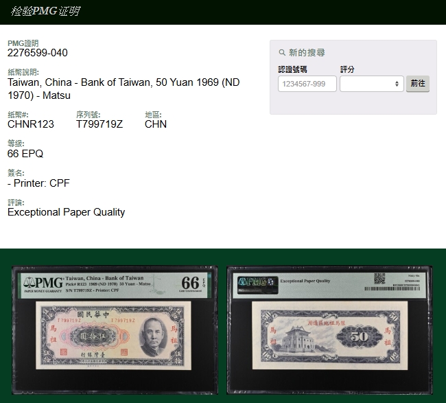 紙鈔分類 中國紙鈔清代~紙幣/股票/債券(8310-8323)『楊展孝』收藏~中央銀行銀元兑換券(8324-8380)民國~中央銀行紙幣(8381-8424)民國~中國銀行(8425-8448)民國~交通銀行(8449-8459)民國~中國農民銀行(8460-8462)民國~各省銀行券(8463-8491)民國~軍用鈔票(8492-8504)民國~地方券/錢莊票(8505-8510)民國~偽政權紙幣(8511-8519)民國金融票證~債券/股票(8520-8543)臺灣銀行~日治時期(8544-8552)臺灣銀行~老台幣(8553-8577)臺灣銀行~新台幣(8578-8679)臺灣銀行~限金門/限馬祖通用(8680-8694)臺灣銀行~限大陳島通用(8695-8696)臺灣/中央銀行~趣味號(8697-8706)中央銀行~三連鈔(8707-8709)臺灣各式金融票證(8710-8715)日本『山崎 修之亮』收藏~中國及外國紙幣(8716-8738)新中國紙幣解放區時期紙幣/債券(8739-8740)中國人民銀行~各版人民幣/外匯券/金融票證(8741-8759)世界各國紙幣日本紙幣(8760-8773)世界各國紙幣(A~Z)(8774-8783) 中國紙鈔 ↳清代~紙幣/股票/債券(8310-8323) ↳『楊展孝』收藏~中央銀行銀元兑換券(8324-8380) ↳民國~中央銀行紙幣(8381-8424) ↳民國~中國銀行(8425-8448) ↳民國~交通銀行(8449-8459) ↳民國~中國農民銀行(8460-8462) ↳民國~各省銀行券(8463-8491) ↳民國~軍用鈔票(8492-8504) ↳民國~地方券/錢莊票(8505-8510) ↳民國~偽政權紙幣(8511-8519) ↳民國金融票證~債券/股票(8520-8543) ↳臺灣銀行~日治時期(8544-8552) ↳臺灣銀行~老台幣(8553-8577) ↳臺灣銀行~新台幣(8578-8679) ↳臺灣銀行~限金門/限馬祖通用(8680-8694) ↳臺灣銀行~限大陳島通用(8695-8696) ↳臺灣/中央銀行~趣味號(8697-8706) ↳中央銀行~三連鈔(8707-8709) ↳臺灣各式金融票證(8710-8715) ↳日本『山崎 修之亮』收藏~中國及外國紙幣(8716-8738)新中國紙幣 ↳解放區時期紙幣/債券(8739-8740) ↳中國人民銀行~各版人民幣/外匯券/金融票證(8741-8759)世界各國紙幣 ↳日本紙幣(8760-8773) ↳世界各國紙幣(A~Z)(8774-8783) 點大圖放大展示,點小圖切換 4 臺灣銀行馬祖民國58年50元TZ字軌,PMG Gem Uncirculated 66 EPQ(Page 77) 結標時間 2025-12-16 13:51:00 拍品編號:8694 起拍價:NT$3800 當前價:NT$3800 自動出價 直接出價 出價 系統將按出價級數,依序為您比(出)價至上限金額 提醒您:直接出價後不可將金額改低,只能改高,蟠龍無法降低您的出價,最高出價者無法取消出價 (查看出價說明) 得標說明:需按得標價另加10%佣金 當前加價幅度:NT$0元 (查看加價級數表) 回上頁 線上出價記錄 線上 0 人次,書面 0 人次 競價客戶 所在地 出價時間 出價金額 出價方式 問與答 目前尚無提問 我要提問 請先登入會員