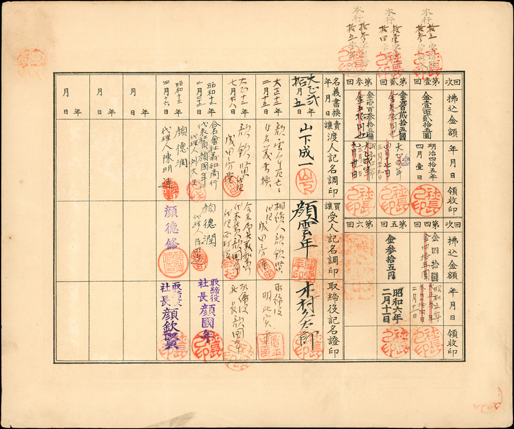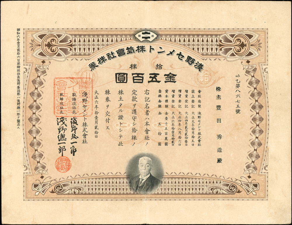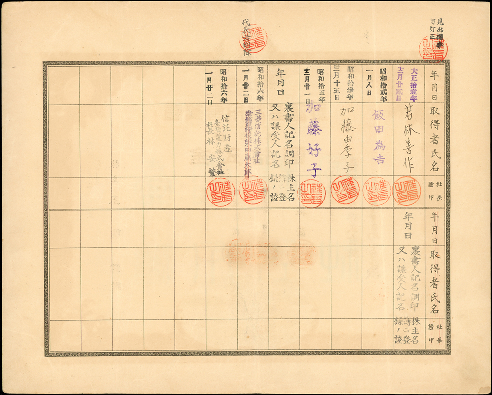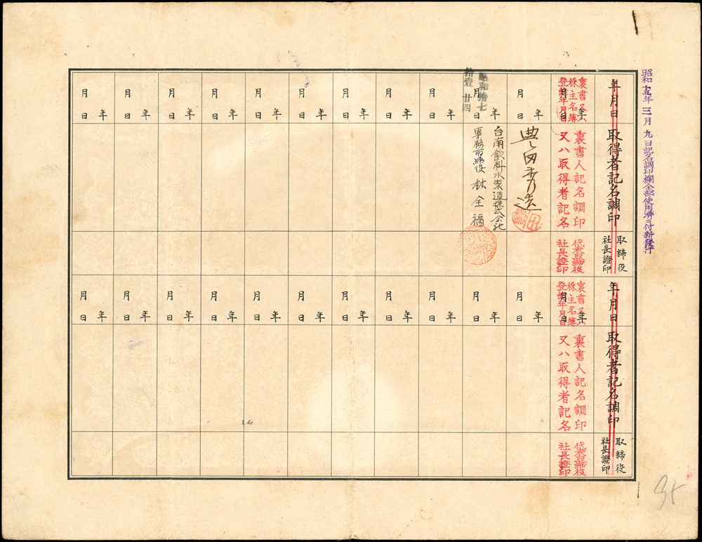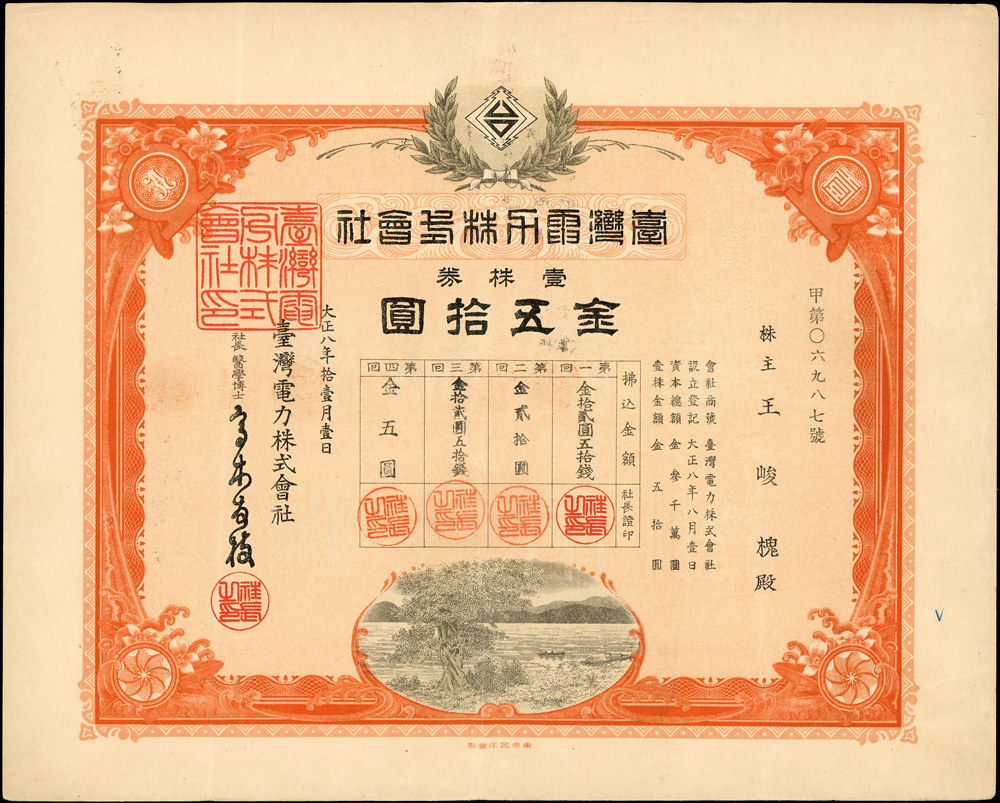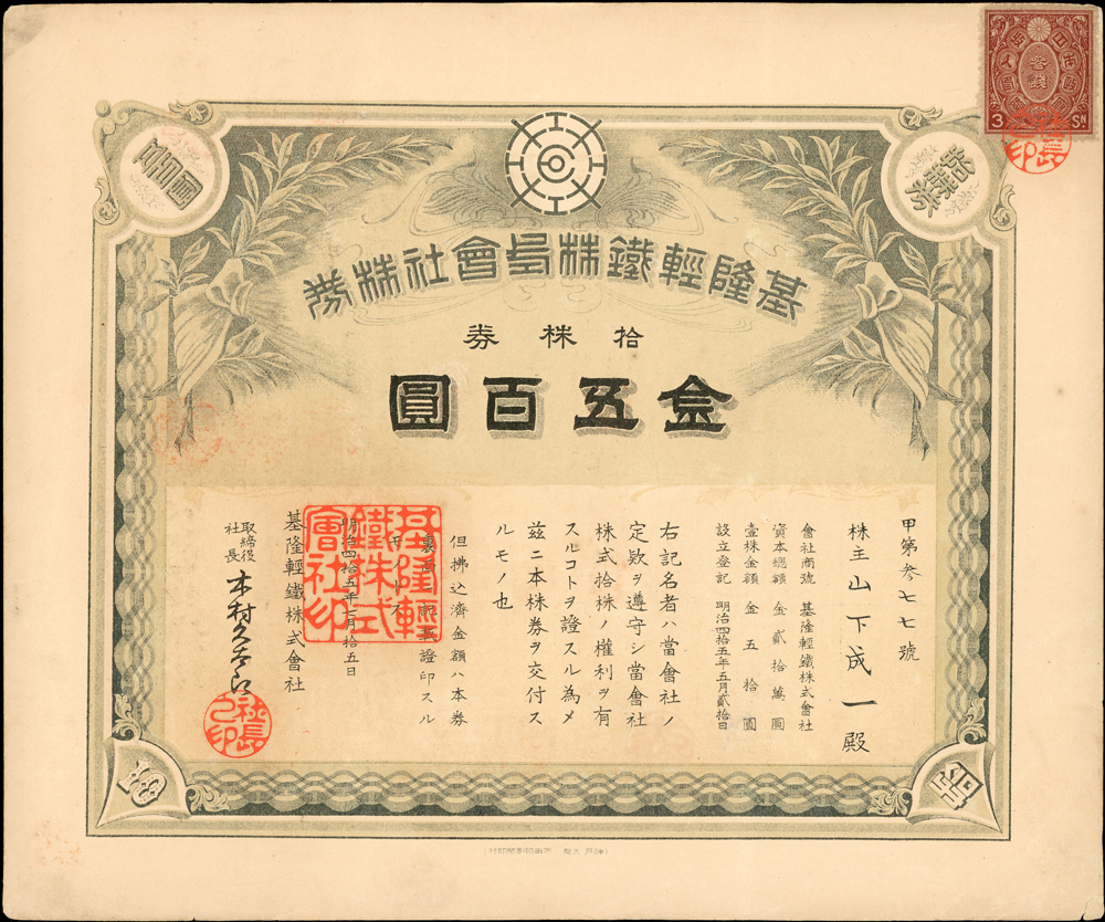 日治時期股票三張:(1)明治45年(1912年)基隆輕鐵株式會社株券-金五百圓(24.5*20.3cm),已使用,正面右上角貼日本收入印紙3錢1枚銷印,右下角尖損,85新 註:基隆輕鐵株式會社簡稱基隆輕鐵,是臺灣日治時期於北臺灣經營輕便鐵道的公司,創立於1912年4月,主要經營路線為三爪子線、金瓜石線、金山線;(2)大正8年(1919年)臺灣電力株式會社株券-金五拾圓(25.8*20.7cm),已使用,三摺痕,85新;(3)大正6年(1917年)淺野水泥株式會社株券-金五百圓(26.2*20.3cm),已使用,四摺痕,80新 註:淺野水泥株式會社於1917年開始生產,現為台灣水泥位在臺灣高雄市鼓山區壽山附近的廠房,1994年停產(Page 79)