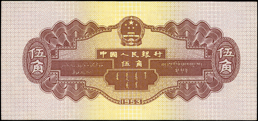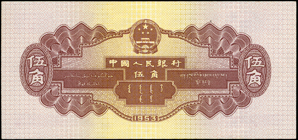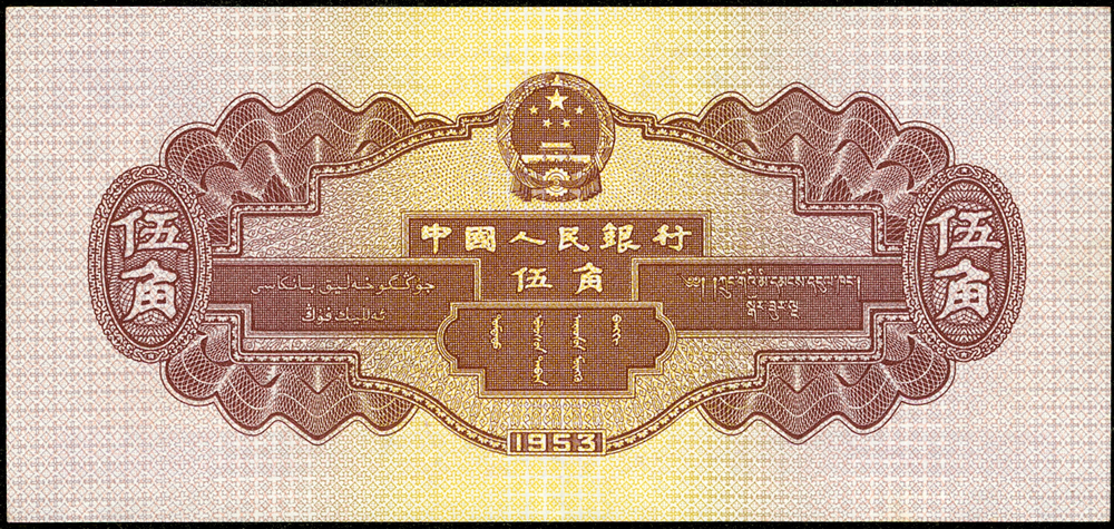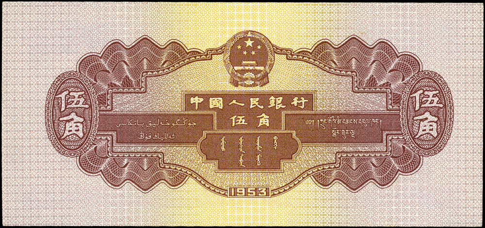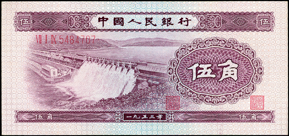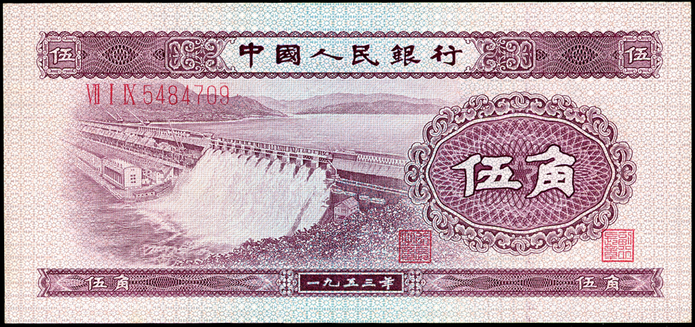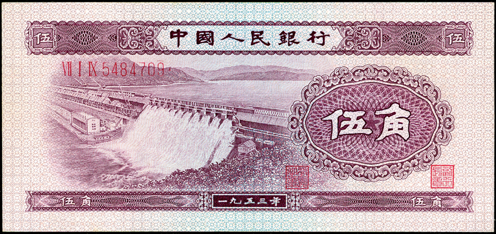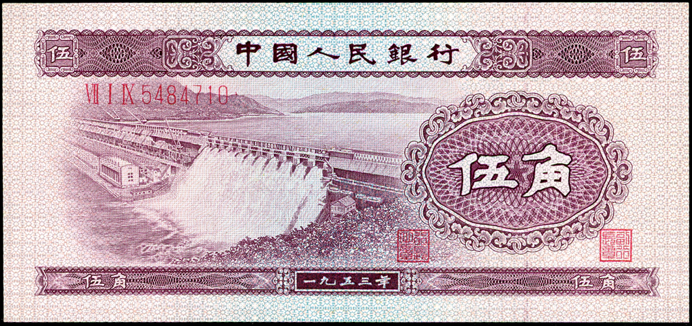 中國人民銀行二版人民幣1953年5角水電站,星水印,連號4枚(5484707~5484710),其中二枚同號:5484709,漏5484708,99-全新 註:日本資深藏家『山崎 修之亮』藏品,2000年著作『百年一遇』書中第30頁原件(Page 80)