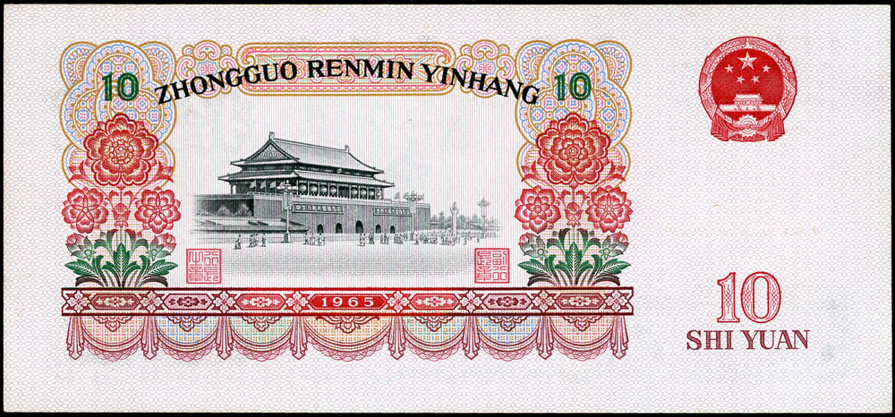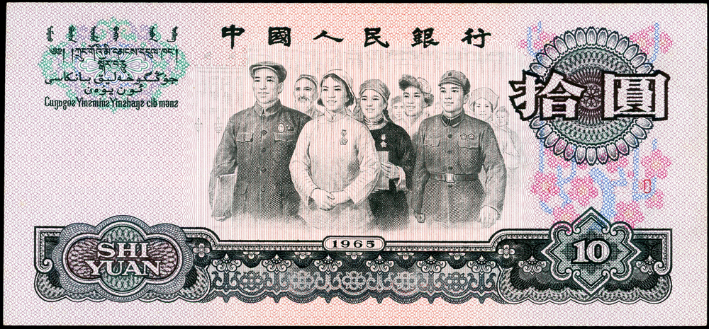 中國人民銀行三版人民幣1965年10元人民代表步出大會堂,正面右側冠字號碼『ⅤⅥ20113600』弱打,僅見末碼數字『0』,其餘幾乎看不見,沒有人為刮除痕跡,少,97新 註:日本資深藏家『山崎 修之亮』藏品(Page 81)