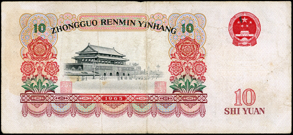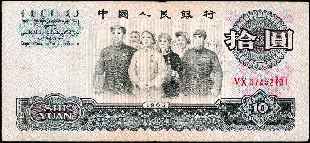 中國人民銀行三版人民幣1965年10元人民代表步出大會堂,二軌(VX),正面右側冠字號碼濃墨,末三碼數字『101』上方黏印沾染油墨似複蓋,三折,80新 註:日本資深藏家『山崎 修之亮』藏品(Page 81)
