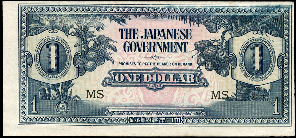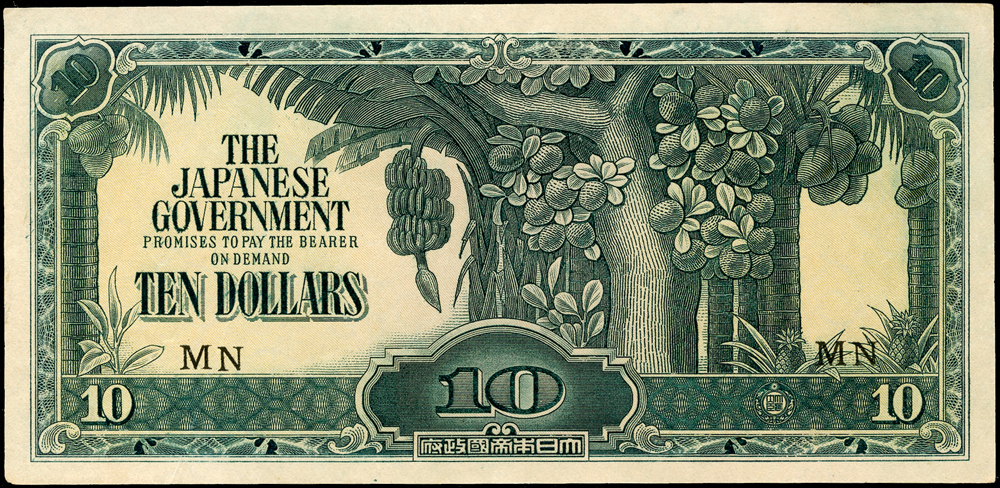 (1942年)日本昭和17年大東亞戰爭-馬來地區(軍15B)10元軍票,背面色淡;另(軍15D)1元軍票,正背面往右上.左上大移位;共2枚,90-95新 註:日本資深藏家『山崎 修之亮』藏品(Page 85)