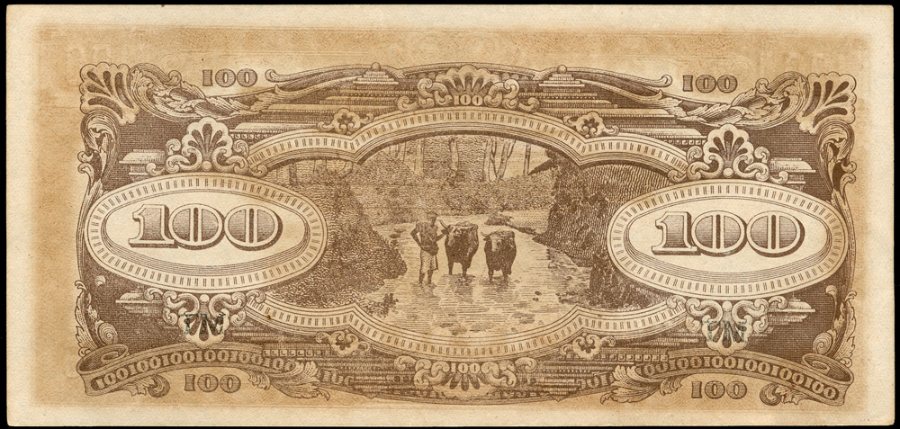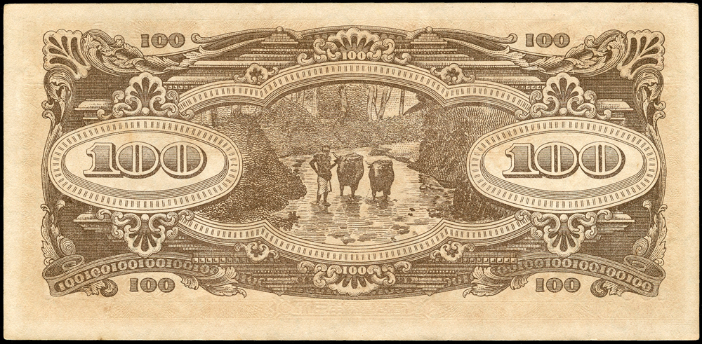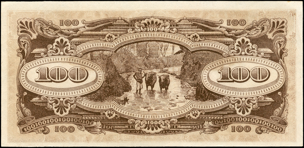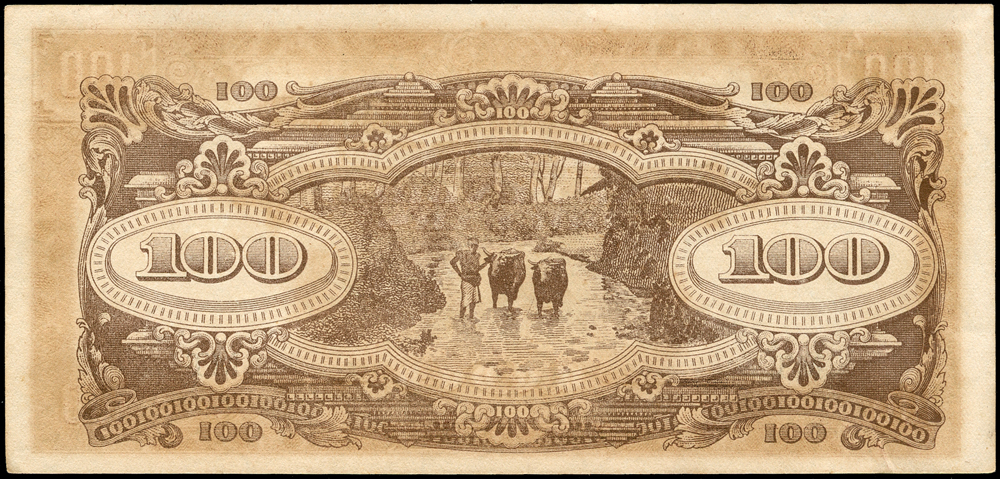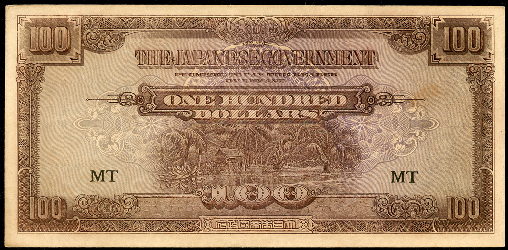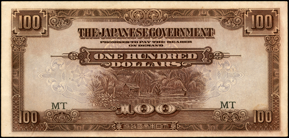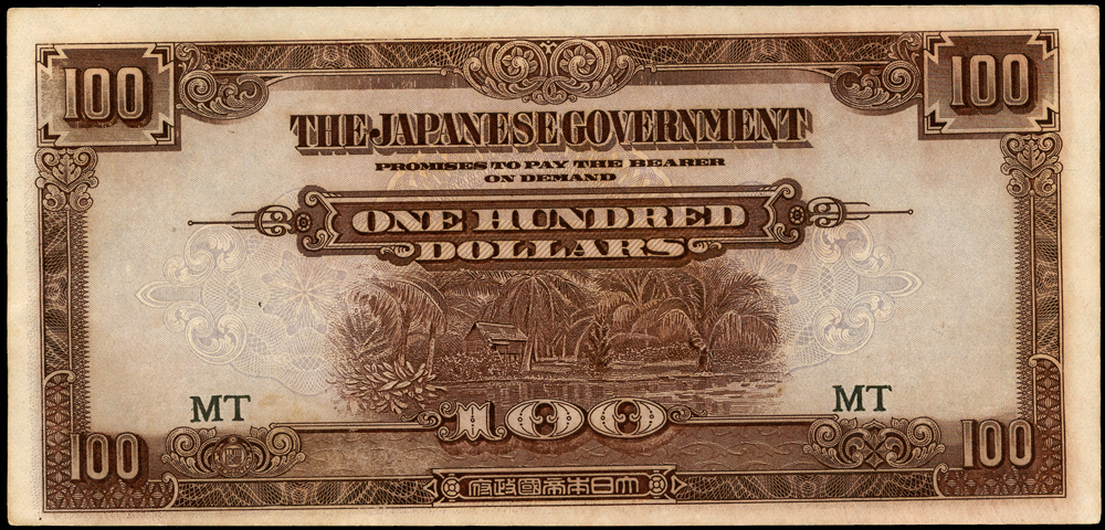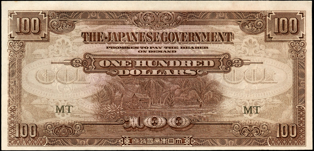 (1942年)日本昭和17年大東亞戰爭-馬來地區(軍15A)100元軍票3枚,1枚正面透印背面圖,2枚背面圖下移位致左側.頂邊寬邊白,97新;附正常票比對 註:日本資深藏家『山崎 修之亮』藏品(Page 86)