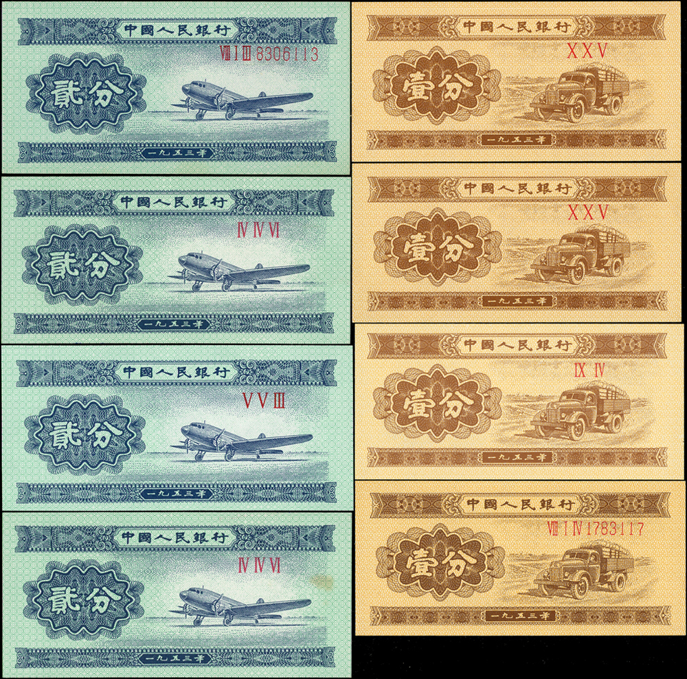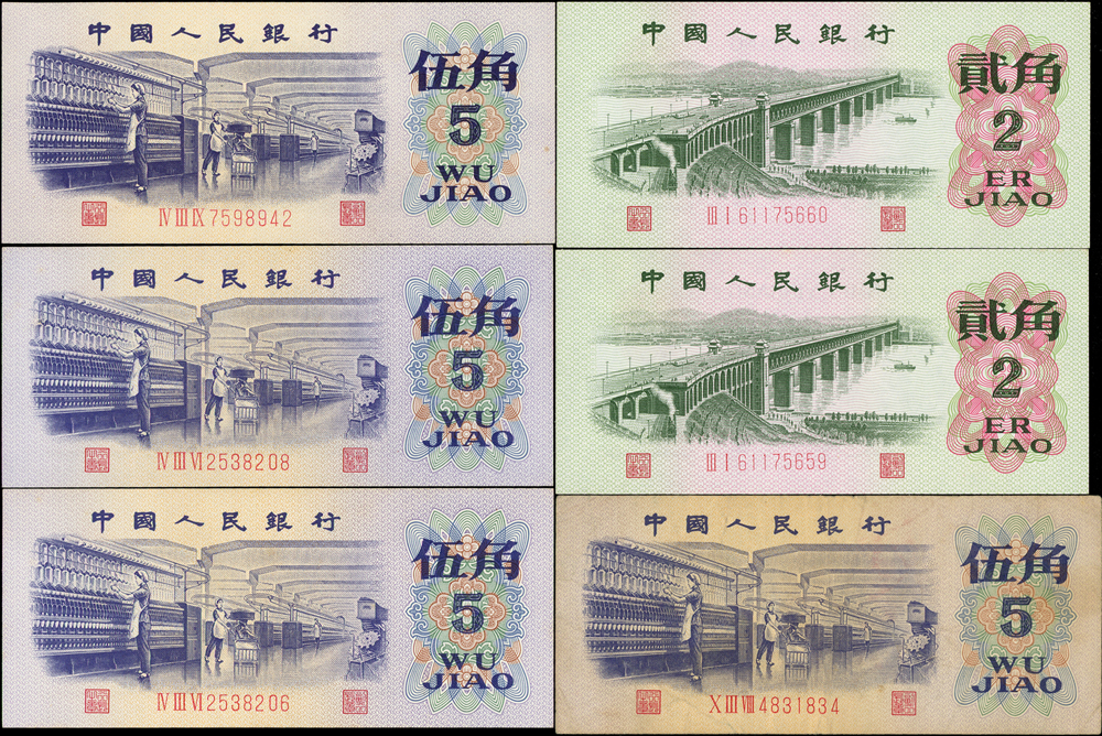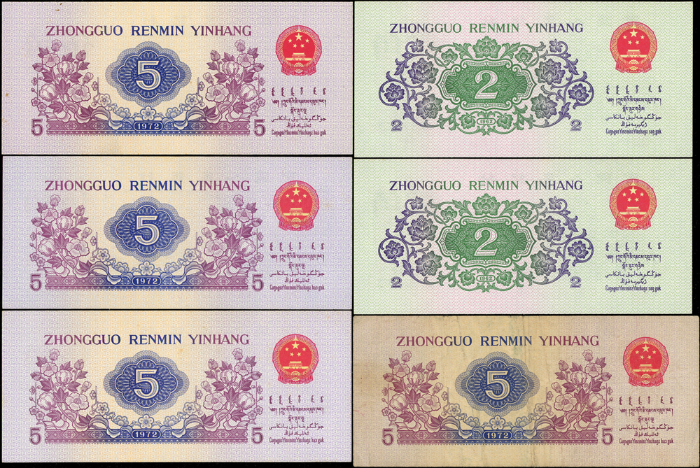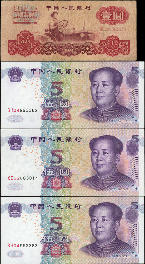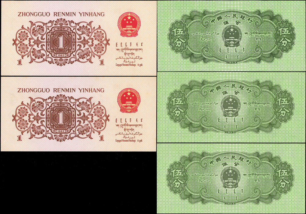 各版人民幣:(1)二版1953年1分.2分.5分無號碼各3枚,97-全新;贈人為加工有號1分.2分各1枚;(2)三版1962年1角教師與勞動生產圖,藍三軌背紫2枚連號,98新;2角長江大橋2枚連號,98新;1972年5角紡織4枚,其中1枚污黃70新,其餘98新;(3)三版1960年1元女拖拉機手1枚,1965年10元人民代表步出大會堂4枚,65-75新;(4)五版2005年20元4枚,5元3枚,90-95新(Page 88)