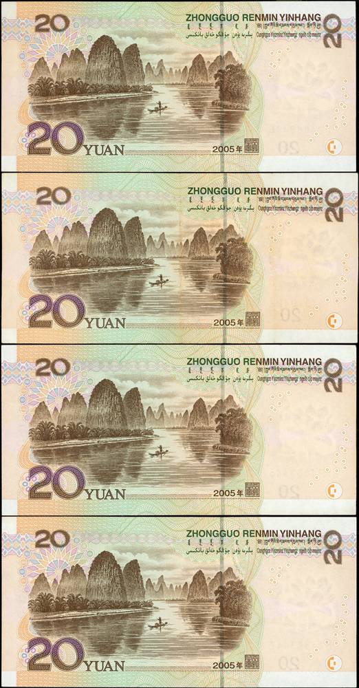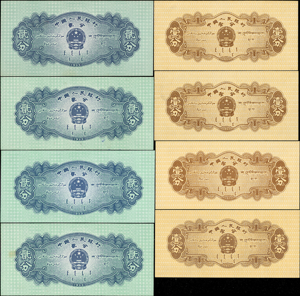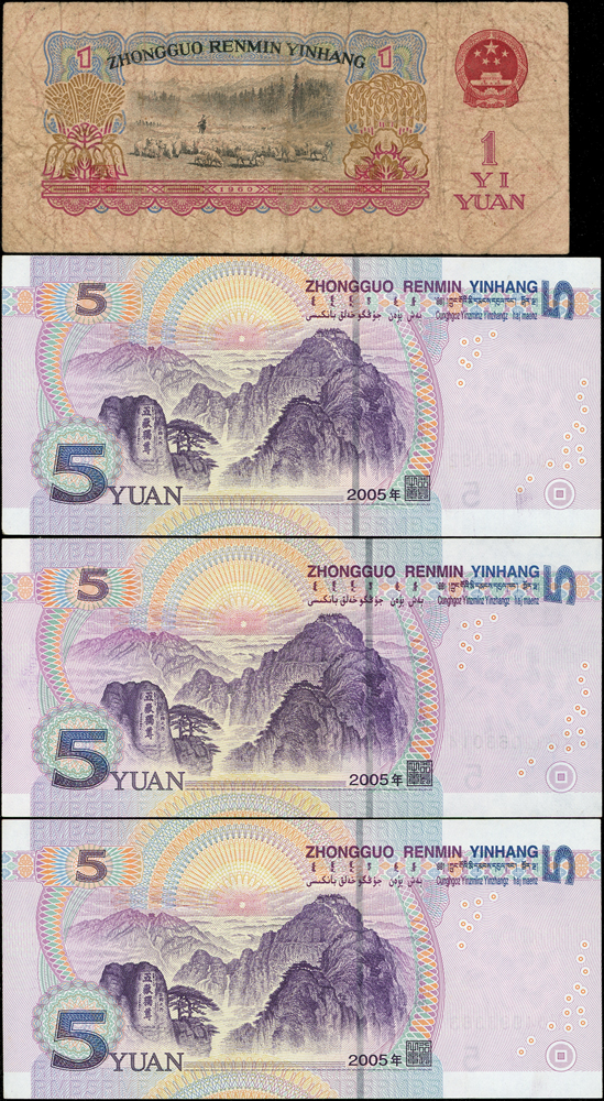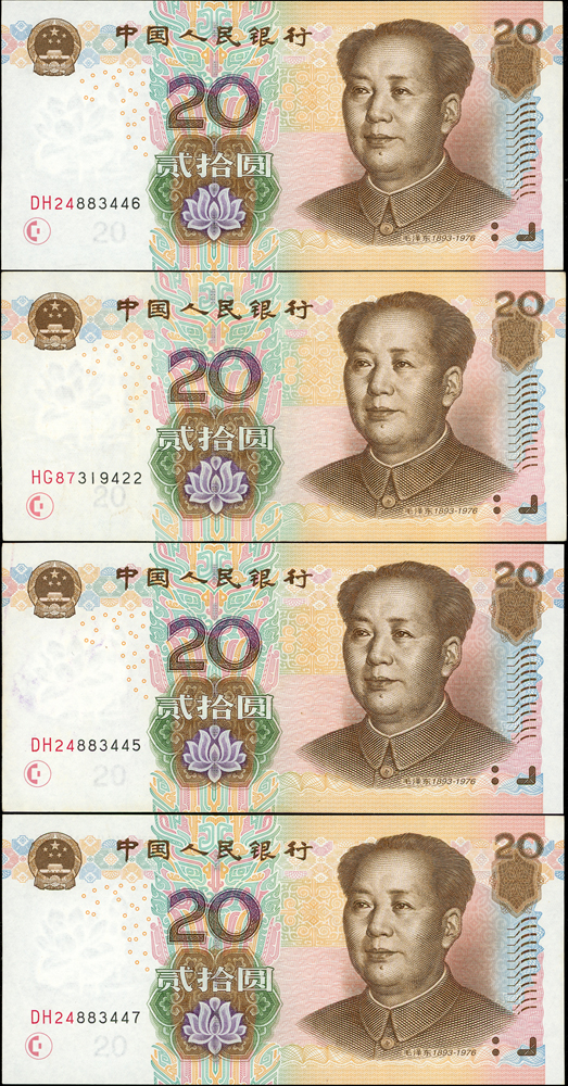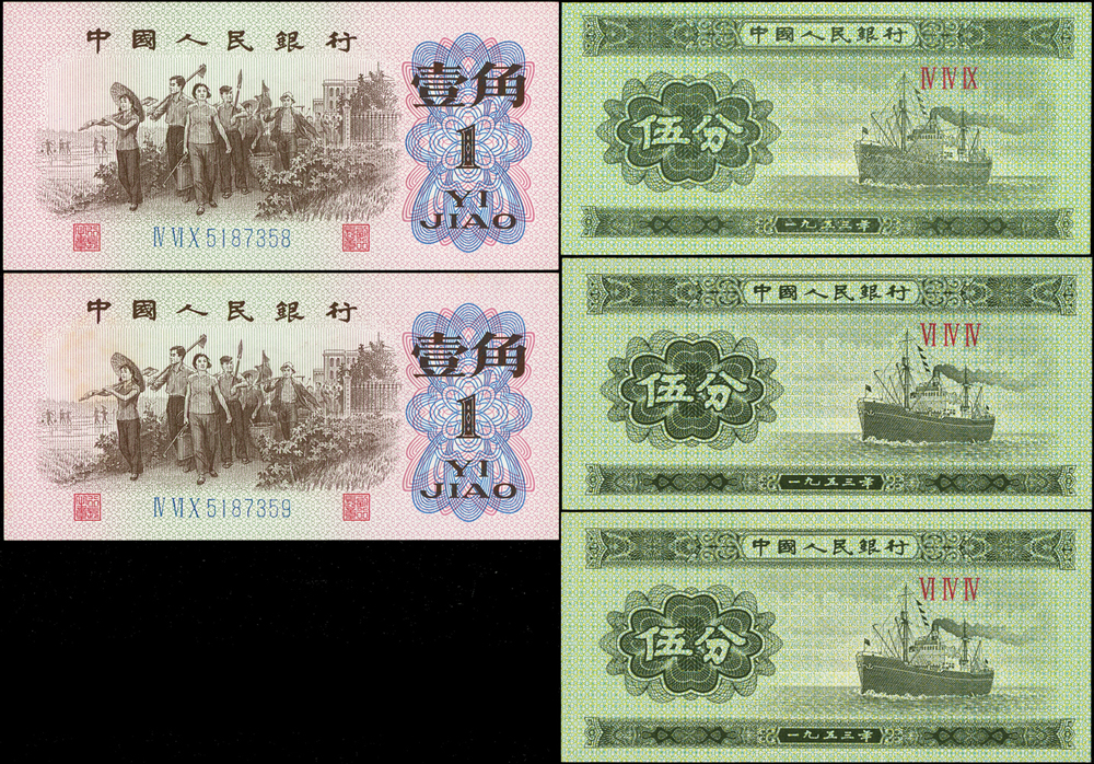 各版人民幣:(1)二版1953年1分.2分.5分無號碼各3枚,97-全新;贈人為加工有號1分.2分各1枚;(2)三版1962年1角教師與勞動生產圖,藍三軌背紫2枚連號,98新;2角長江大橋2枚連號,98新;1972年5角紡織4枚,其中1枚污黃70新,其餘98新;(3)三版1960年1元女拖拉機手1枚,1965年10元人民代表步出大會堂4枚,65-75新;(4)五版2005年20元4枚,5元3枚,90-95新(Page 88)