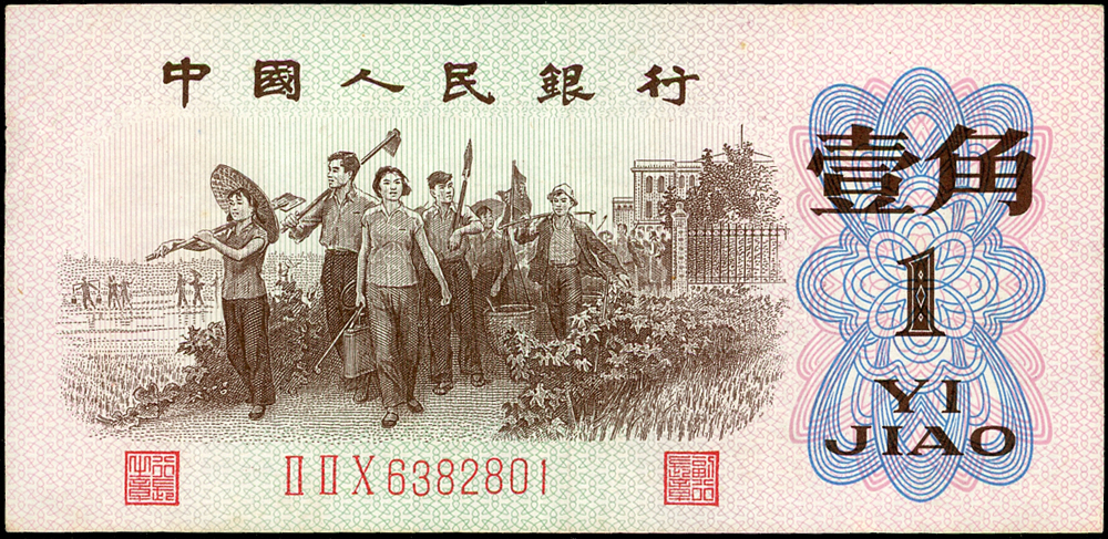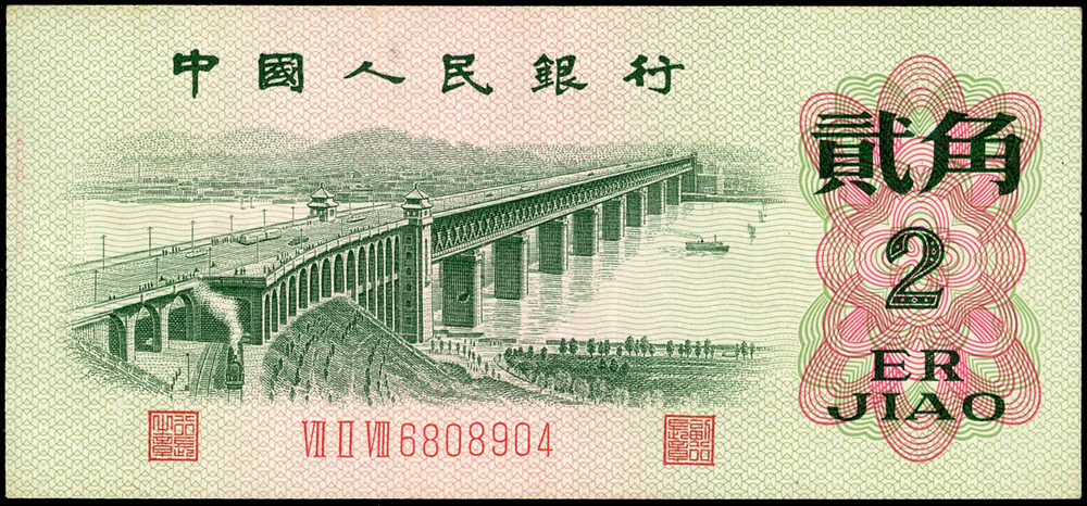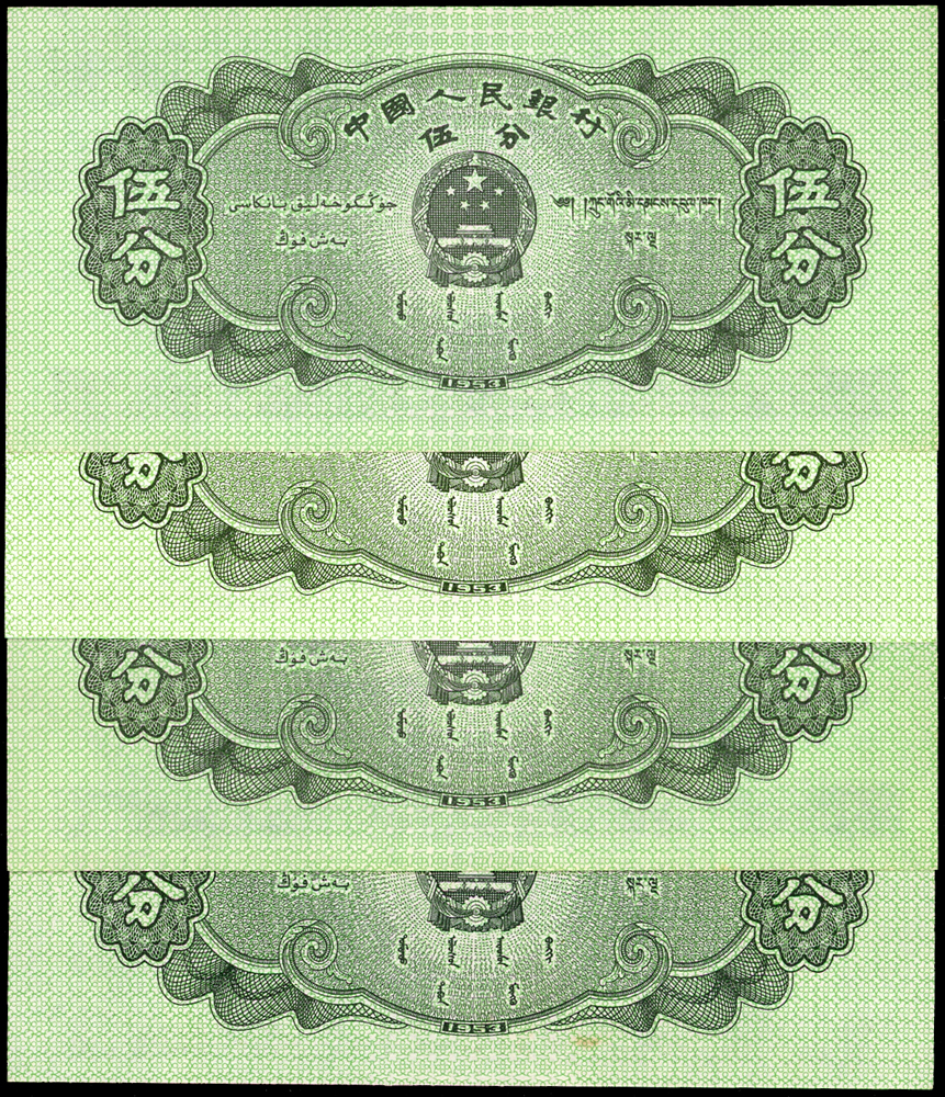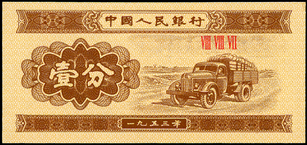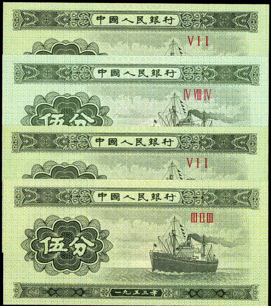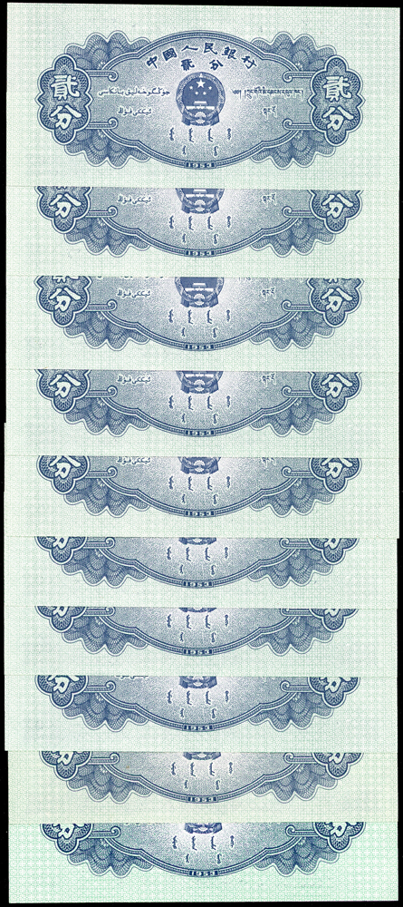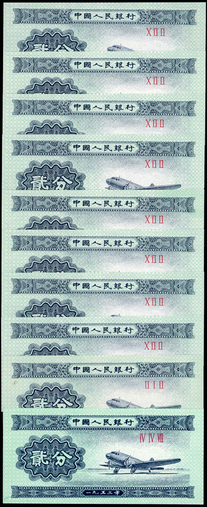 新中國鈔券26枚,包括:(1)二版人民幣1953年5分輪船4枚.2分飛機10枚.1分卡車1枚,均無號碼,90-99新;(2)三版人民幣1960年2元車工三軌,星水印及布圖星水印各1枚,數折,79-80新;(3)外匯兌換券1979年1角(AA).5角.1元各1枚,80-90新;(4)三版人民幣1962年2角長江大橋三軌1枚,1960年1元女拖拉機手星水印2枚,1962年1角教育與生產勞動相結合1枚;二版人民幣1953年5角水電站1枚;四版人民幣1990年2元1枚,多數摺痕,70-79新(Page 89)