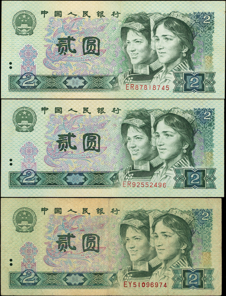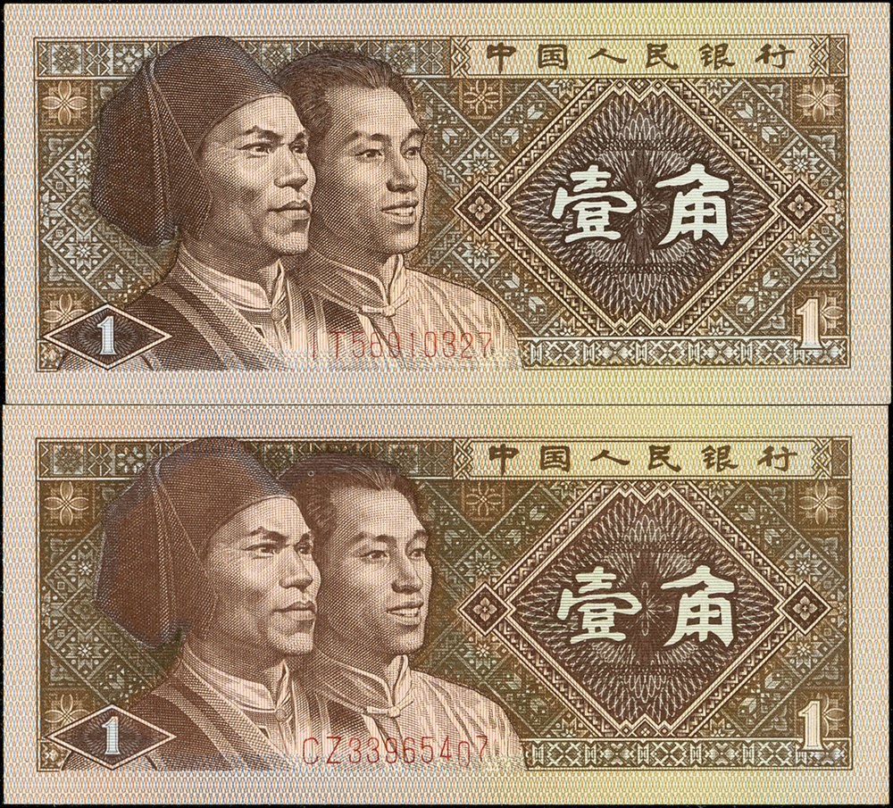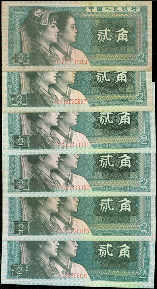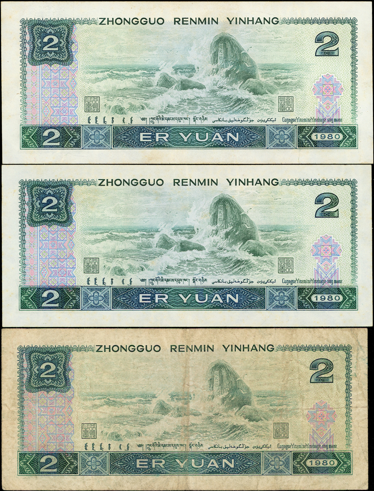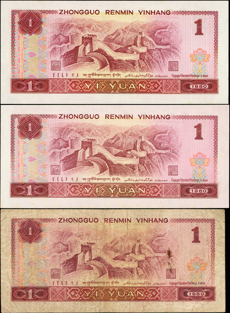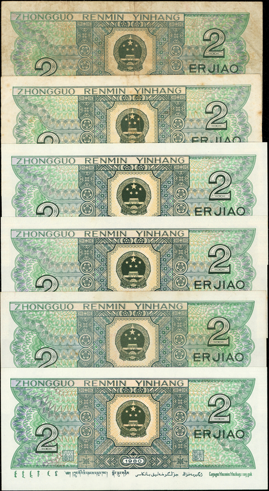 四版人民幣:(1)1980年1角2枚,全新;(2)1980年2角6枚,其中2枚70新,其餘99-全新;(3)1980年5角5枚,全新;(4)1980年1元3枚,其中1枚70新,其餘99-全新;(5)1980年2元3枚,其中1枚70新,其餘99新;(6)1980年5元1枚.10元2枚,95-99新;(7)1980年50元.100元各1枚,中折,88-90新(Page 89)