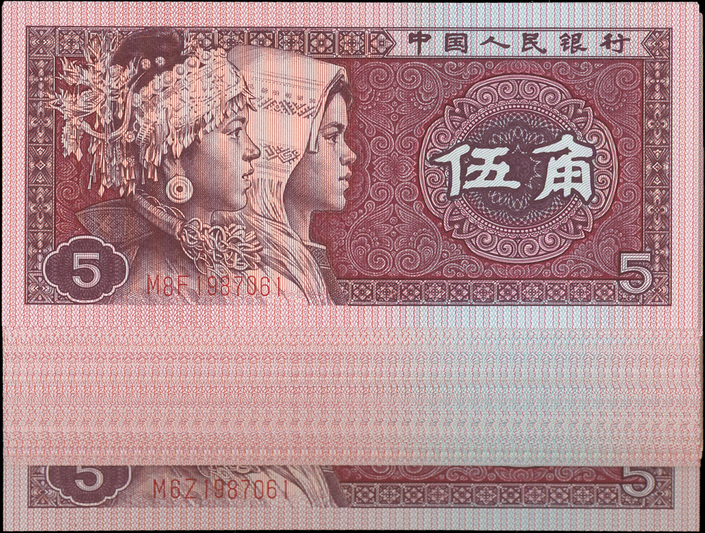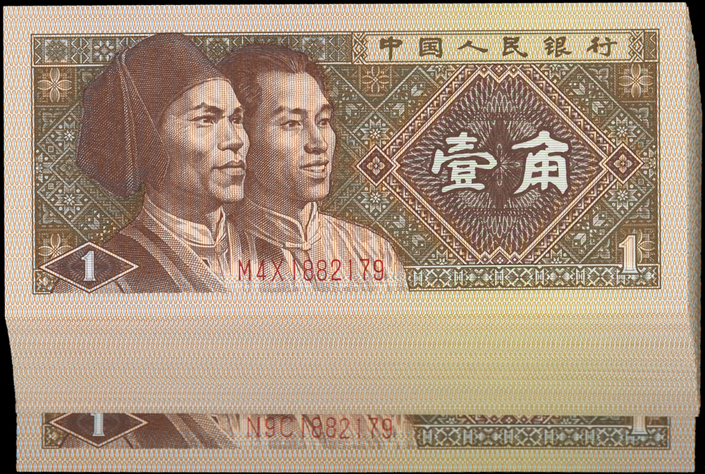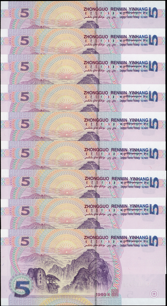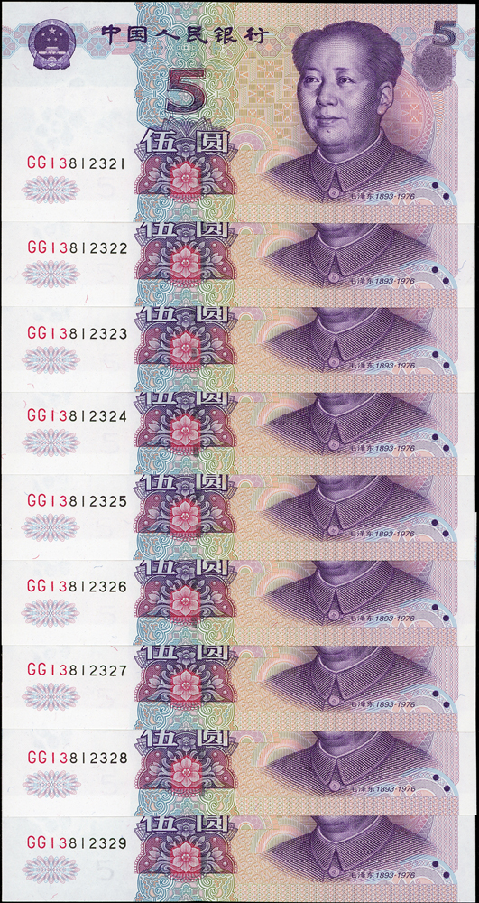中國人民銀行人民幣券,包括:(1)四版1980年1角100枚不同軌同號:1882179,全新;(2)四版1980年5角100枚不同軌同號:1987061,全新;(3)五版1999年1元100枚不同軌同號:111476,全新;(4)五版1999年5元GG字軌9枚連號,全新(Page 90)