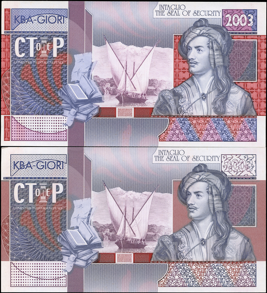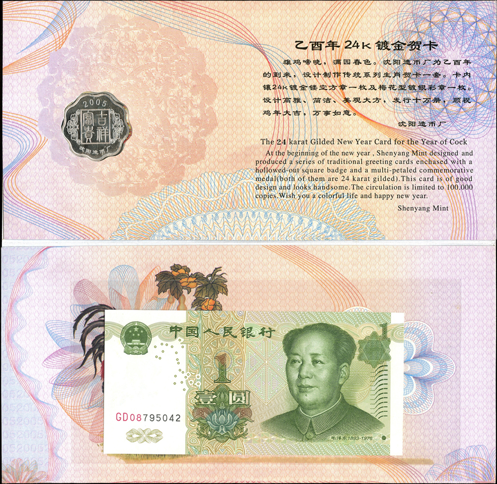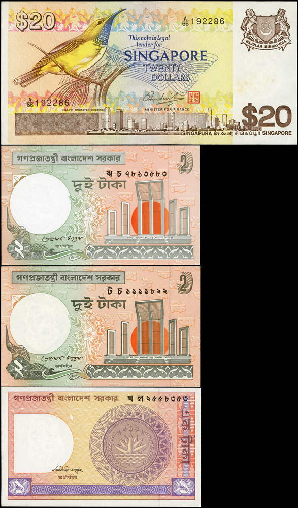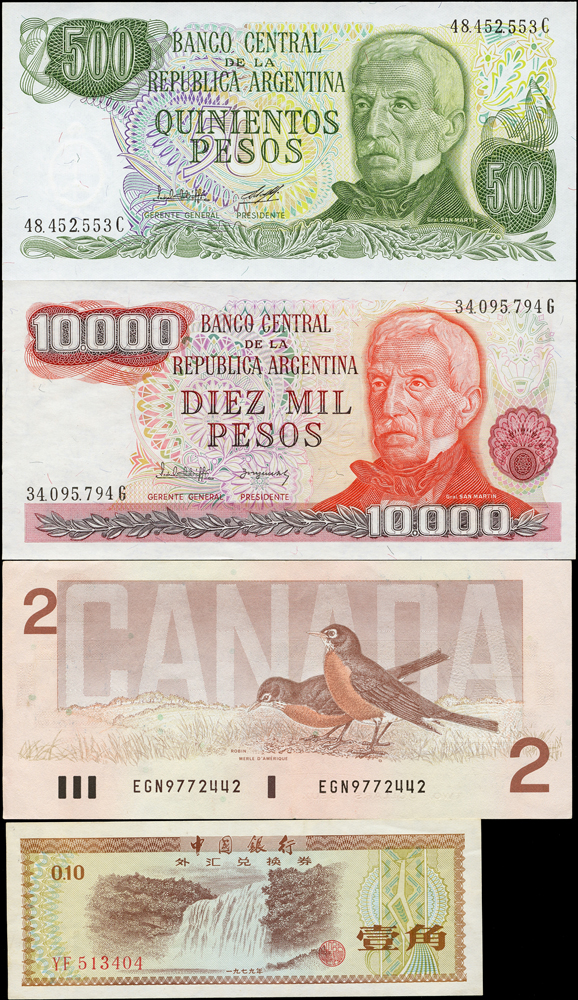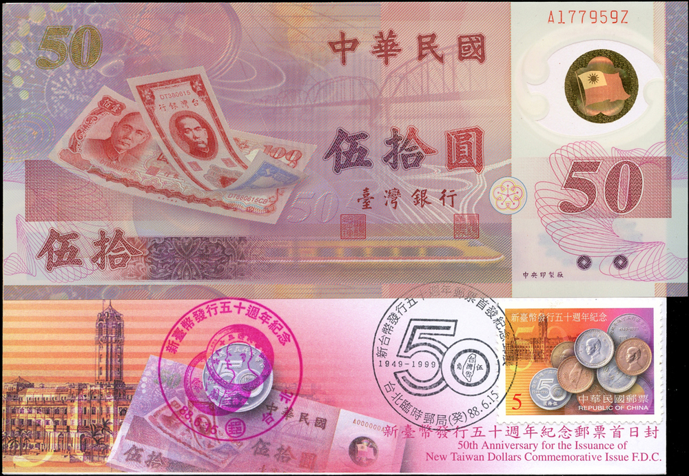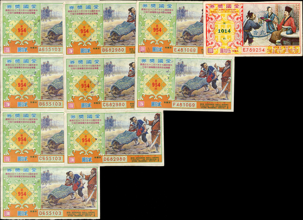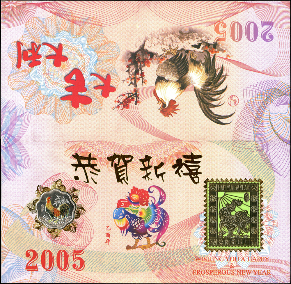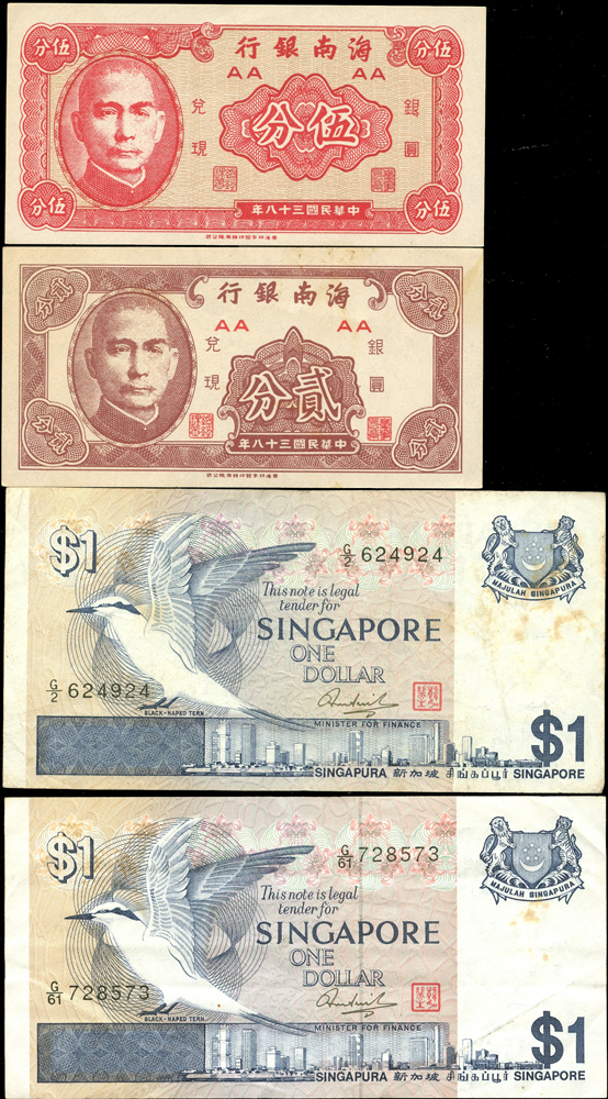 各國鈔券.紀念章:(1)國外鈔票16枚,包括:海南銀行民國38年2分.5分各1枚,新加坡鳥系列1元2枚.20元1枚,加拿大1986年2元,中國銀行外匯兌換券1979年1角,阿根廷500及1萬披索各1枚,孟加拉1.10.12塔卡各1枚.2及5塔卡各2枚,除新加坡中折約80新外,其餘95-全新;(2)2005年瀋陽造幣廠製乙酉雞紀念章,原封卡裝幀,內有第5版人民幣1元1枚,金箔票1枚;(3)美國印刷局-吉利錢護卡,內有美元鈔票1元1枚,號碼前四碼均為『8』,98新;(4)2009年澳洲郵政200週年紀念首日封,鑲嵌紀念銅章1枚;(5)2009年高雄郵局製高雄世運王建民代言紀念銅質彩色鍍金章,原封套裝幀;(6)2005年上海造幣廠雞年紀念章禮品卡;(7)台灣1999年新台幣發行50周年紀念首日封,貼50元塑膠鈔及5元郵票各1枚銷紀戳;(8)2003年電腦凹版印刷測試券2枚;(9)愛國獎券第954期9枚,第1014期1枚,80新